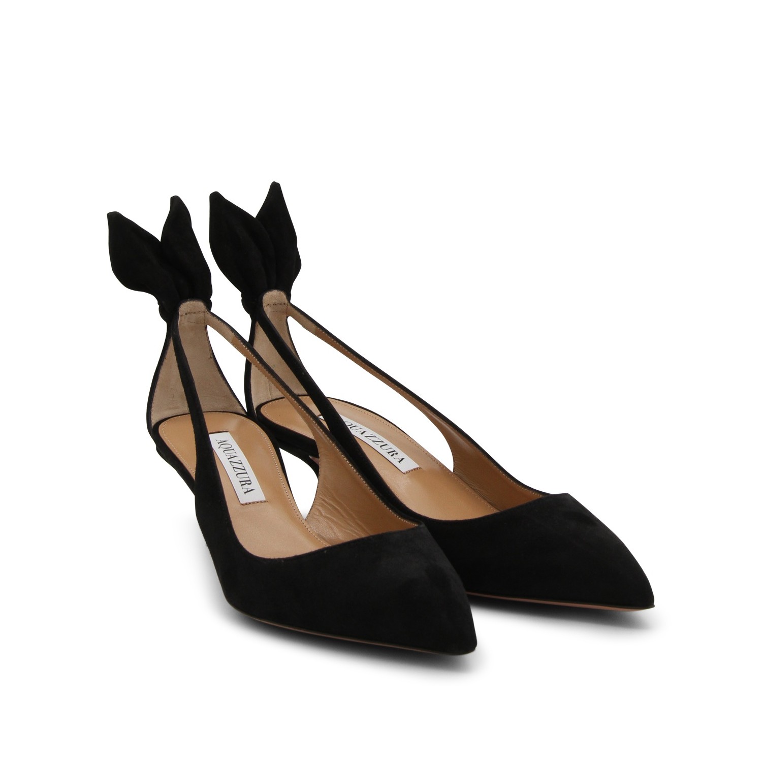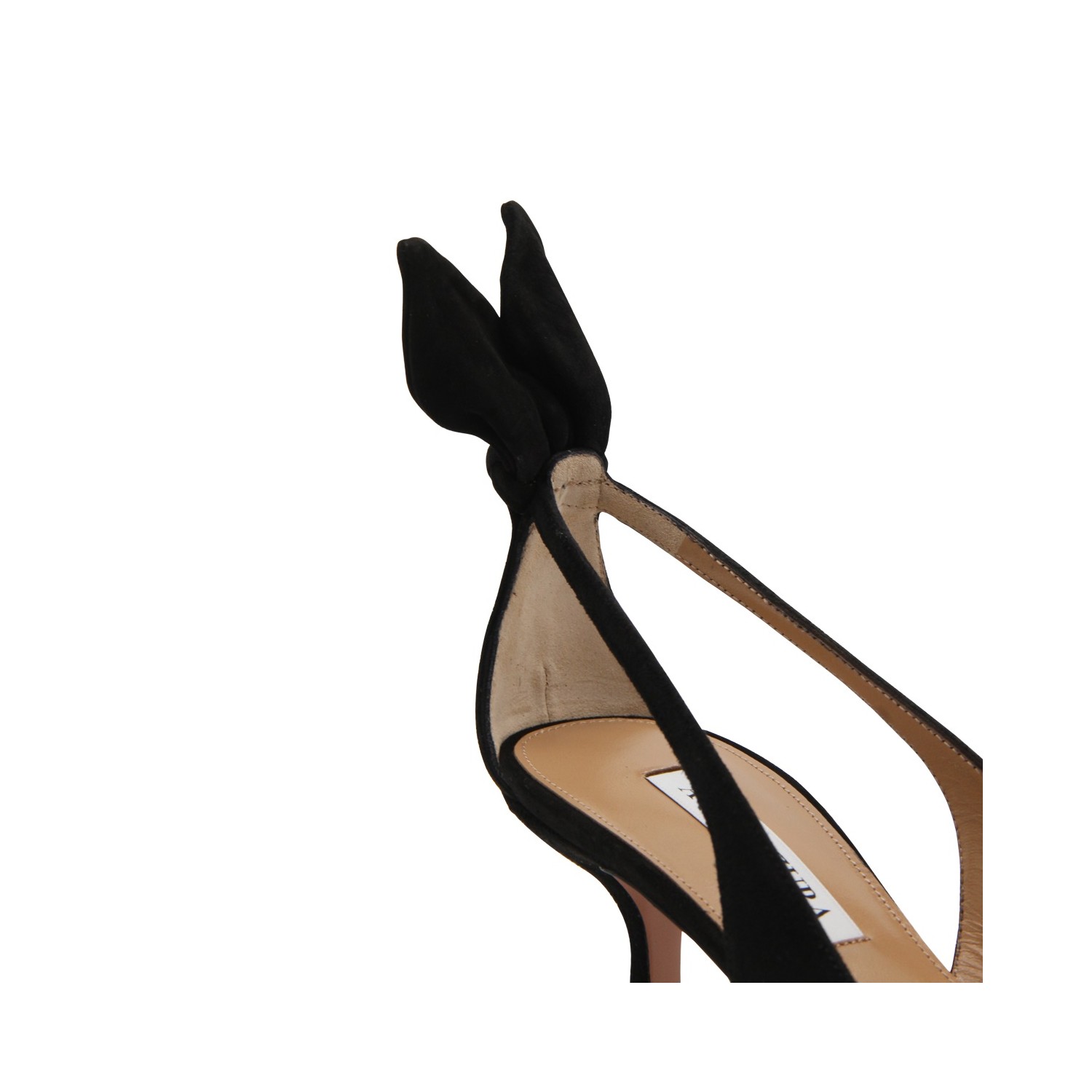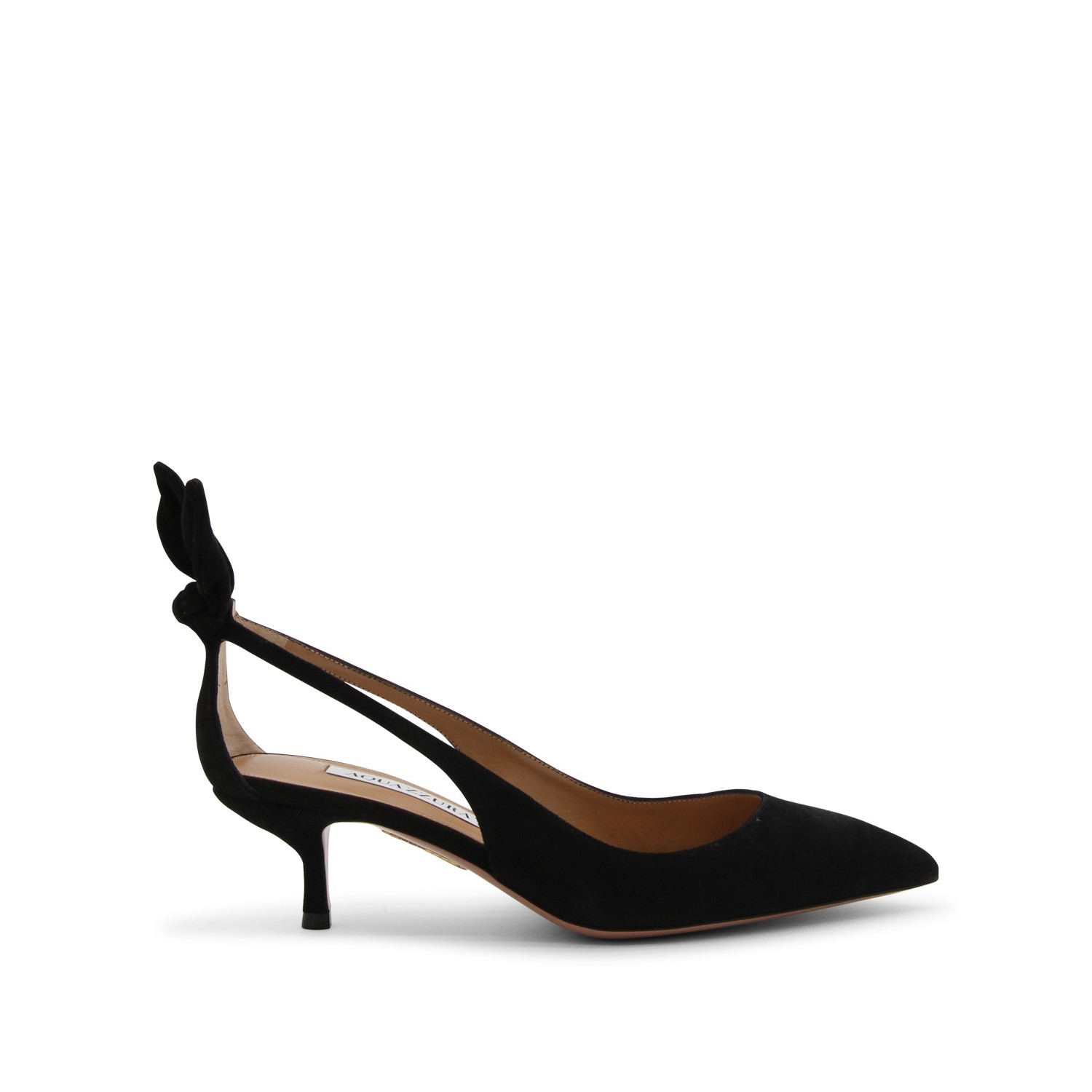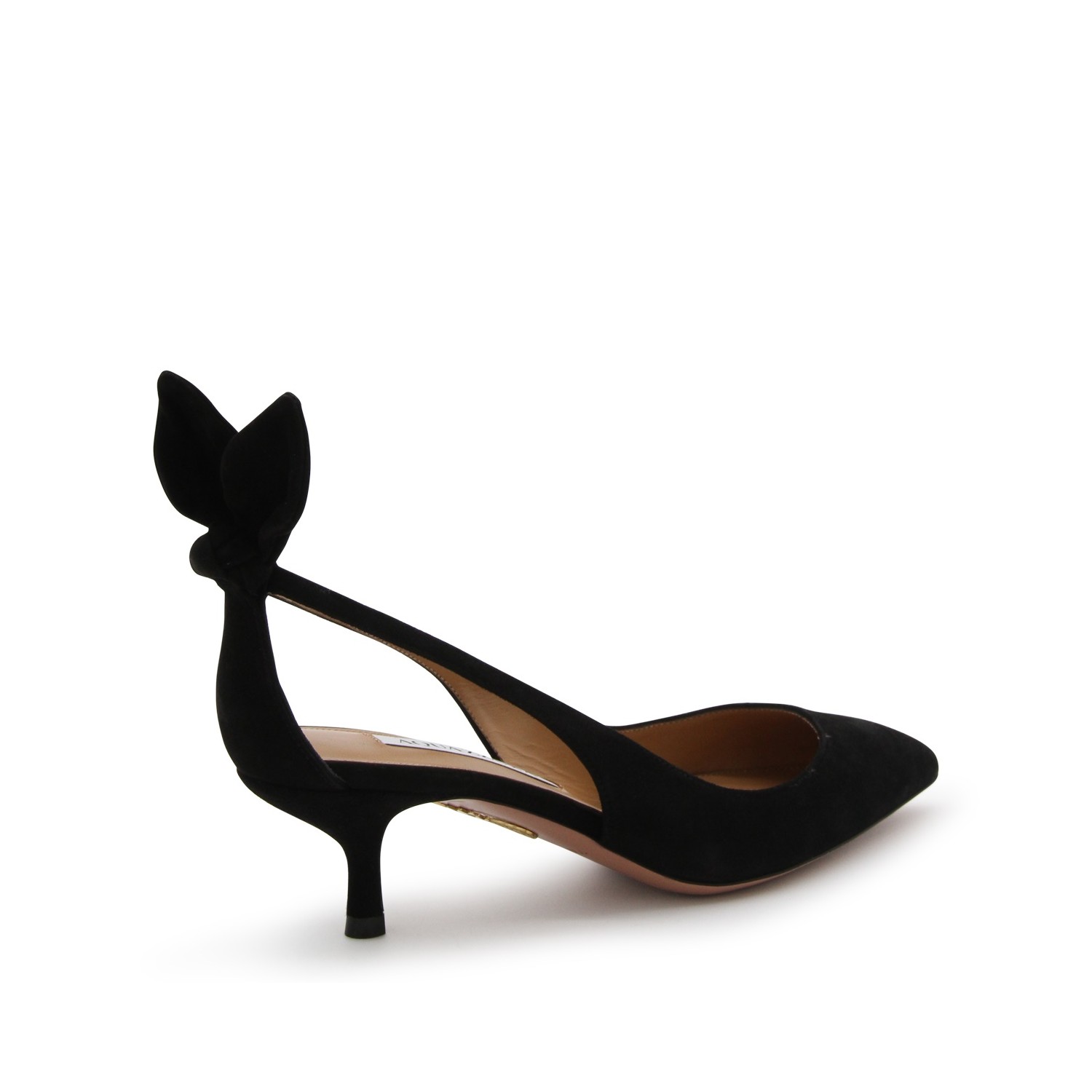 Black suede Bow Tie sandals from Aquazzura featuring almond toe, kitten heel, bow tie detail at back and branded insole.