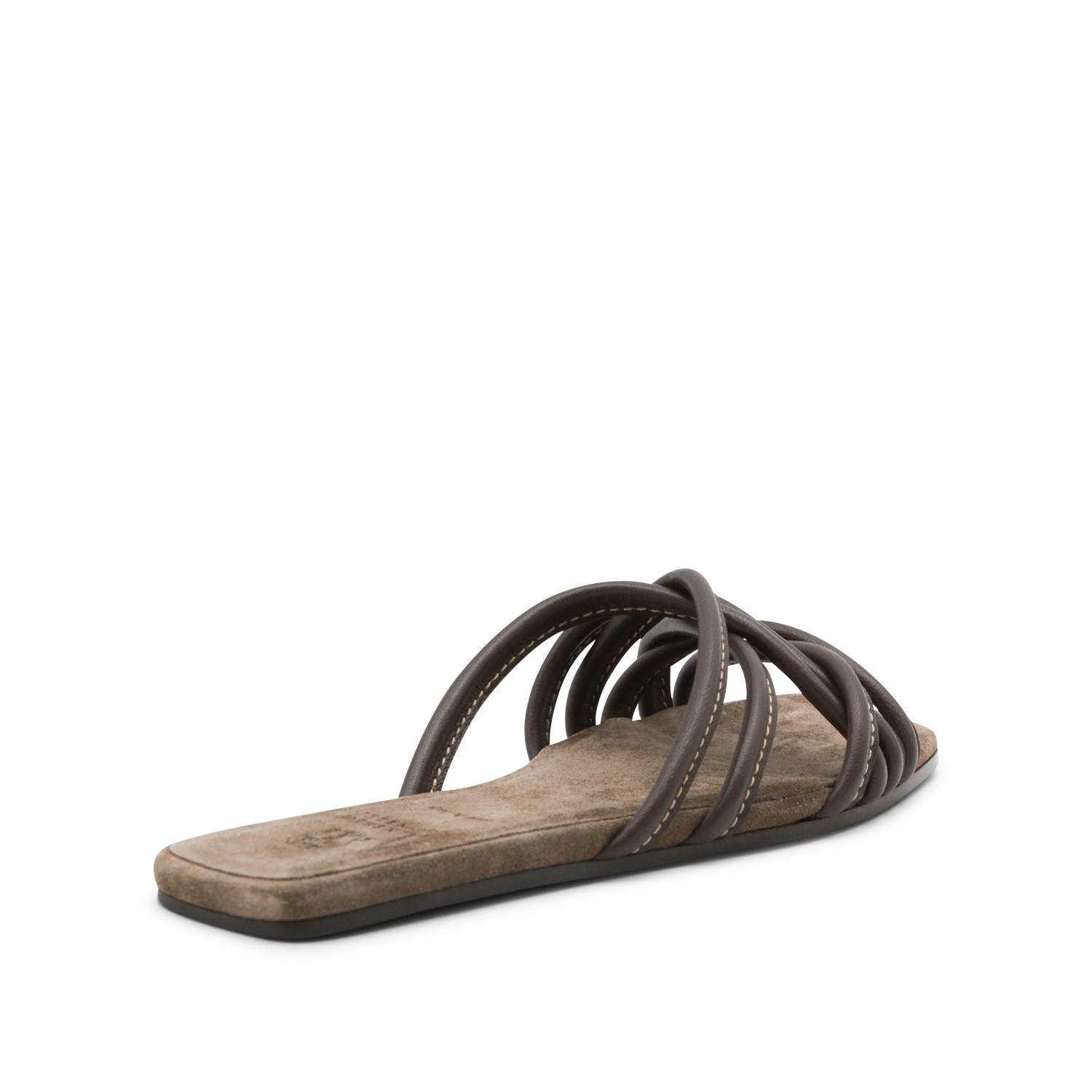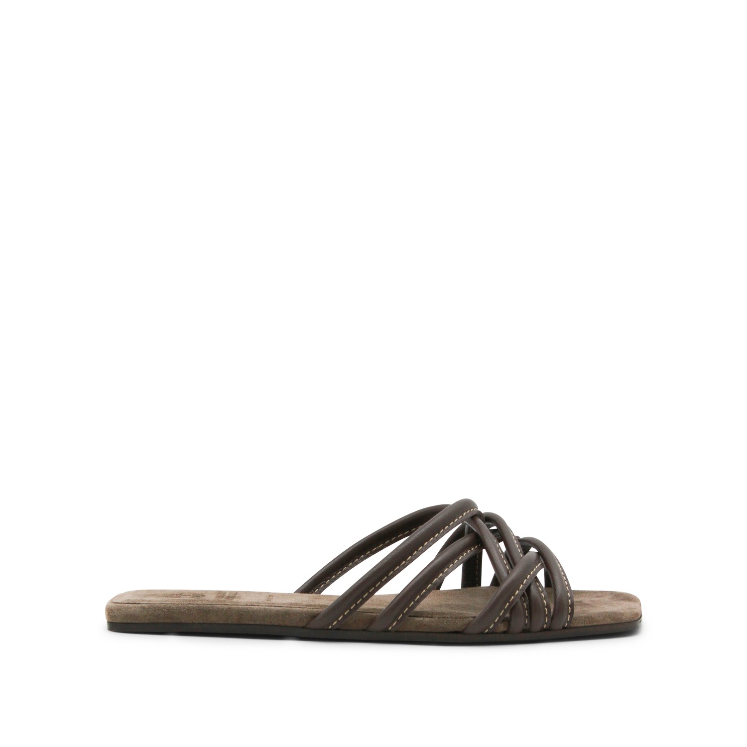 Brown leather sandals from Brunello Cucinelli featuring open toe, open back, slip-on style, crossed leather straps, branded insole and flat rubber sole.