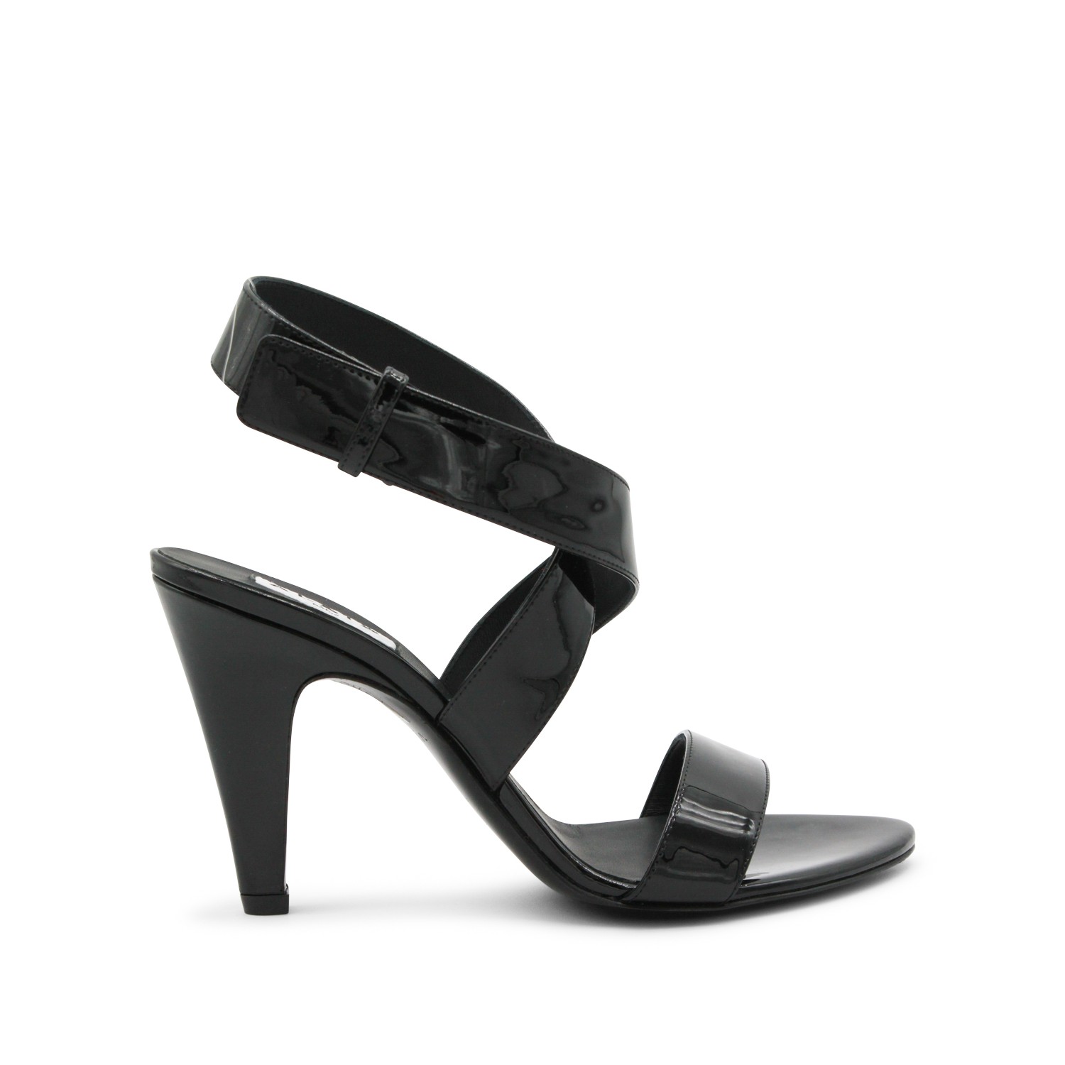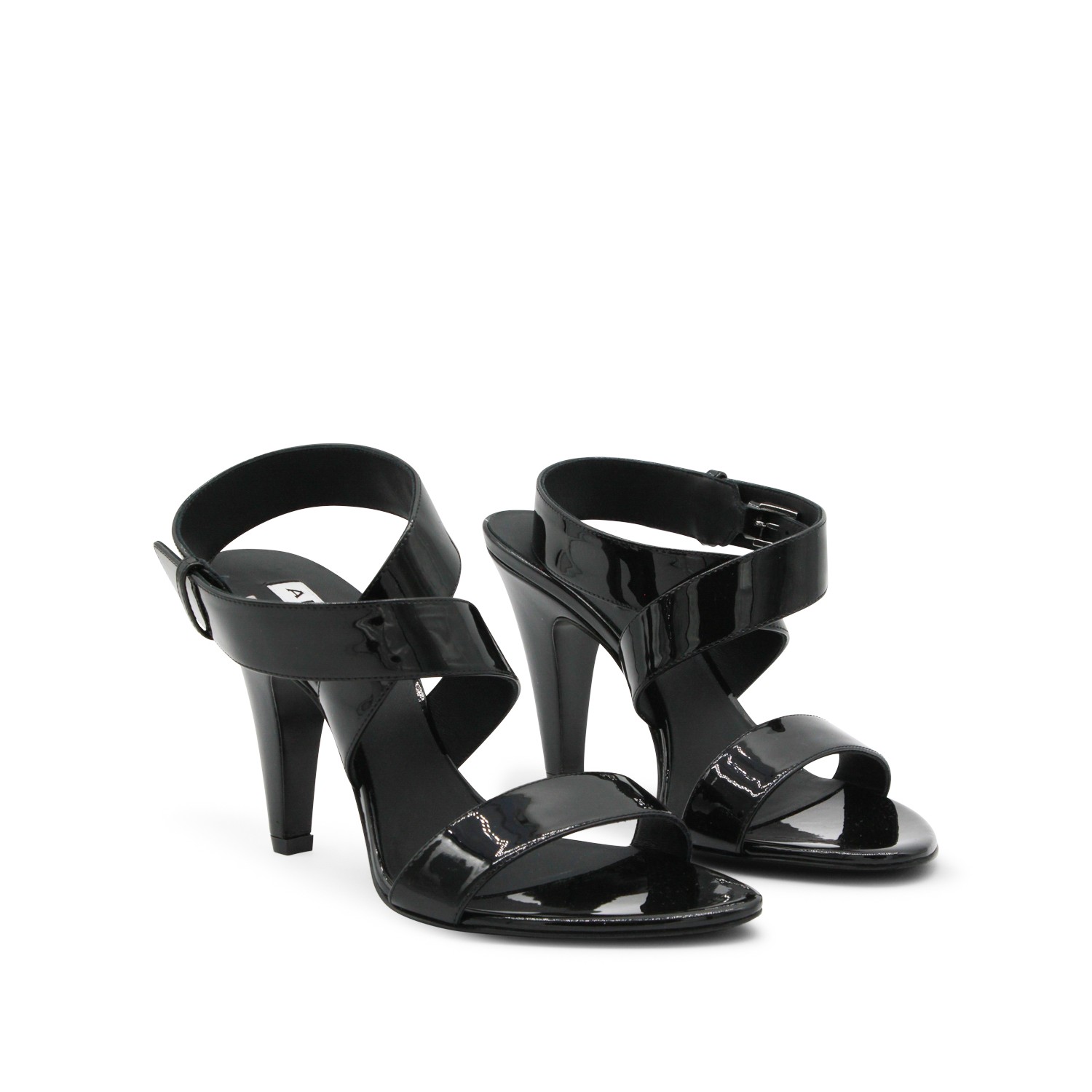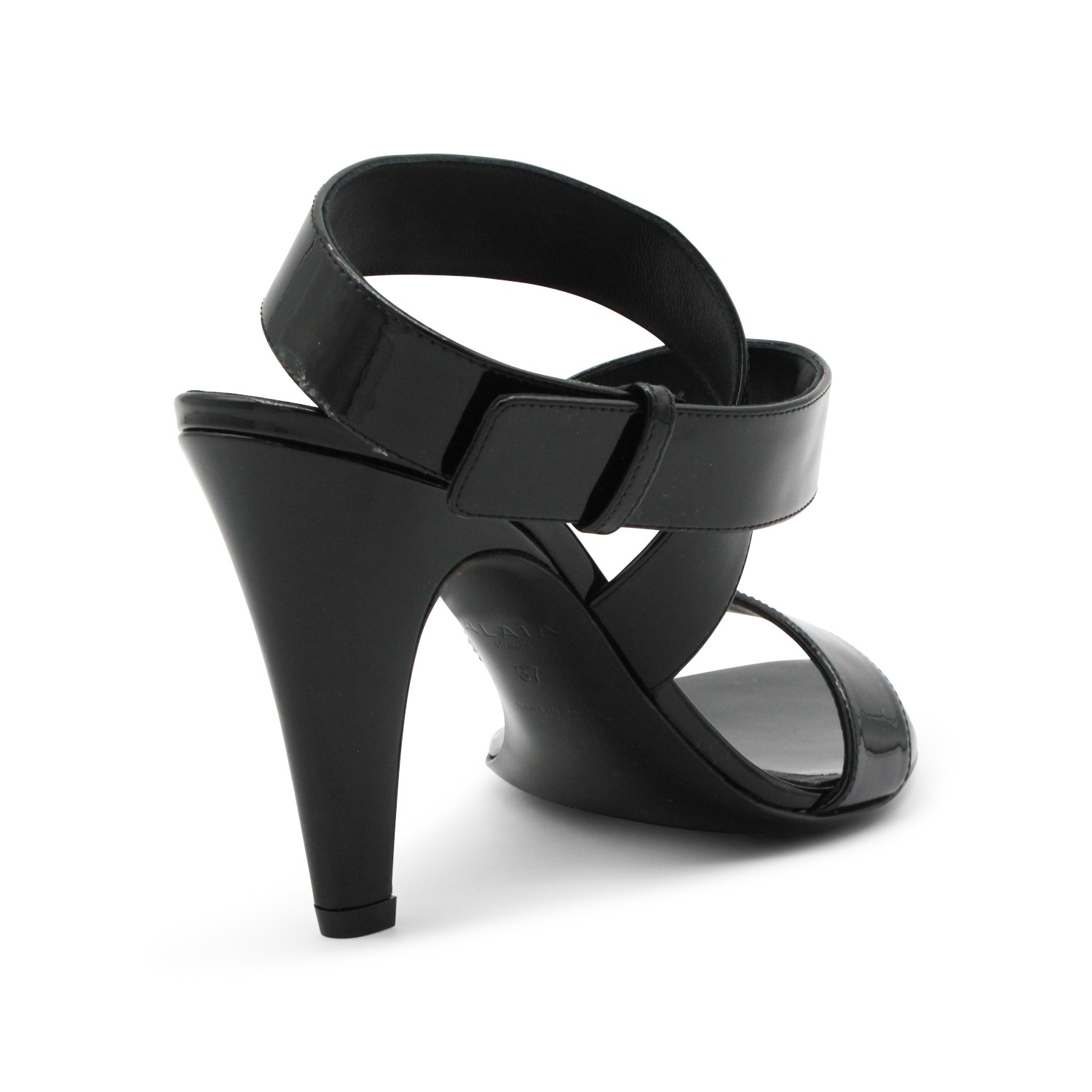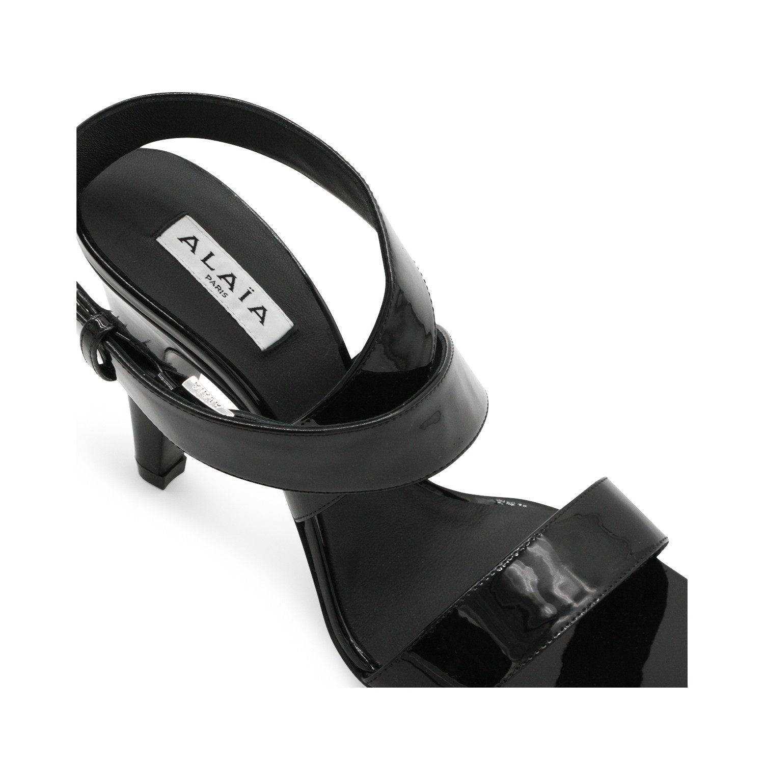 Black leather sandals from Alaia featuring open round toe, crossed ankle strap, buckle fastening and midi heel.