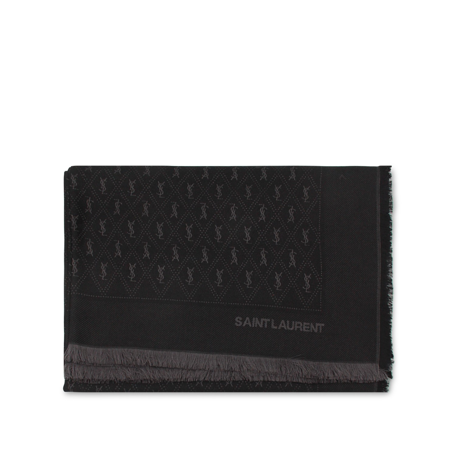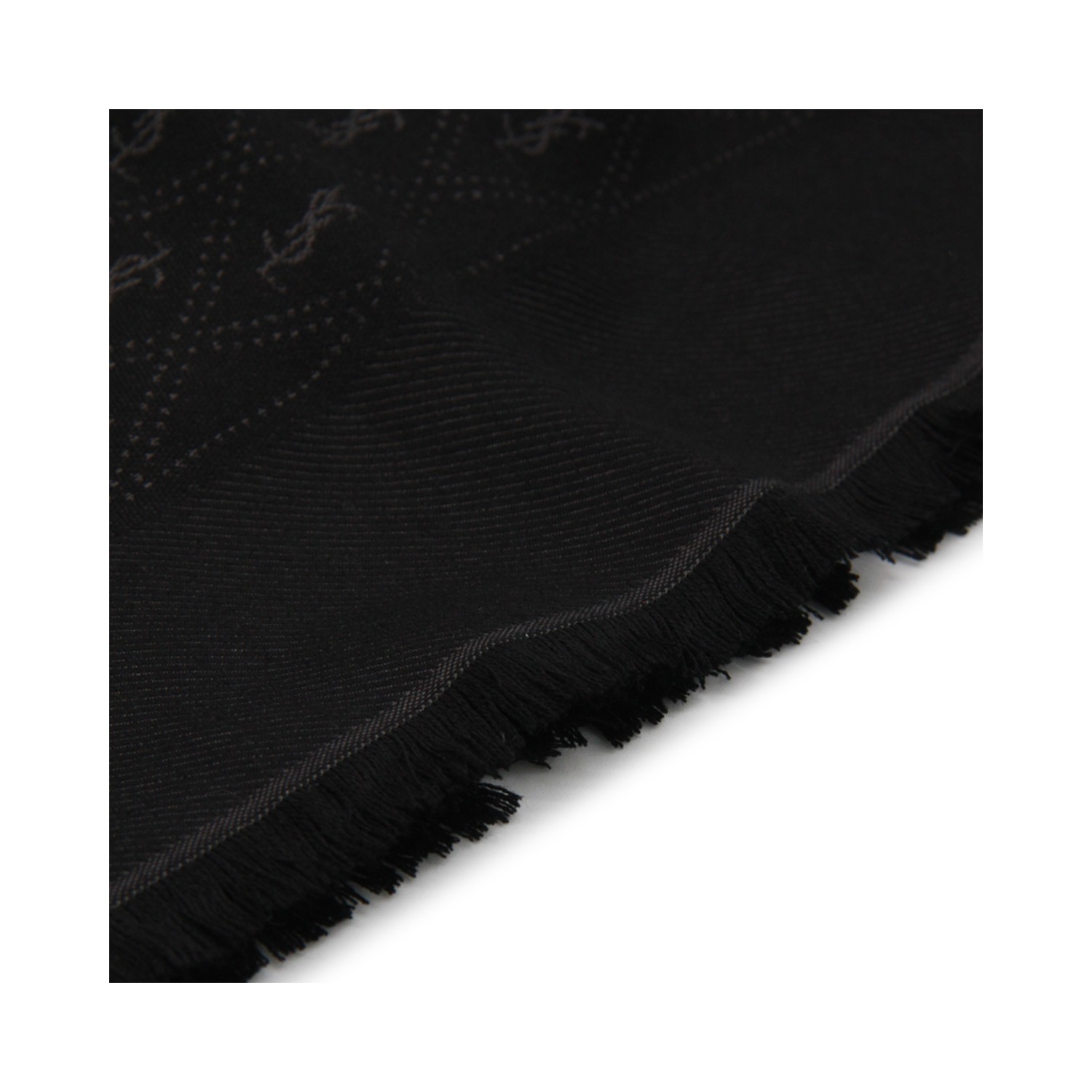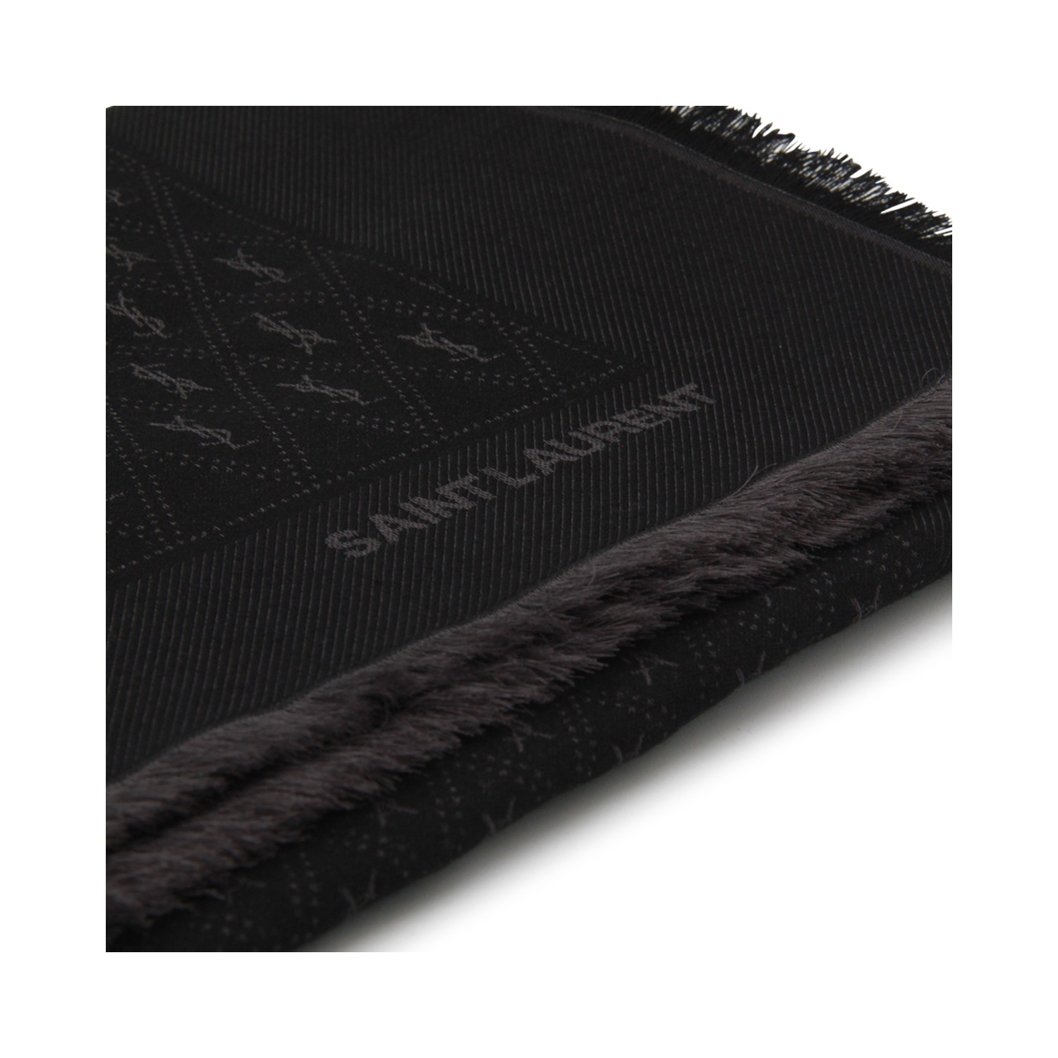 Black wool scarf from Saint Laurent featuring YSL pattern, wool and fringed hem.