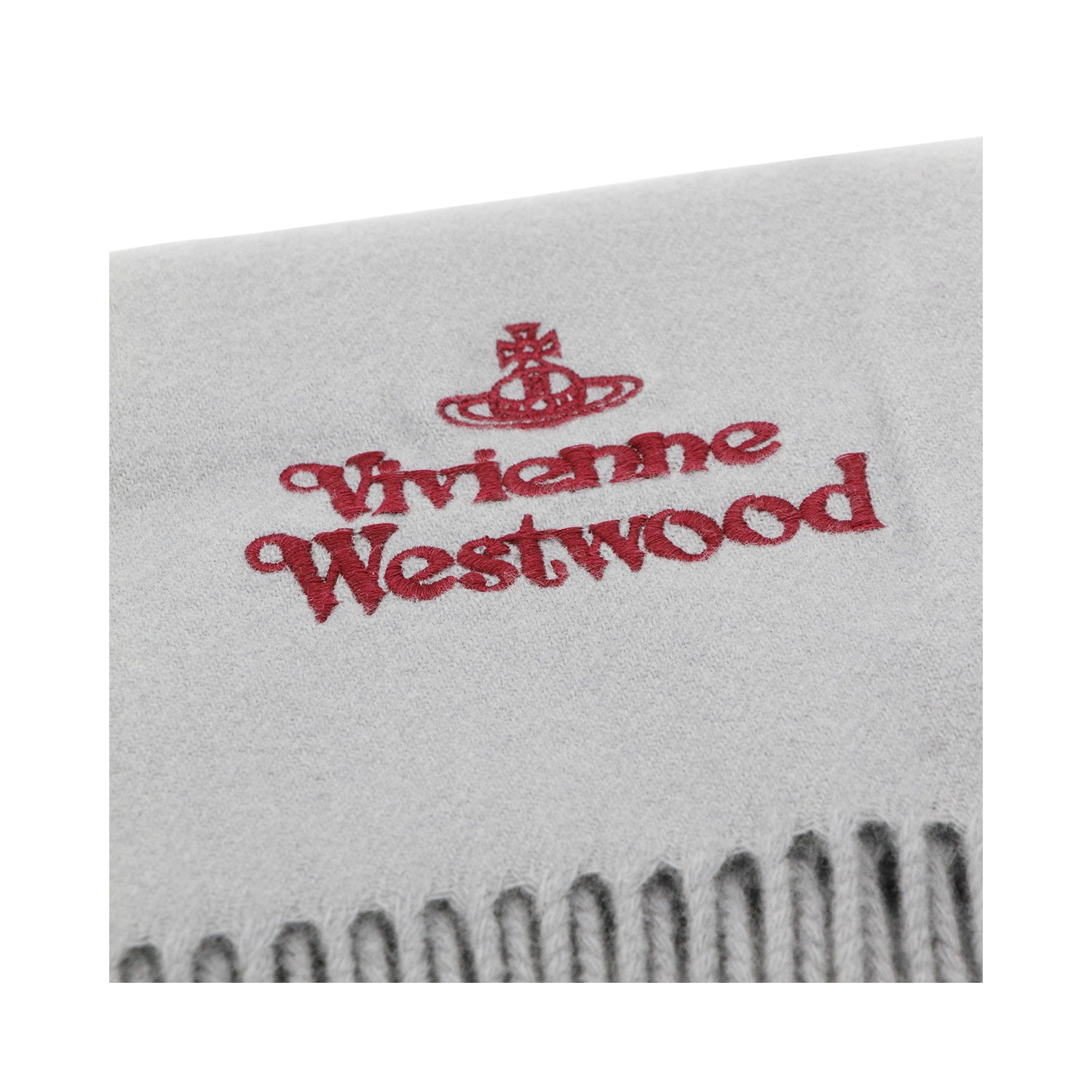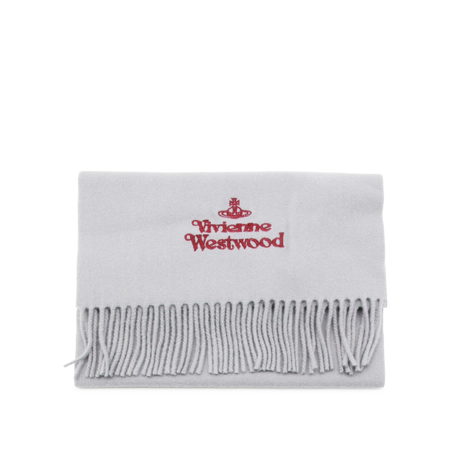 Grey wool scarf from Vivienne Westwood featuring rectangular shape, fringes and embroidered logo.