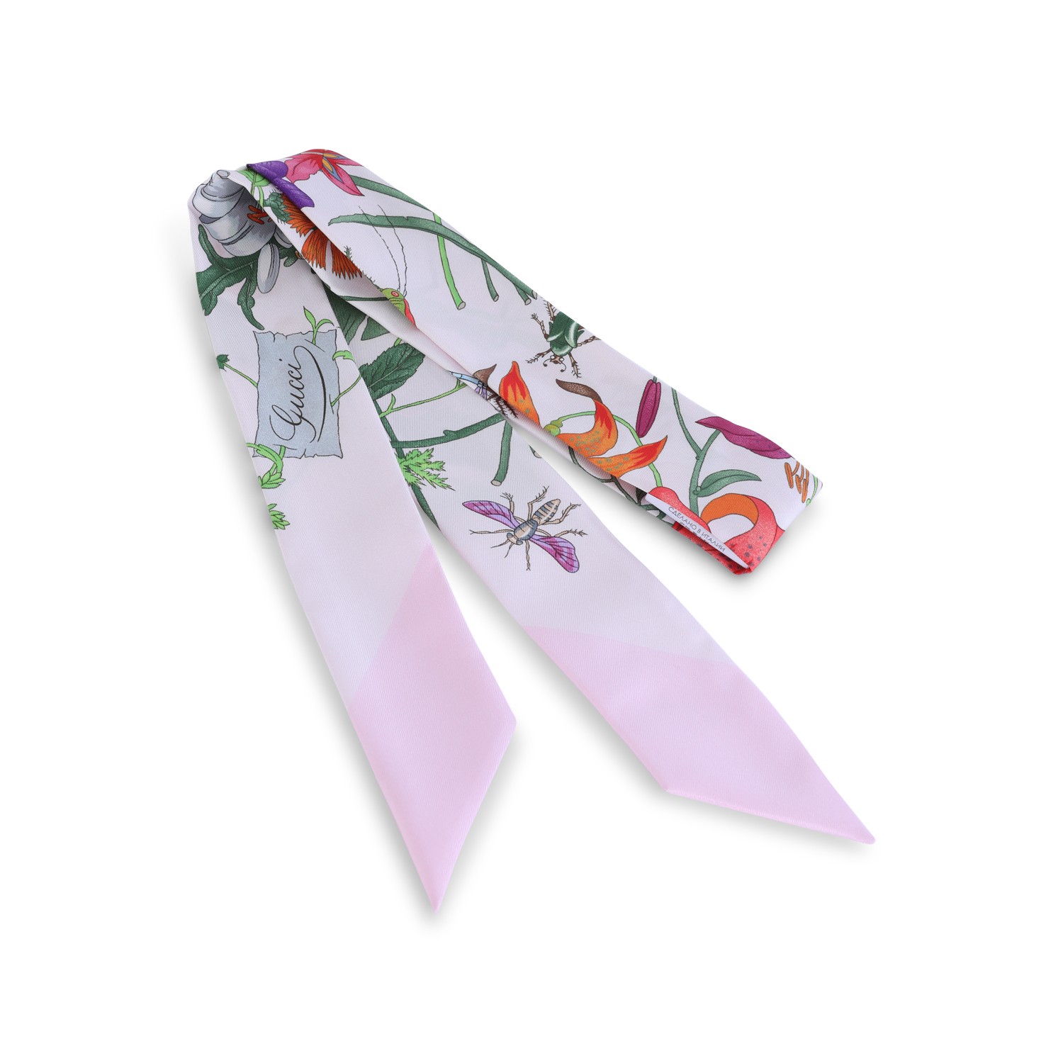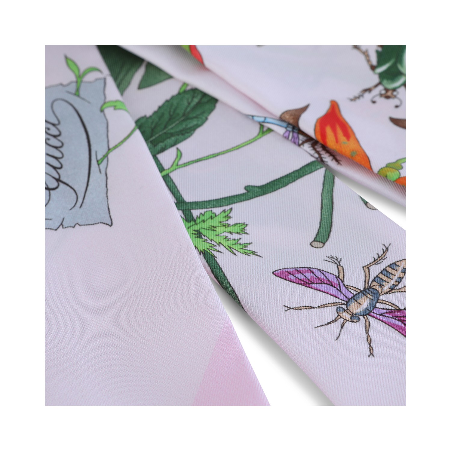 Pink silk scarf from Gucci featuring all over stamp and logo stamp.