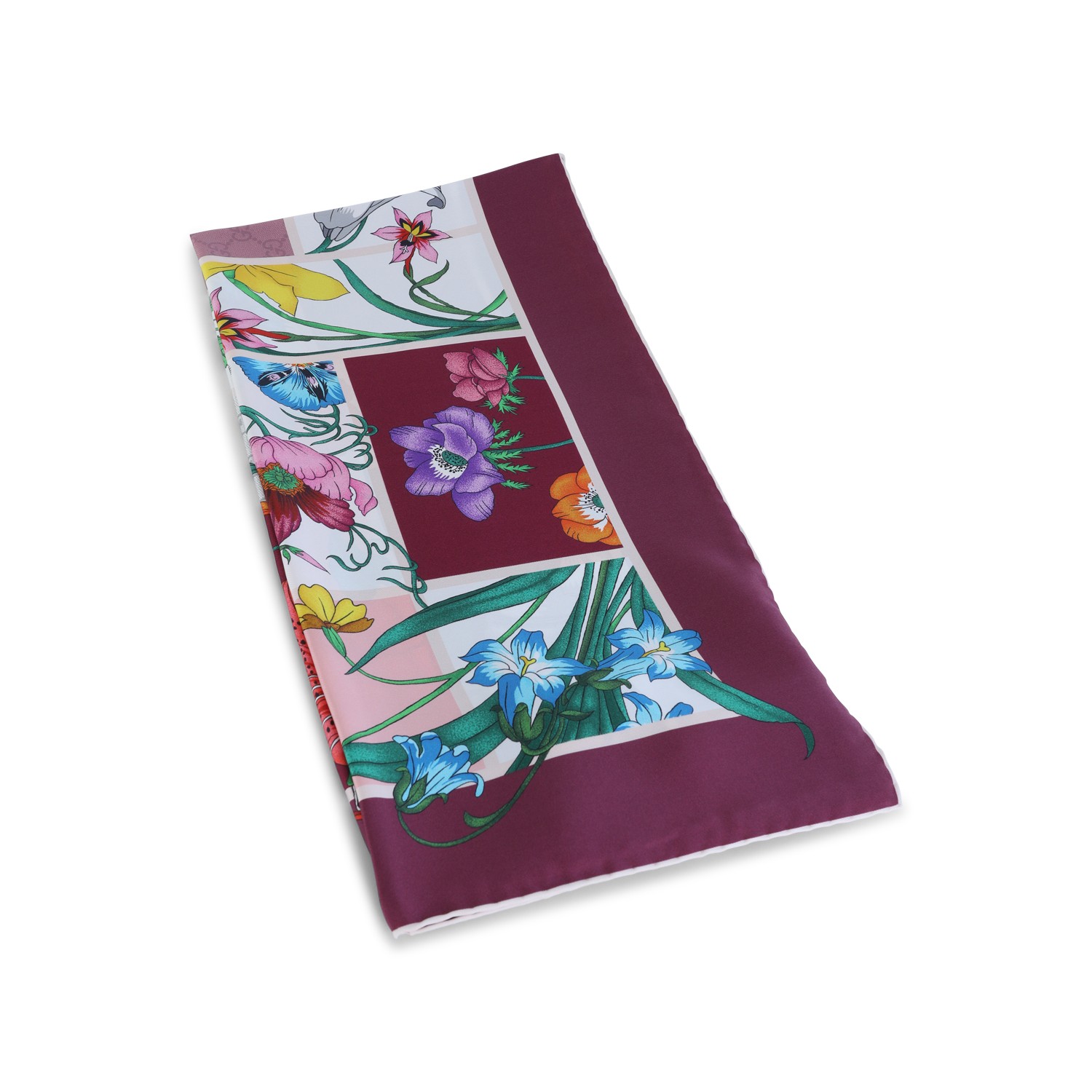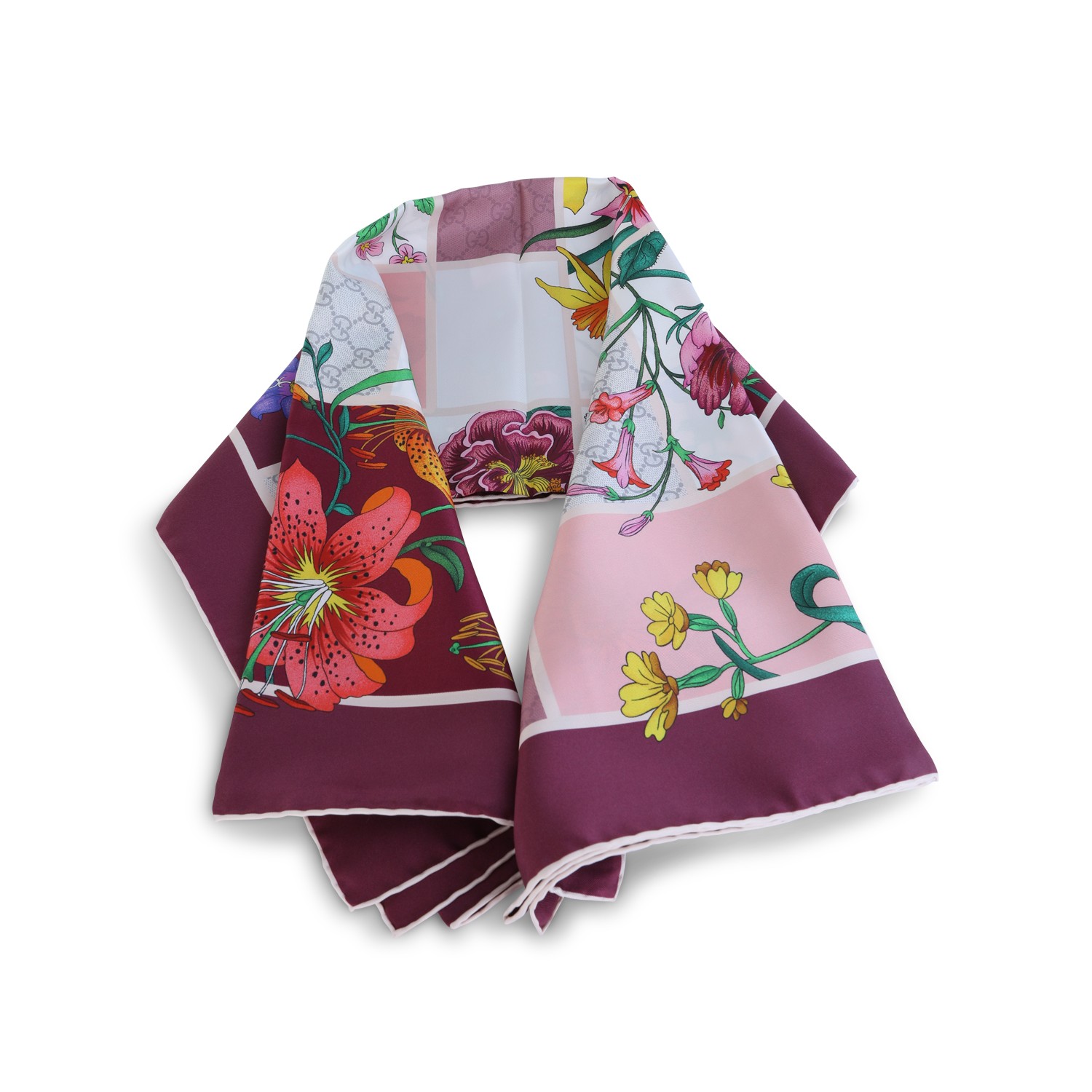 Mauve pink silk scarf from Gucci featuring all over logo print, floreal texture and square shape.