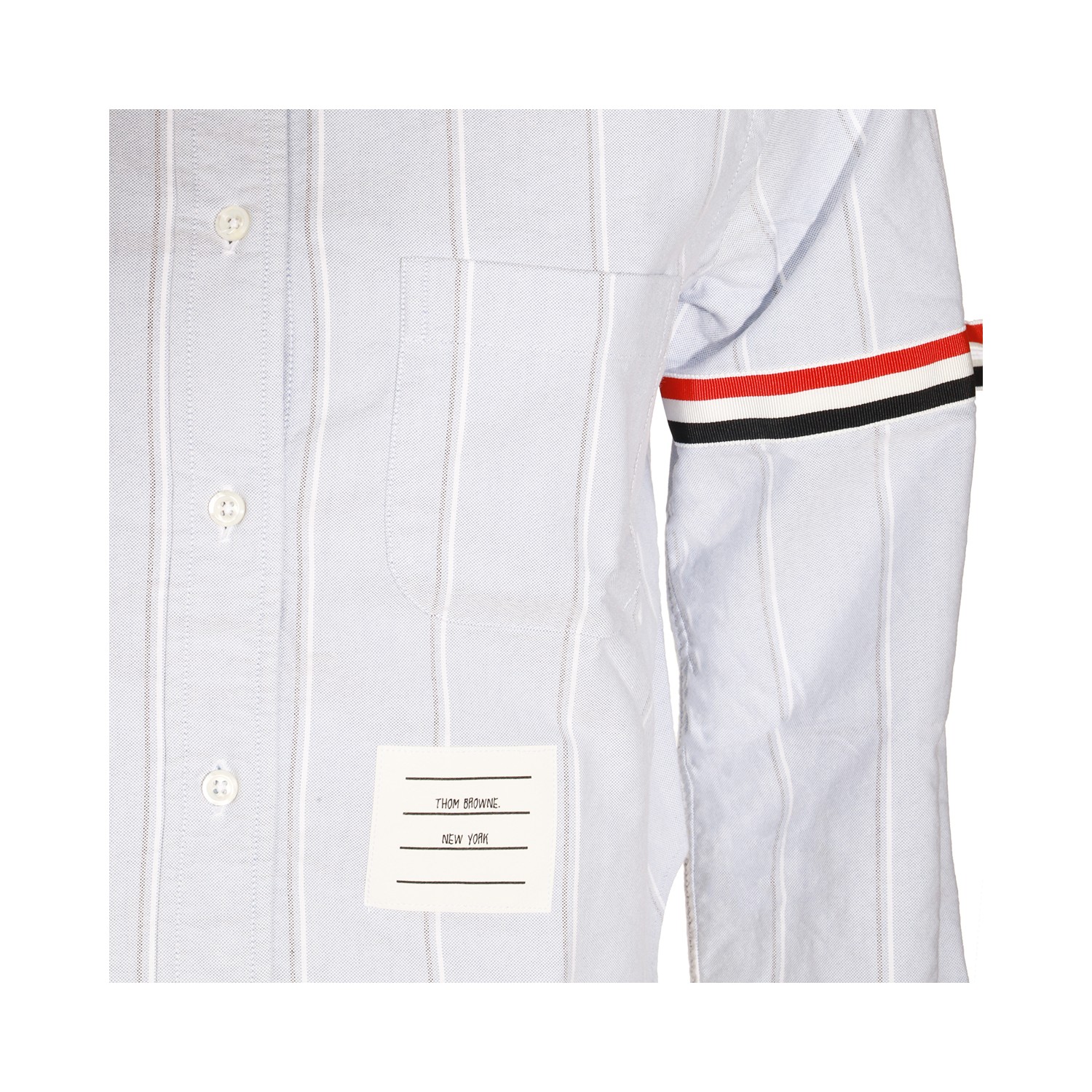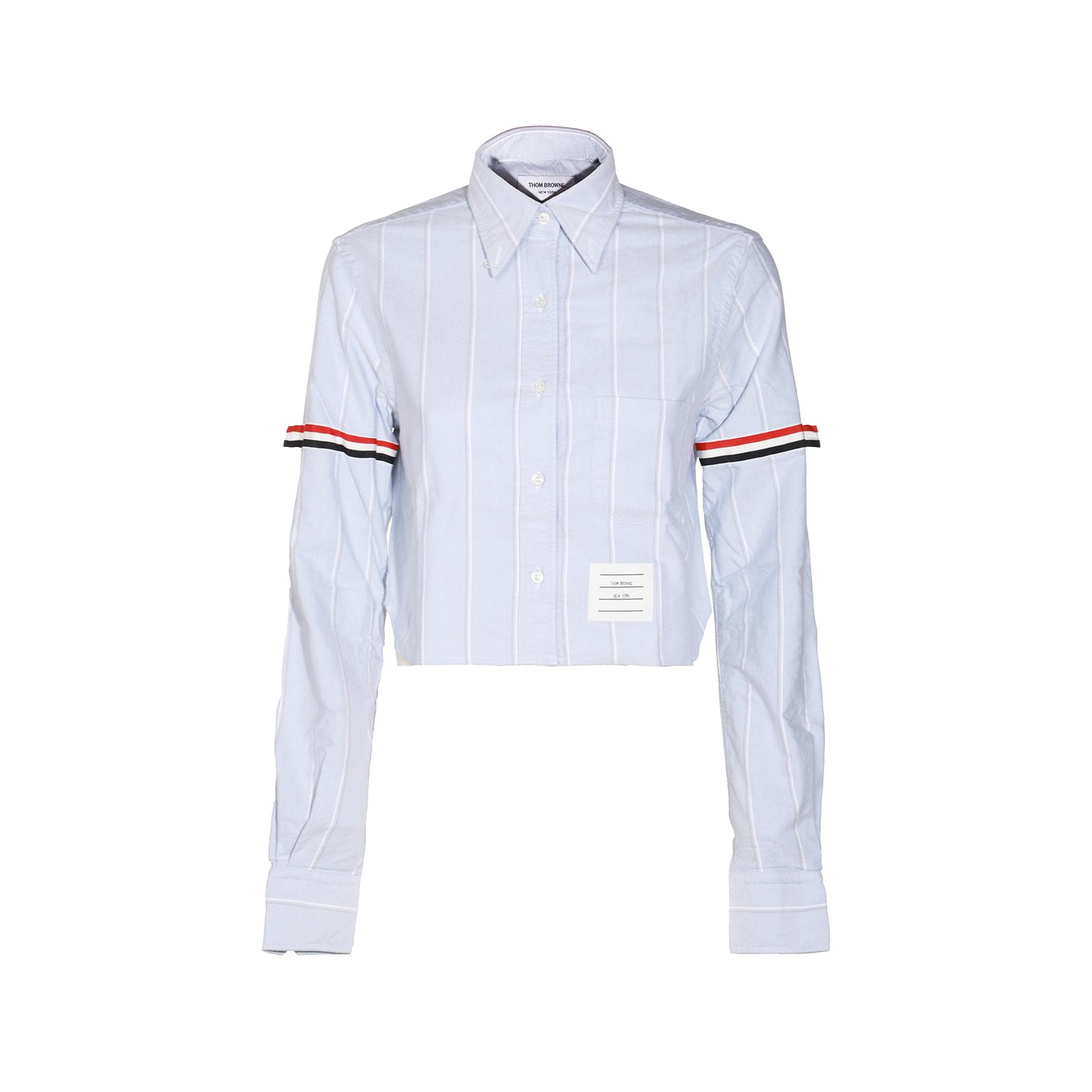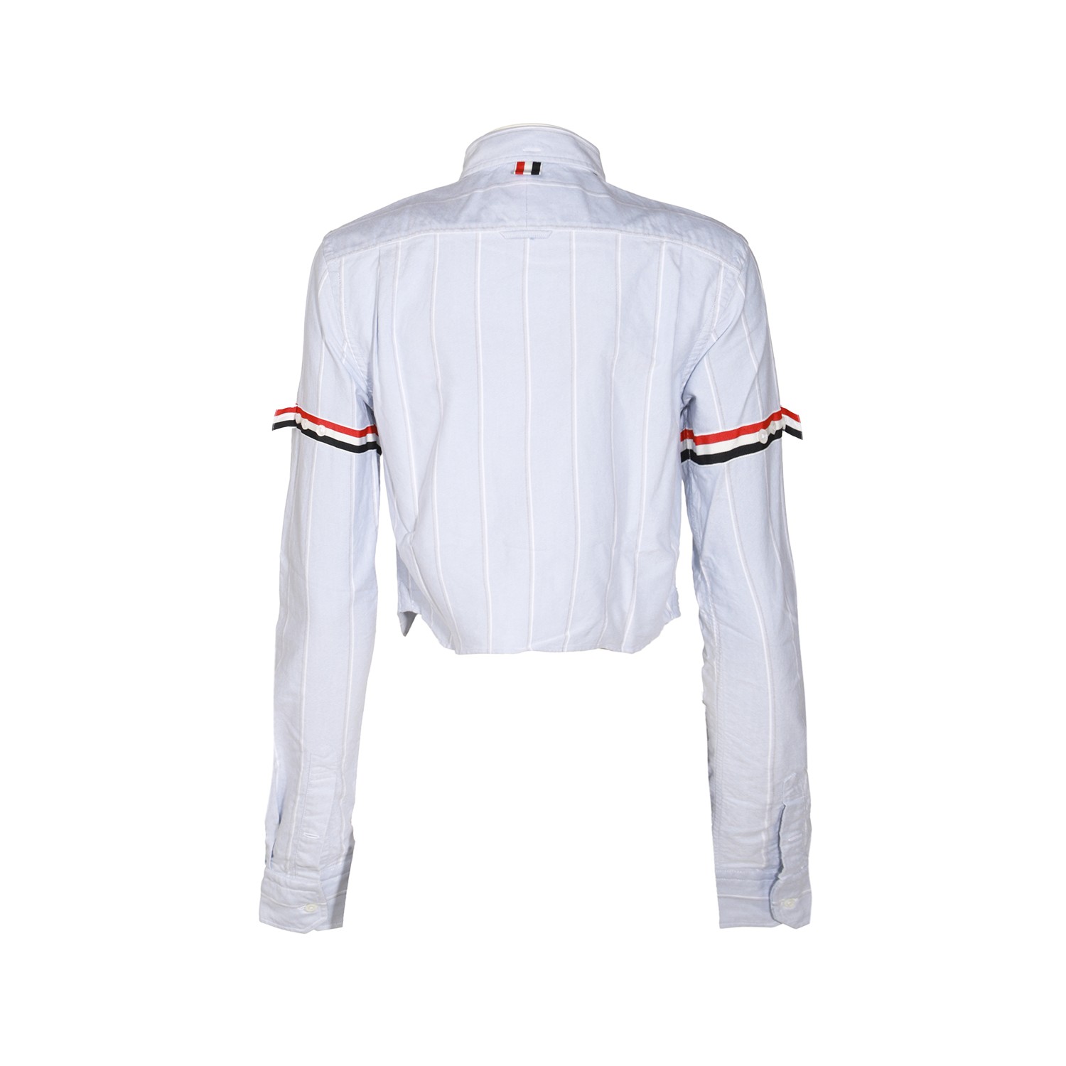 Blue cotton shirt from Thom Browne featuring long sleeves, buttons fastening, shirt collar, cropped and regular vestibility.