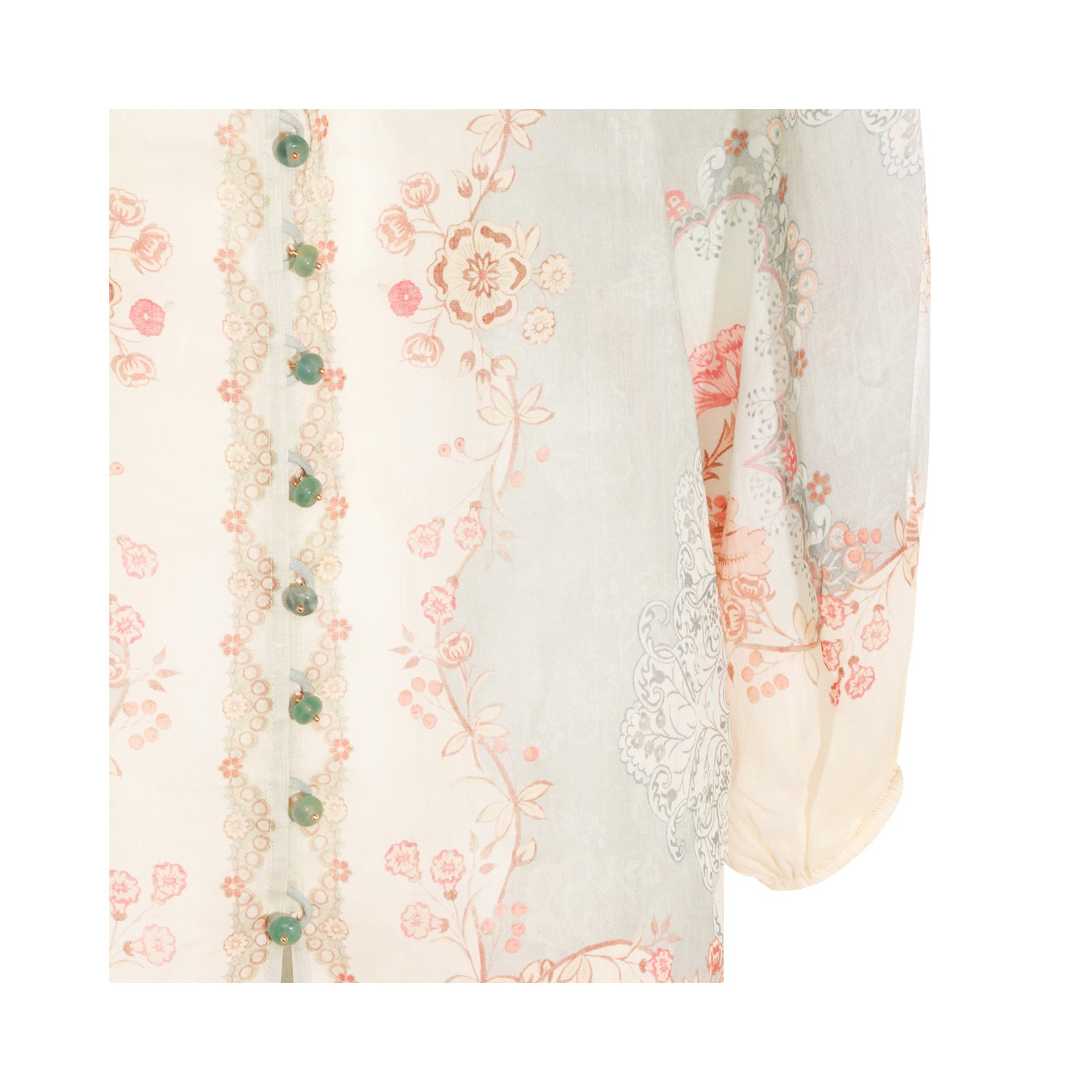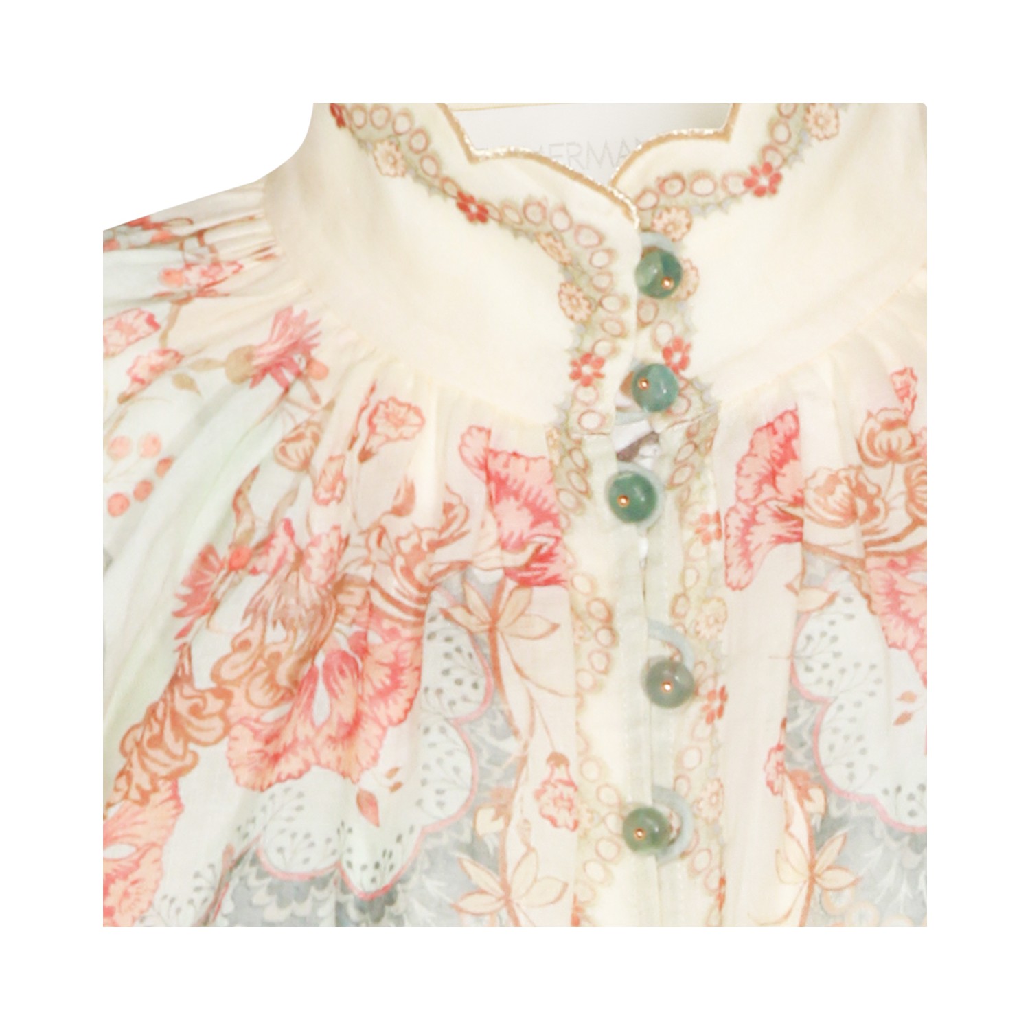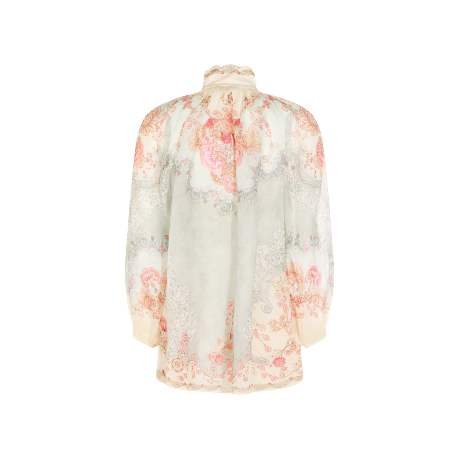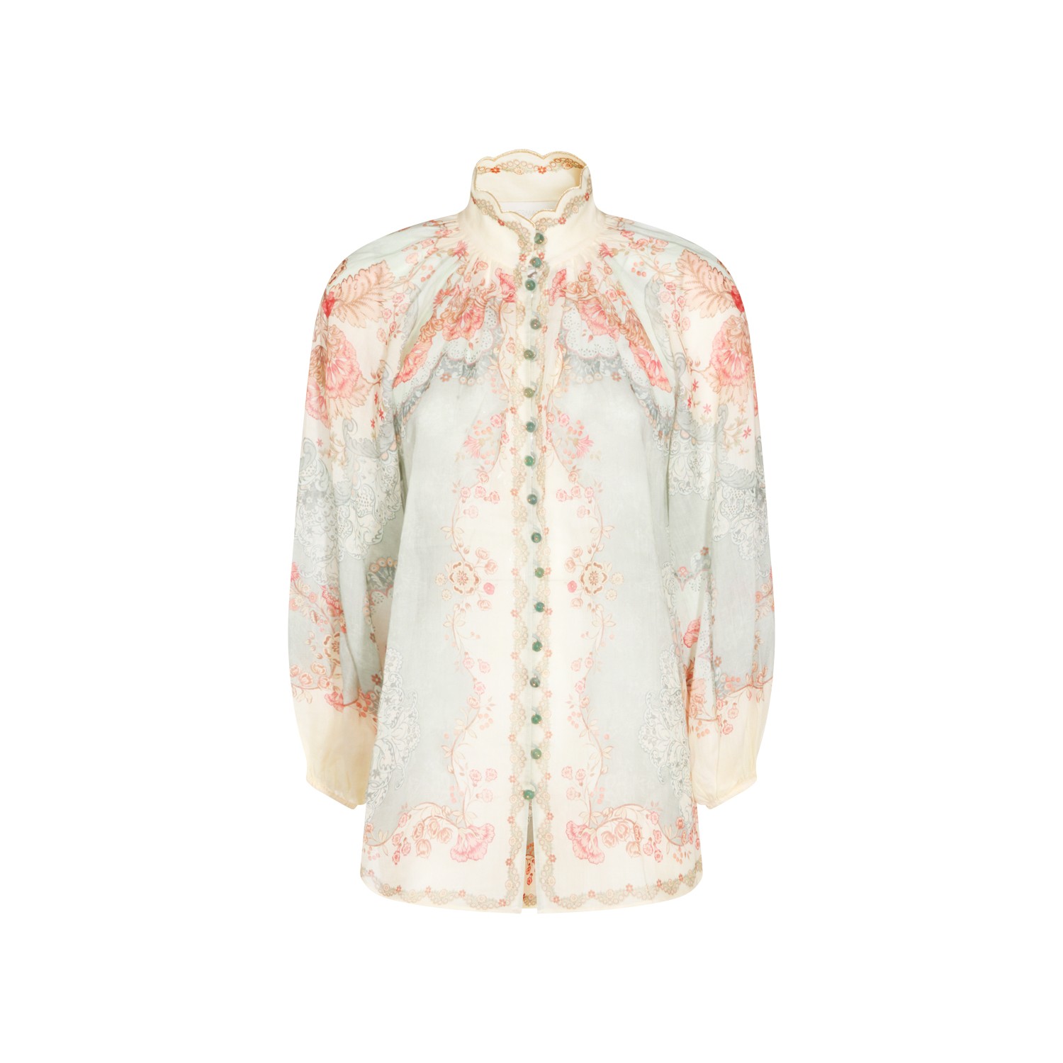 Floral ramie shirt from Zimmermann featuring high collar, buttons fastening, long sleeves, and regular vestibility.