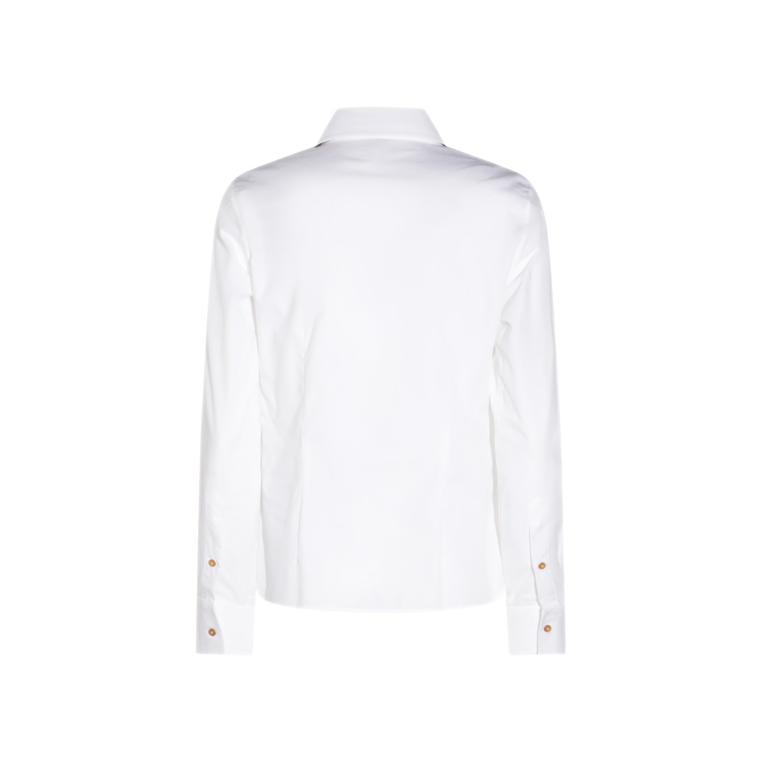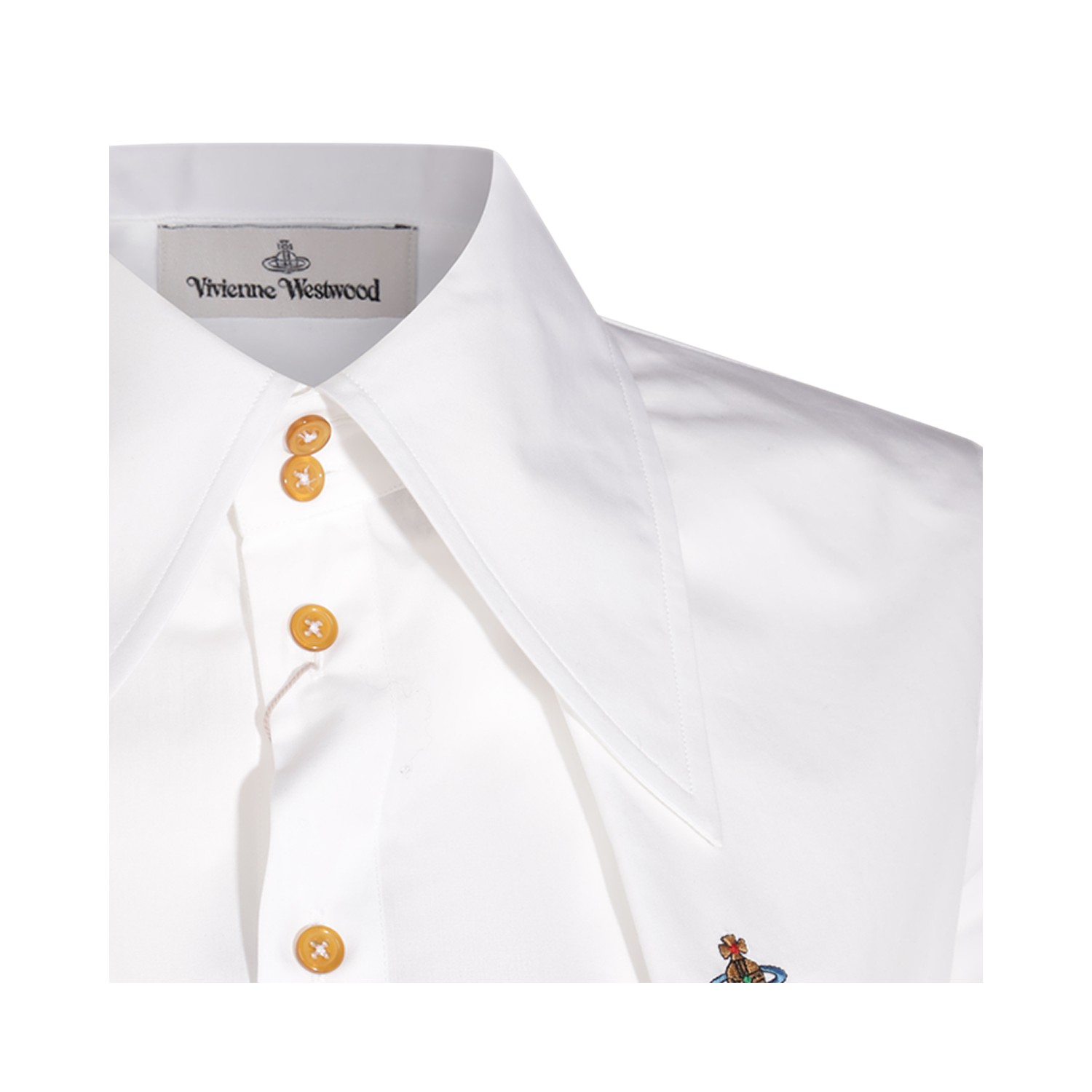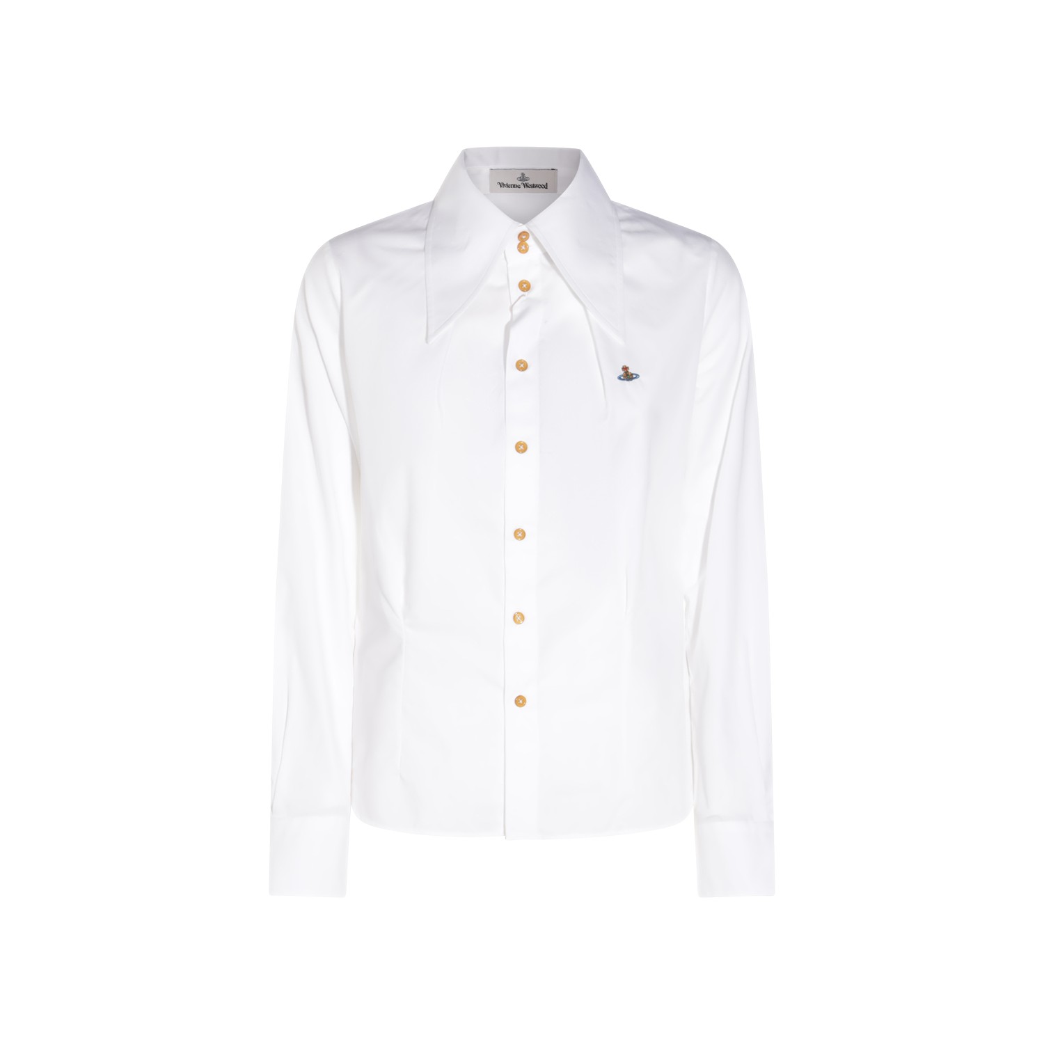 White cotton shirt from Vivienne Westwood featuring classic collar, front button fastening, long sleeves, buttoned cuffs, embroidered logo at the chest and straight hem.