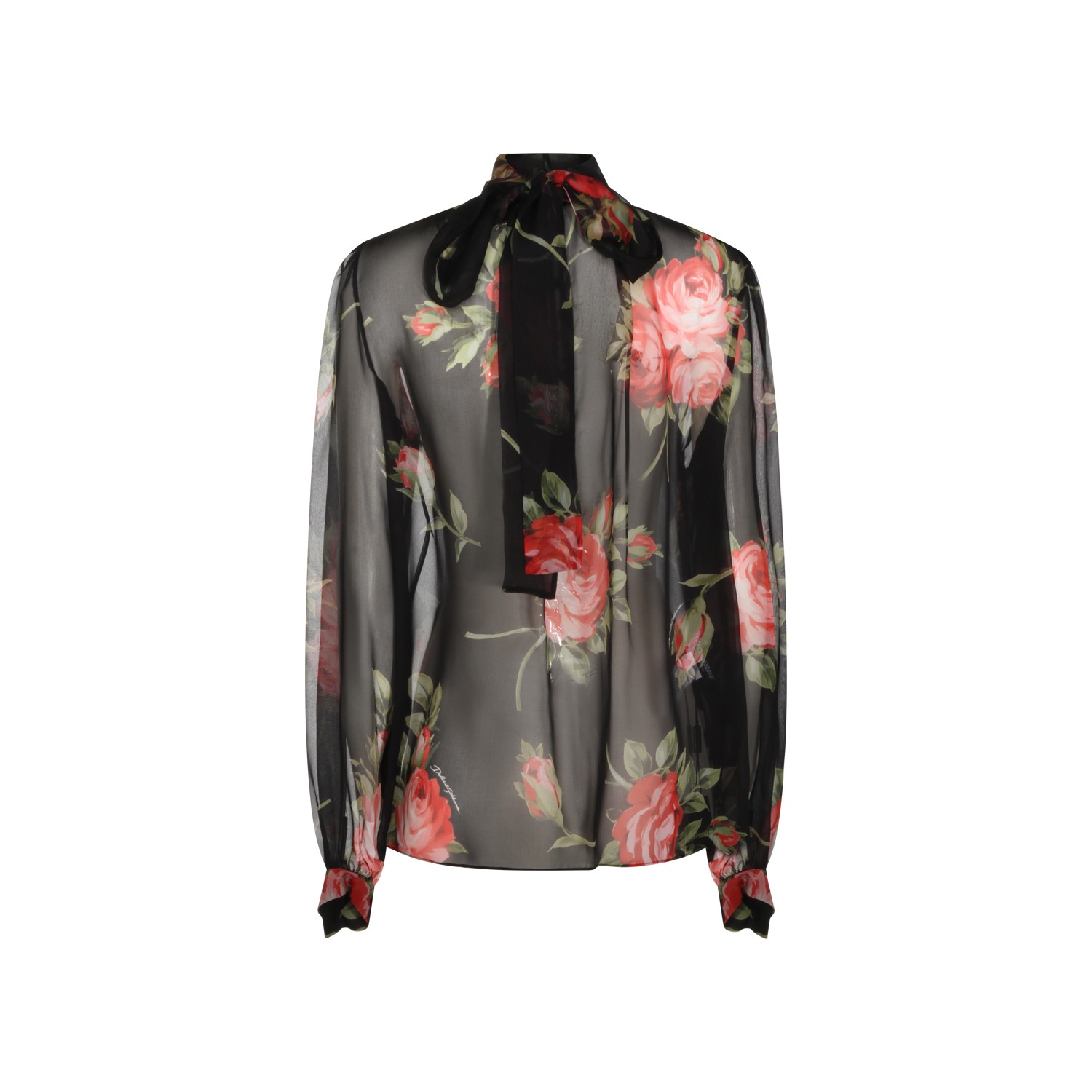 Black silk shirt from Dolce & Gabbana featuring high neck, long sleeves, loose vestibility and transparency.