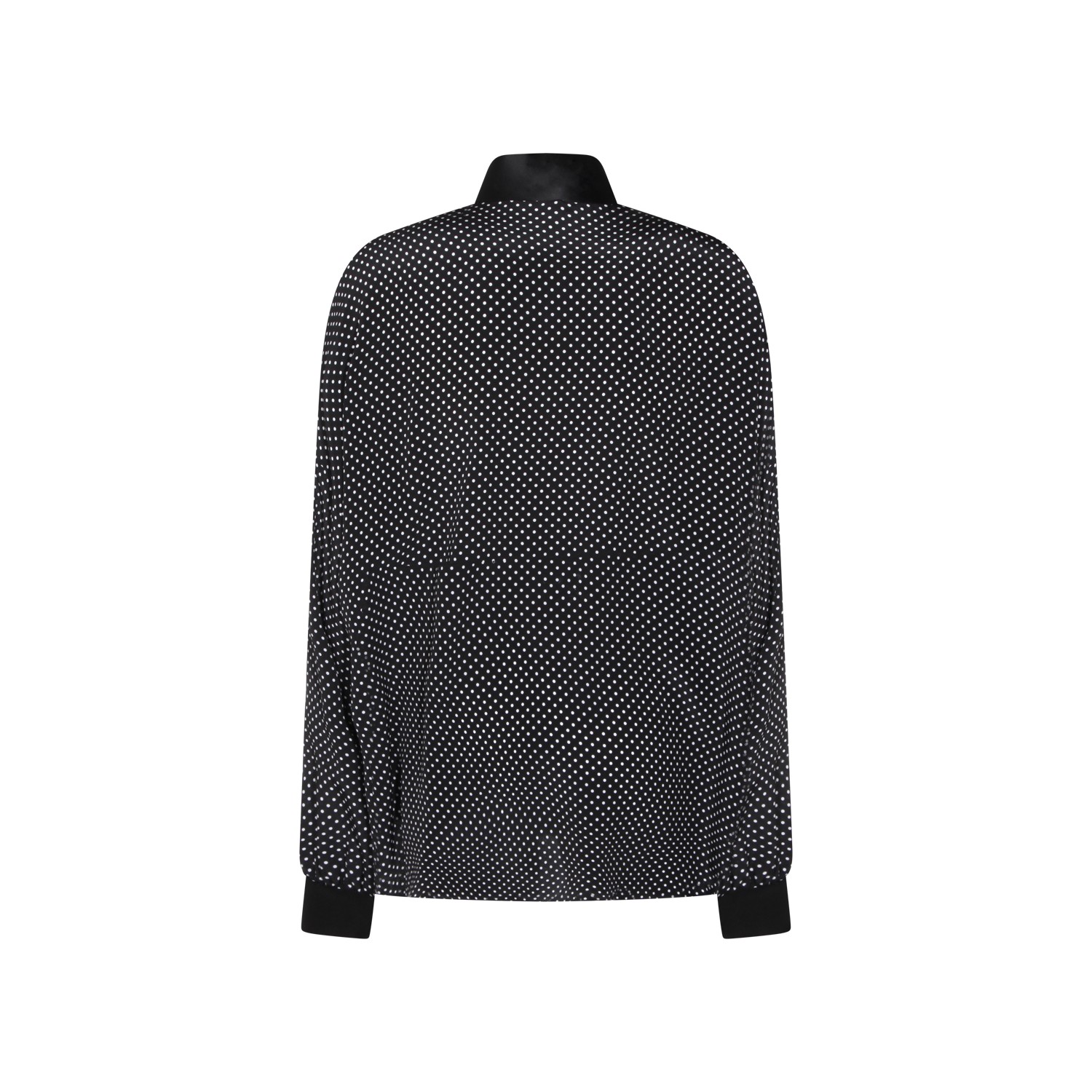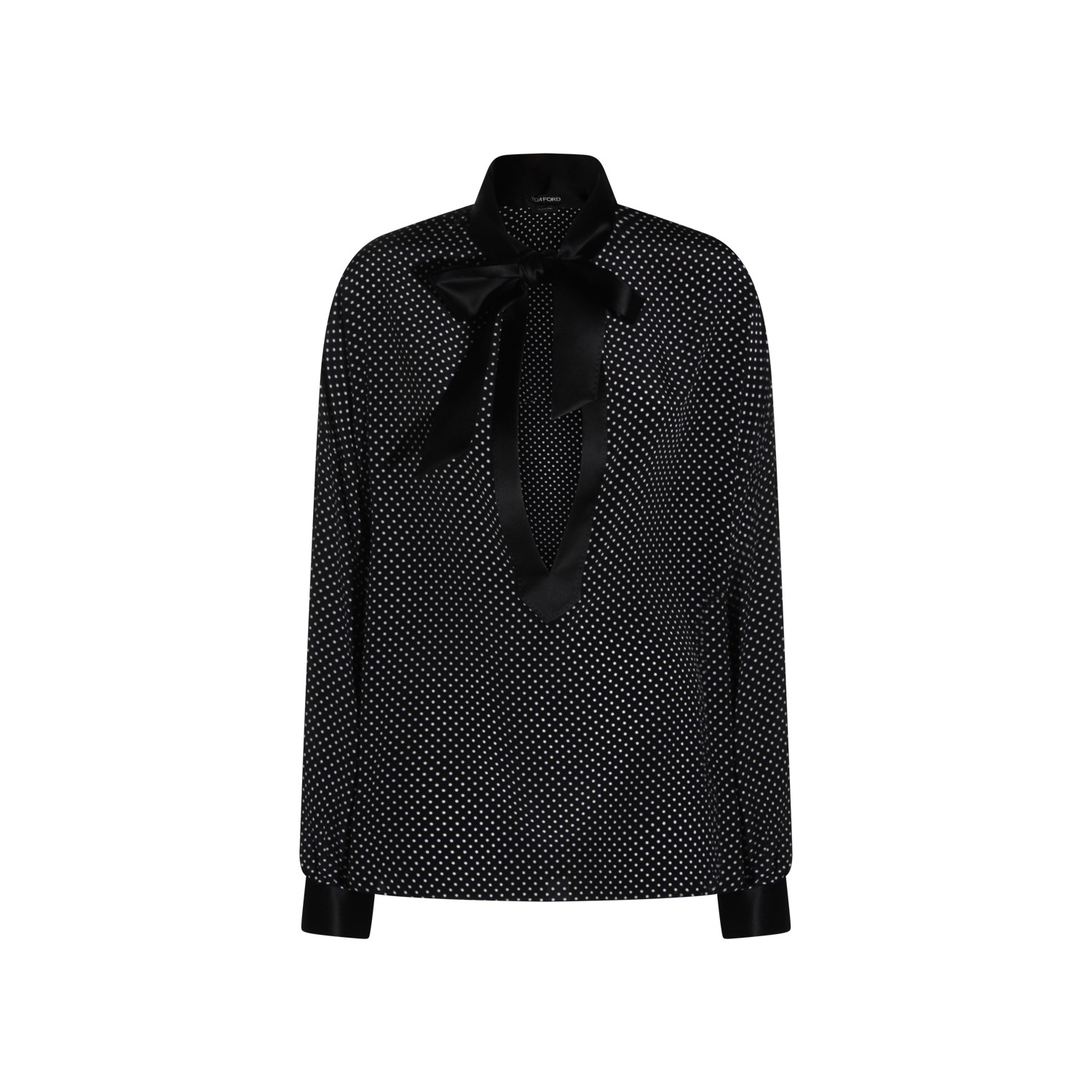 Black silk shirt from Tom Ford featuring long sleeves, all over pois pattern, high collar, neckline bow and soft vestibility.