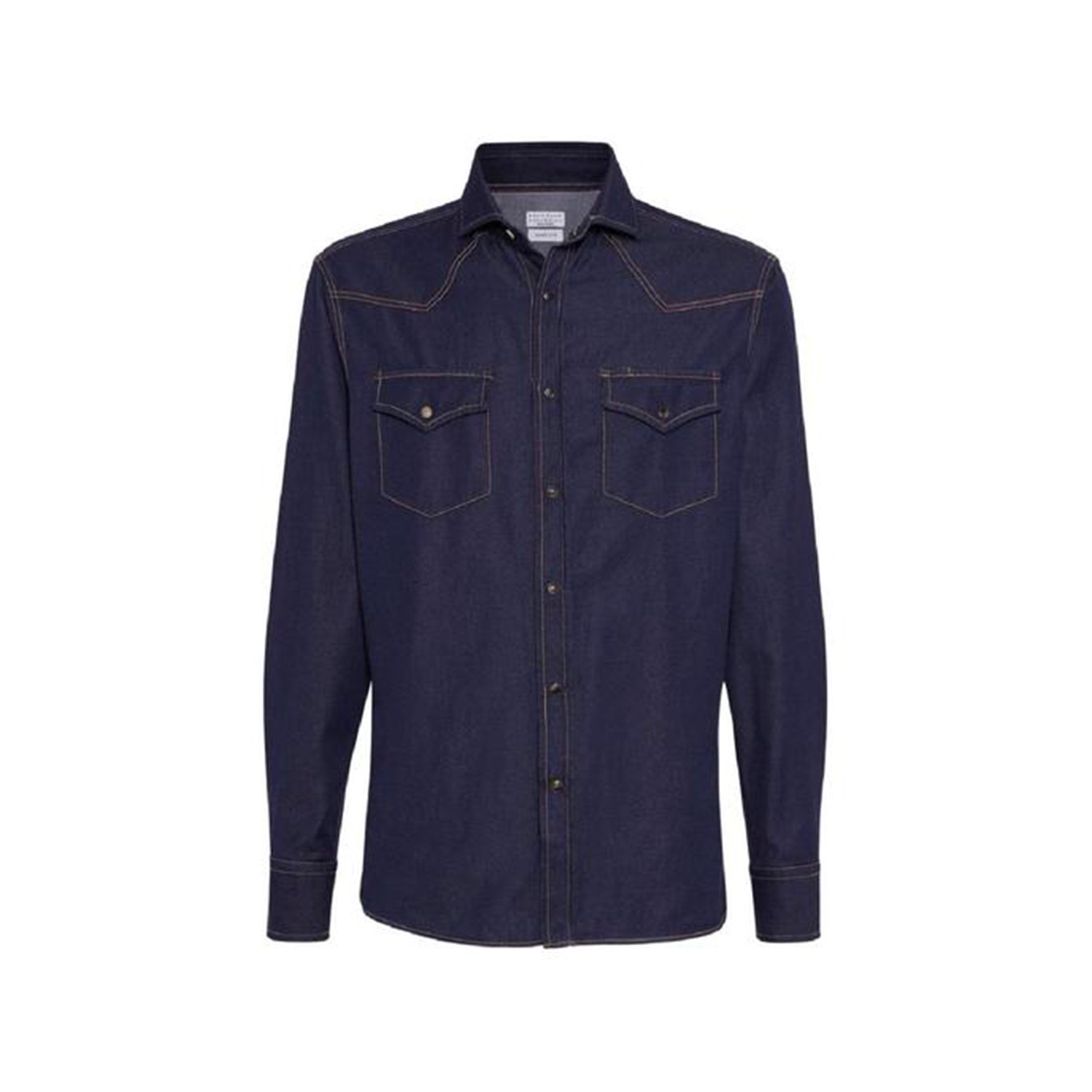 Dark blue cotton shirt from Brunello Cucinelli featuring shirt collar, buttons fastening, long sleeves, two chest pockets, contrasting stitchings and regular vestibility.