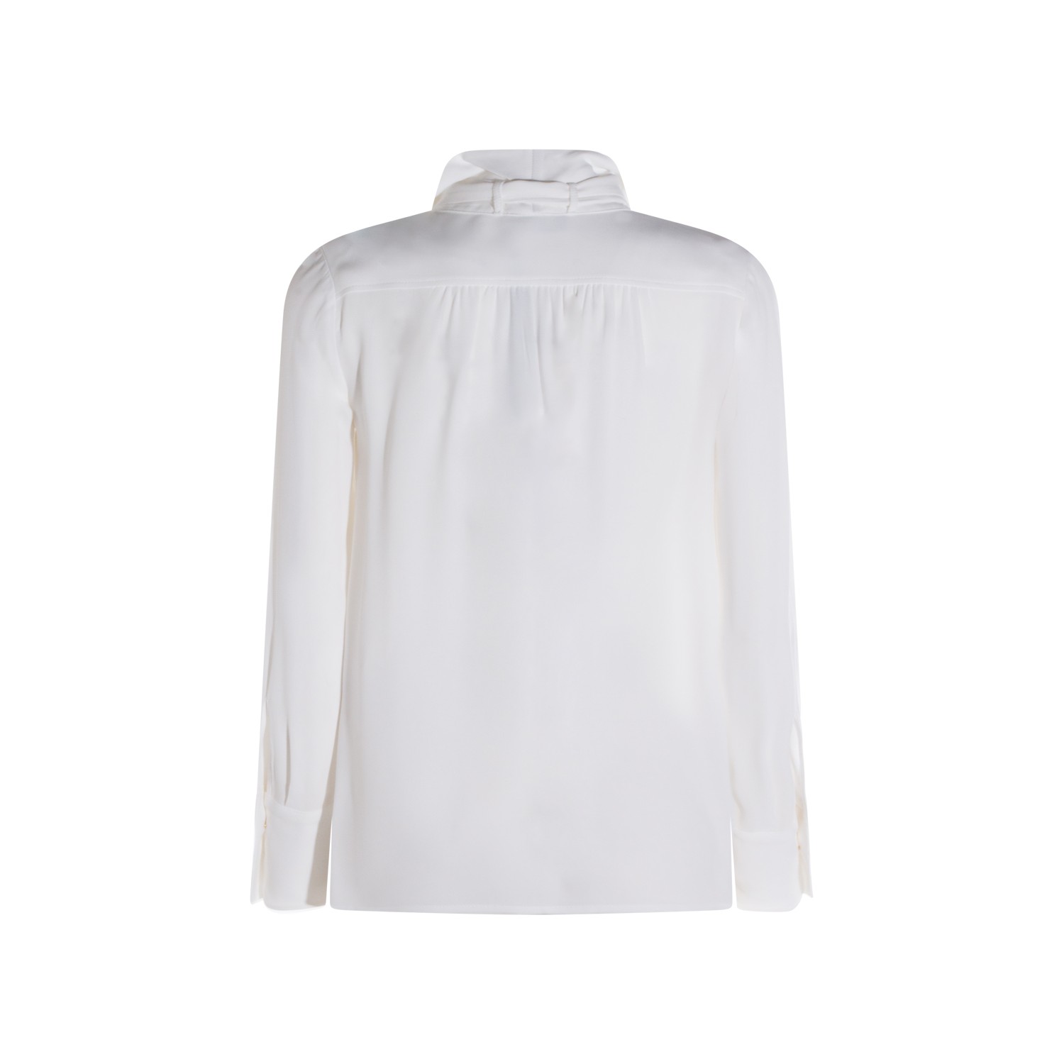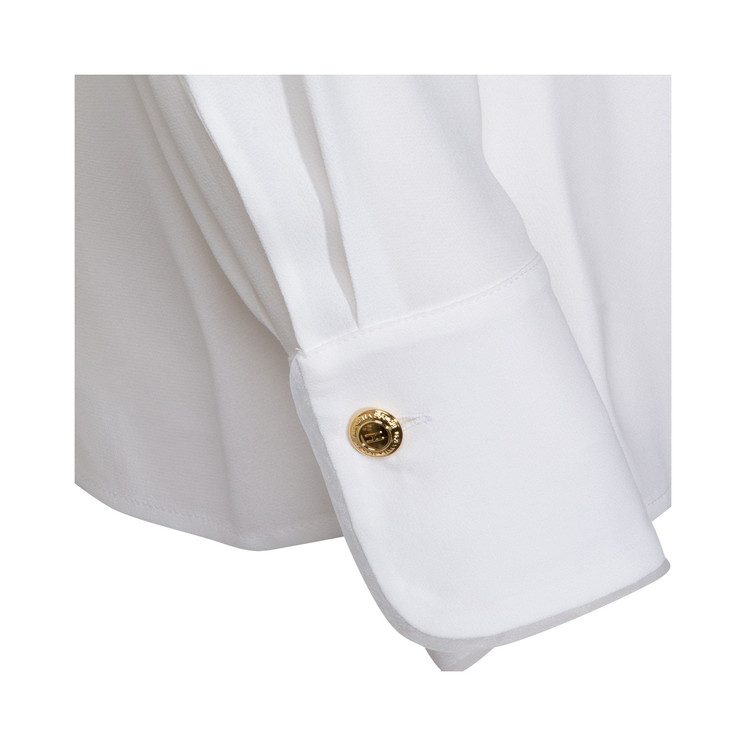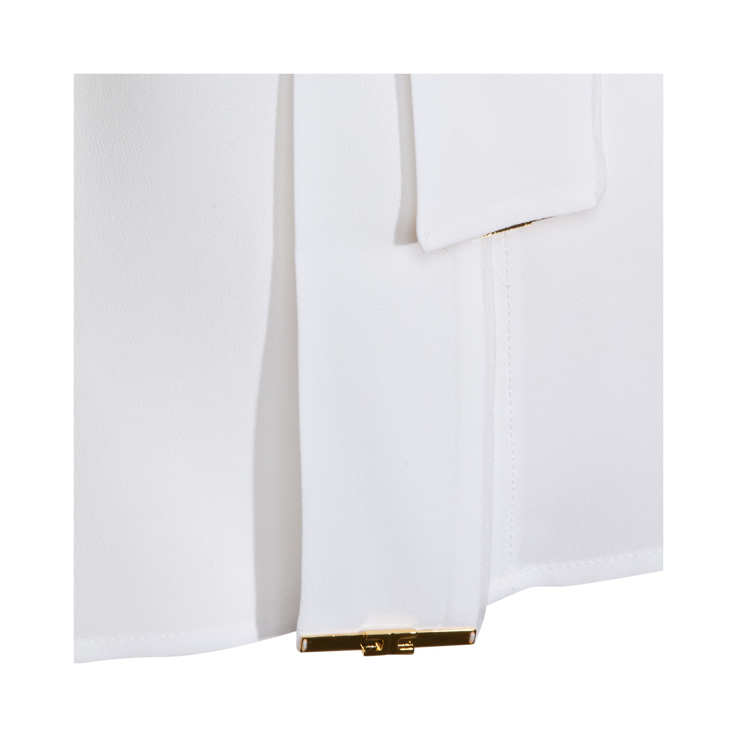 White viscose shirt from Elisabetta Franchi featuring shirt collar, V-neck, sash framing the neck, gold metal plaques, long sleeves and regular vestibility.