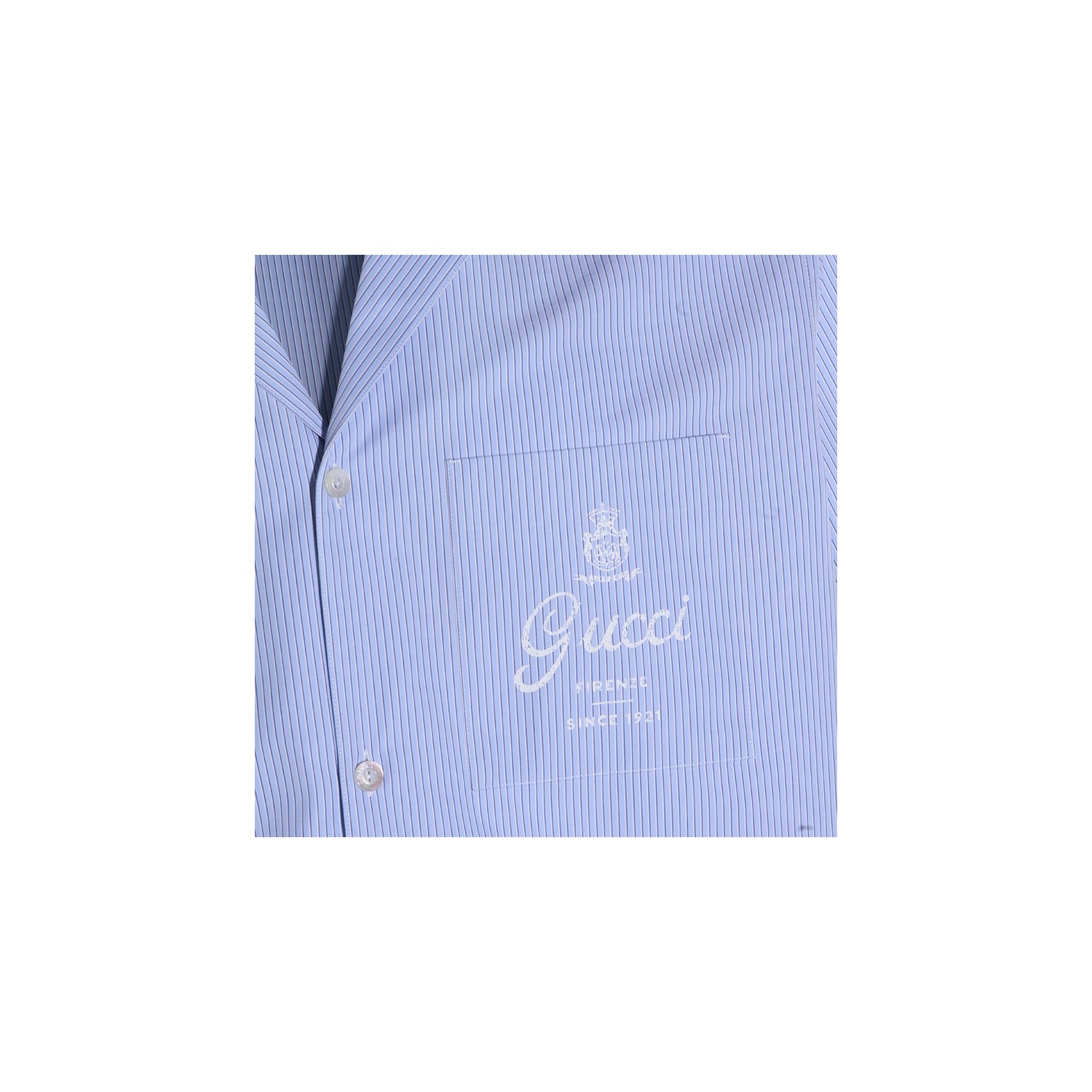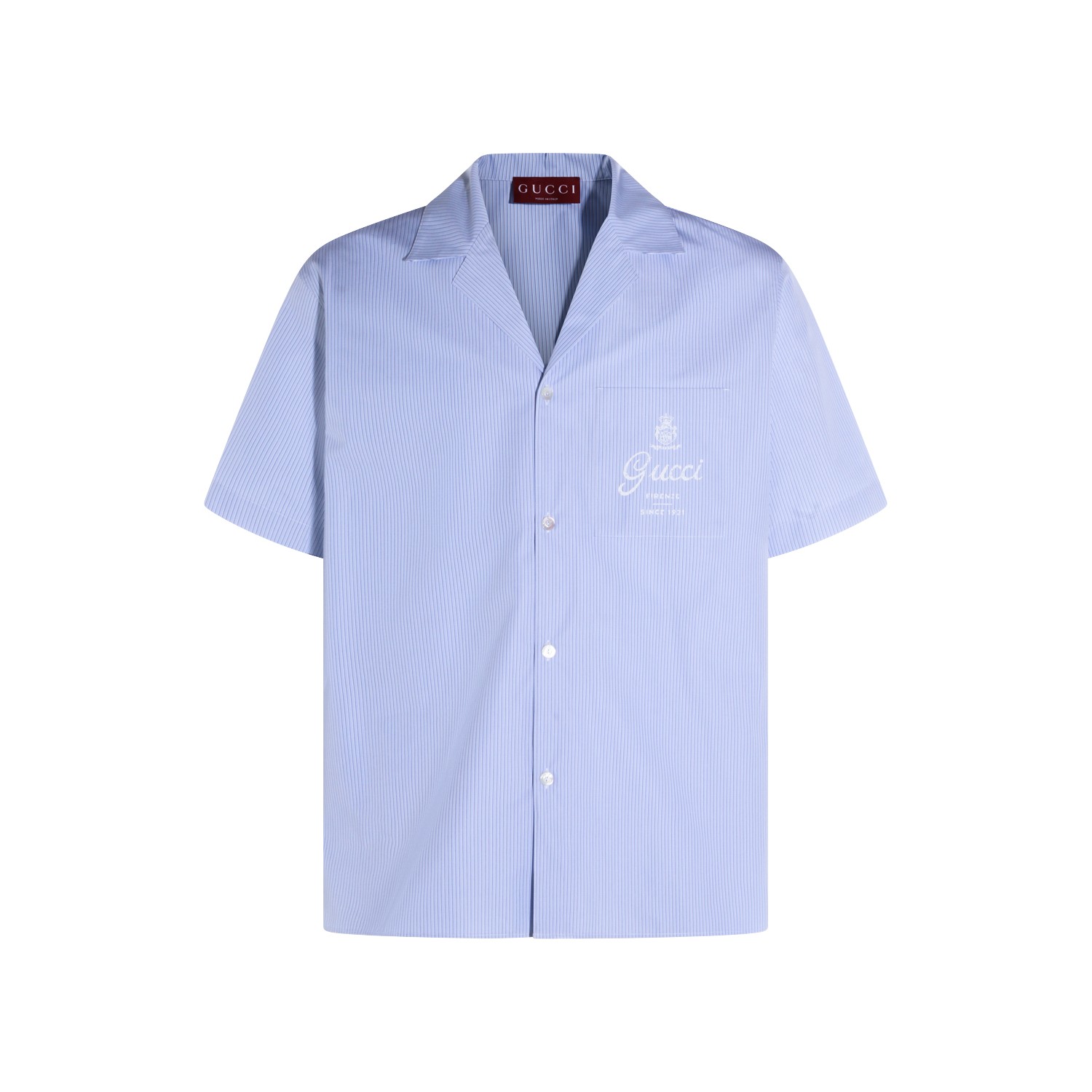Light blue cotton shirt from Gucci featuring shirt collar, short sleeves, heart logo print, buttons fastening and regular fit.