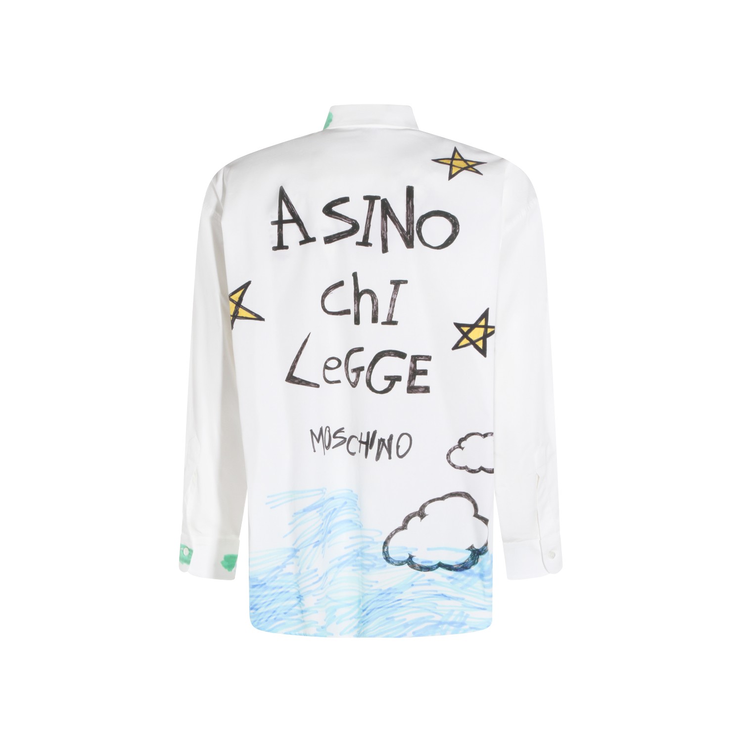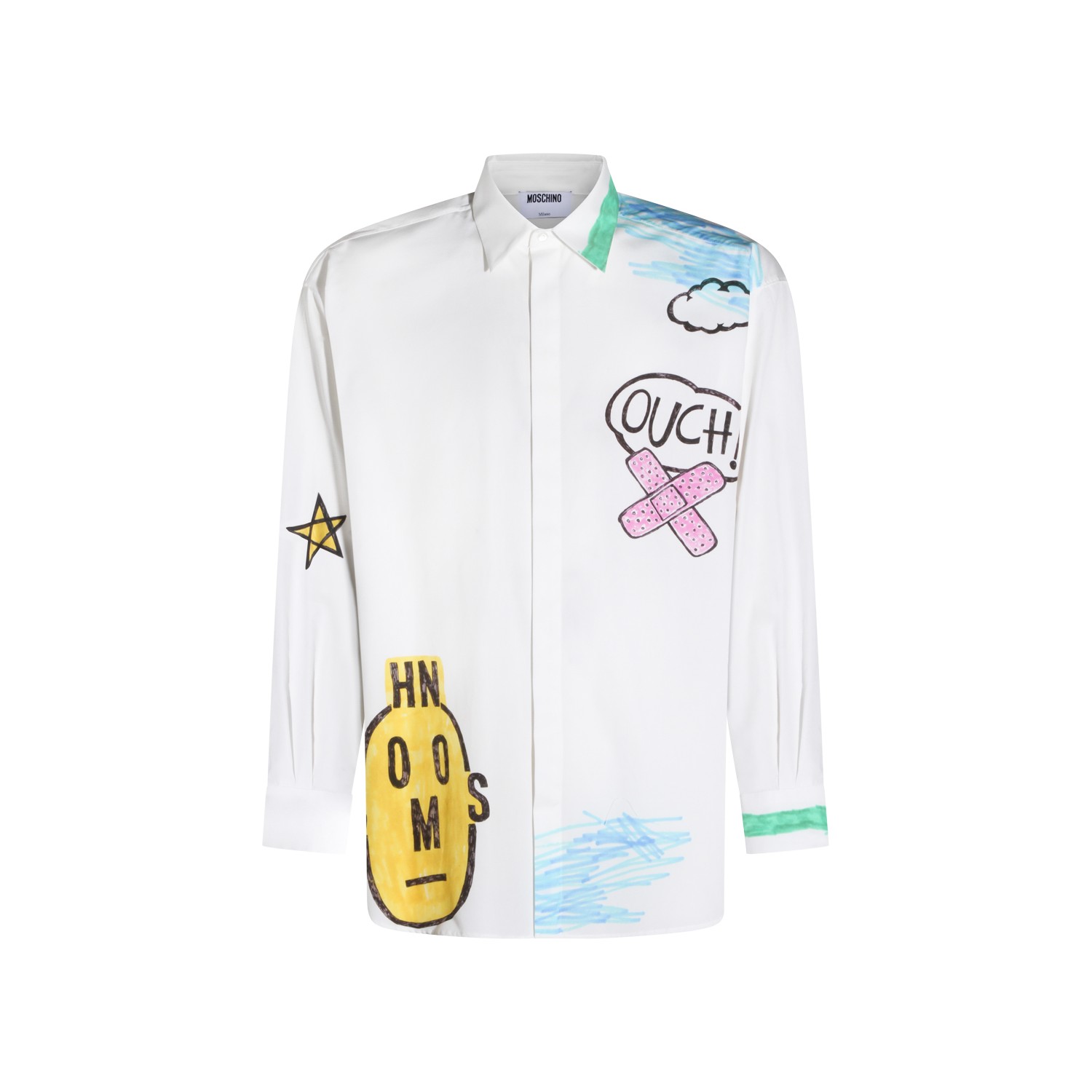 White cotton shirt from Moschino featuring shirt collar, long sleeves, prints, buttons fastening and regular fit.