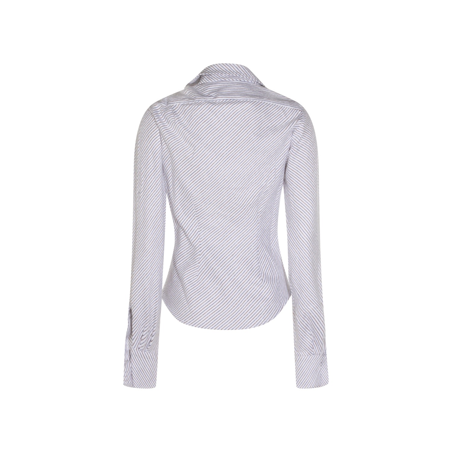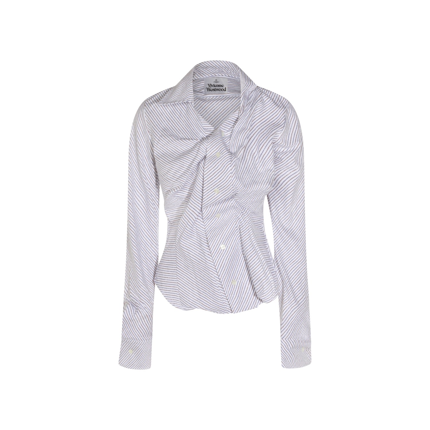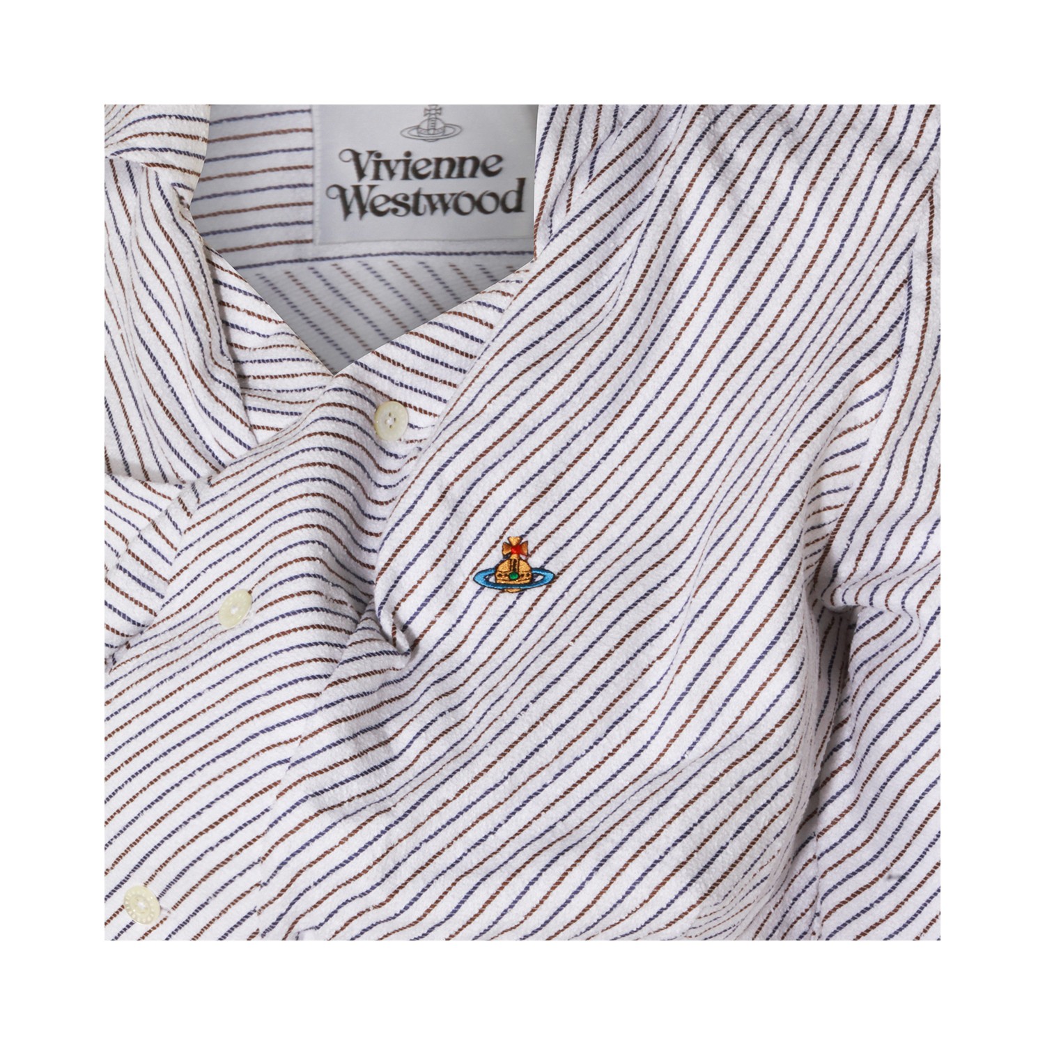 Blue and brown cotton shirt from Vivienne Westwood featuring shirt collar, long sleeves, asymmetrical closure, striped motif, embroidered Orb logo and regular fit.