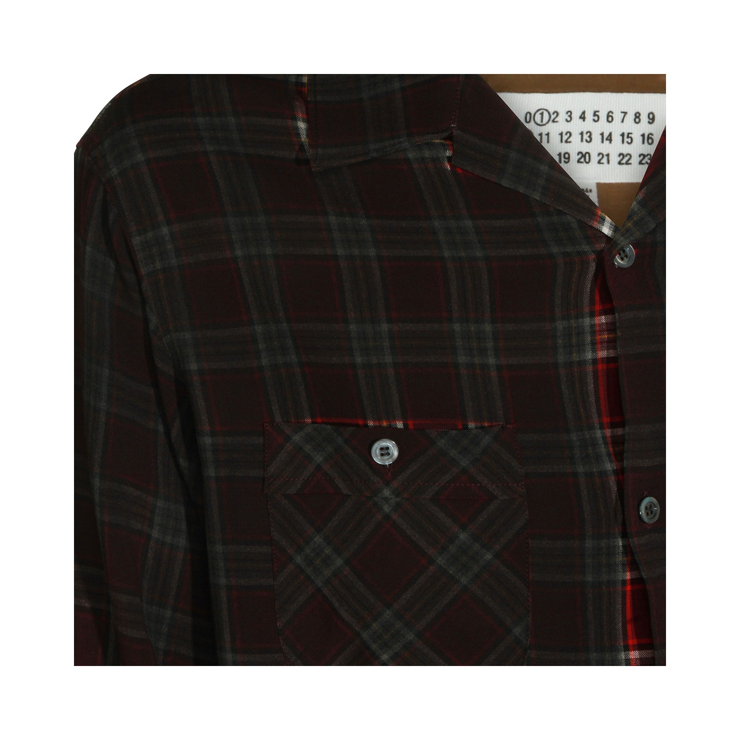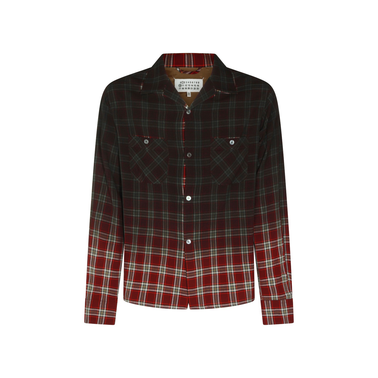 Red viscose shirt from Maison Margiela featuring shirt collar, long sleeves, check pattern, buttons fastening, chest pockets and regular fit.