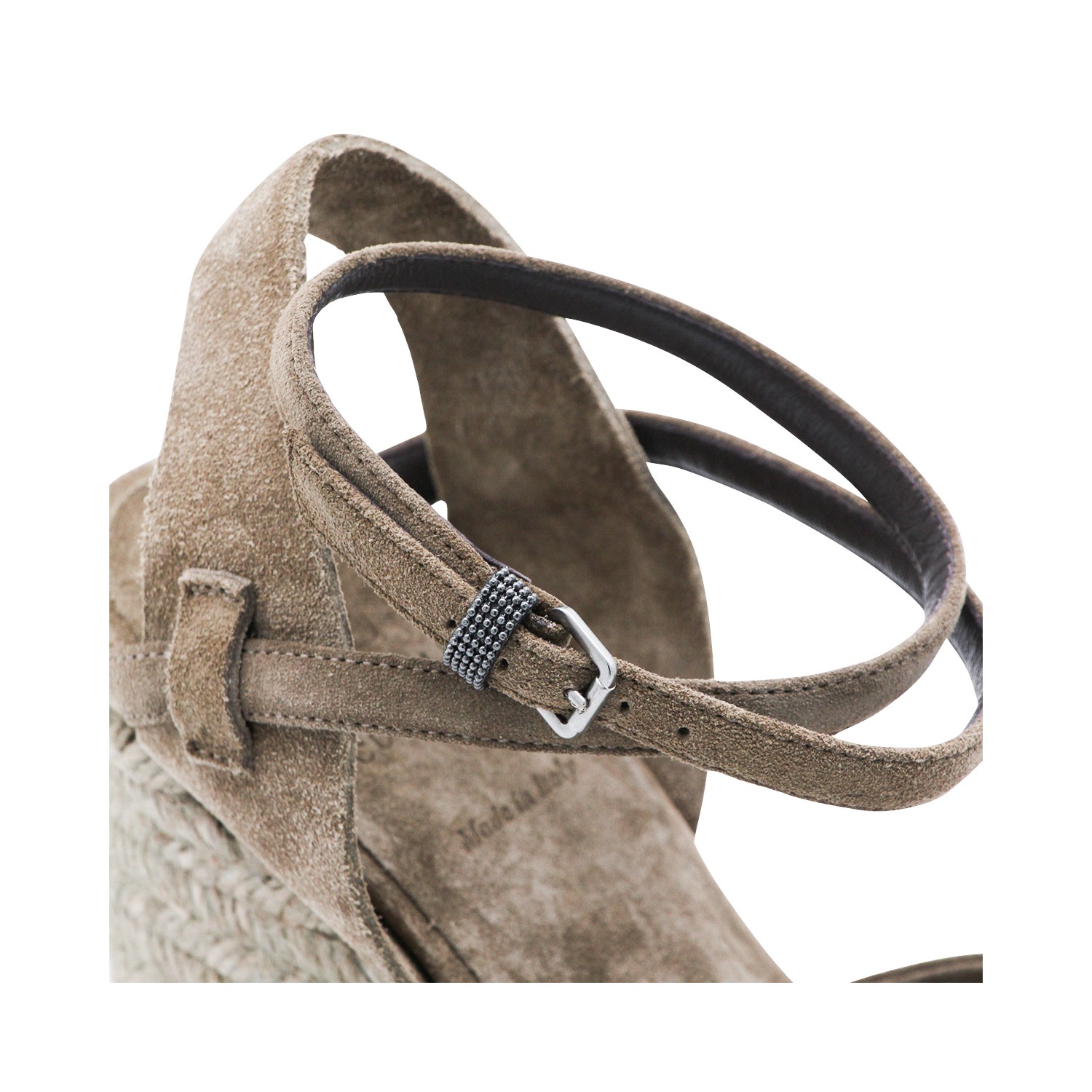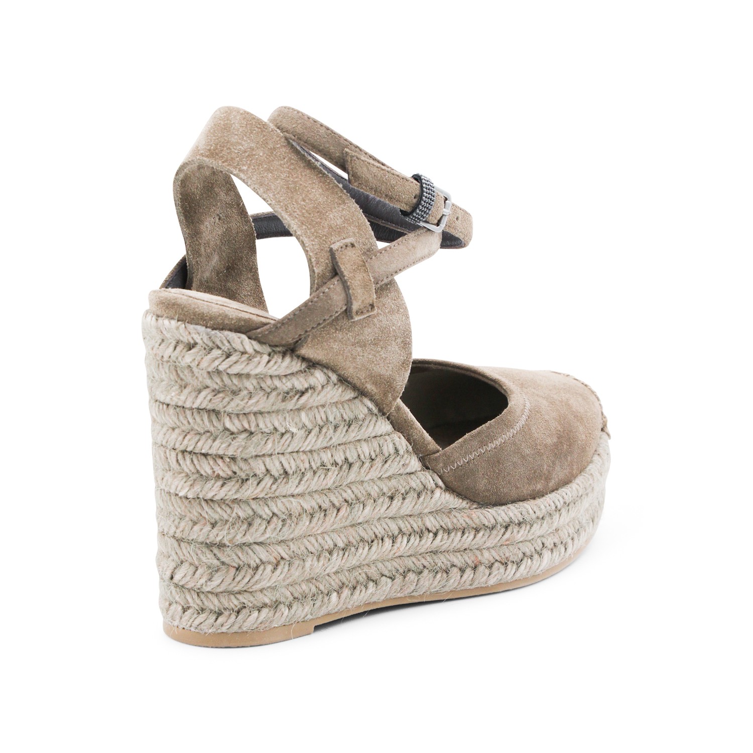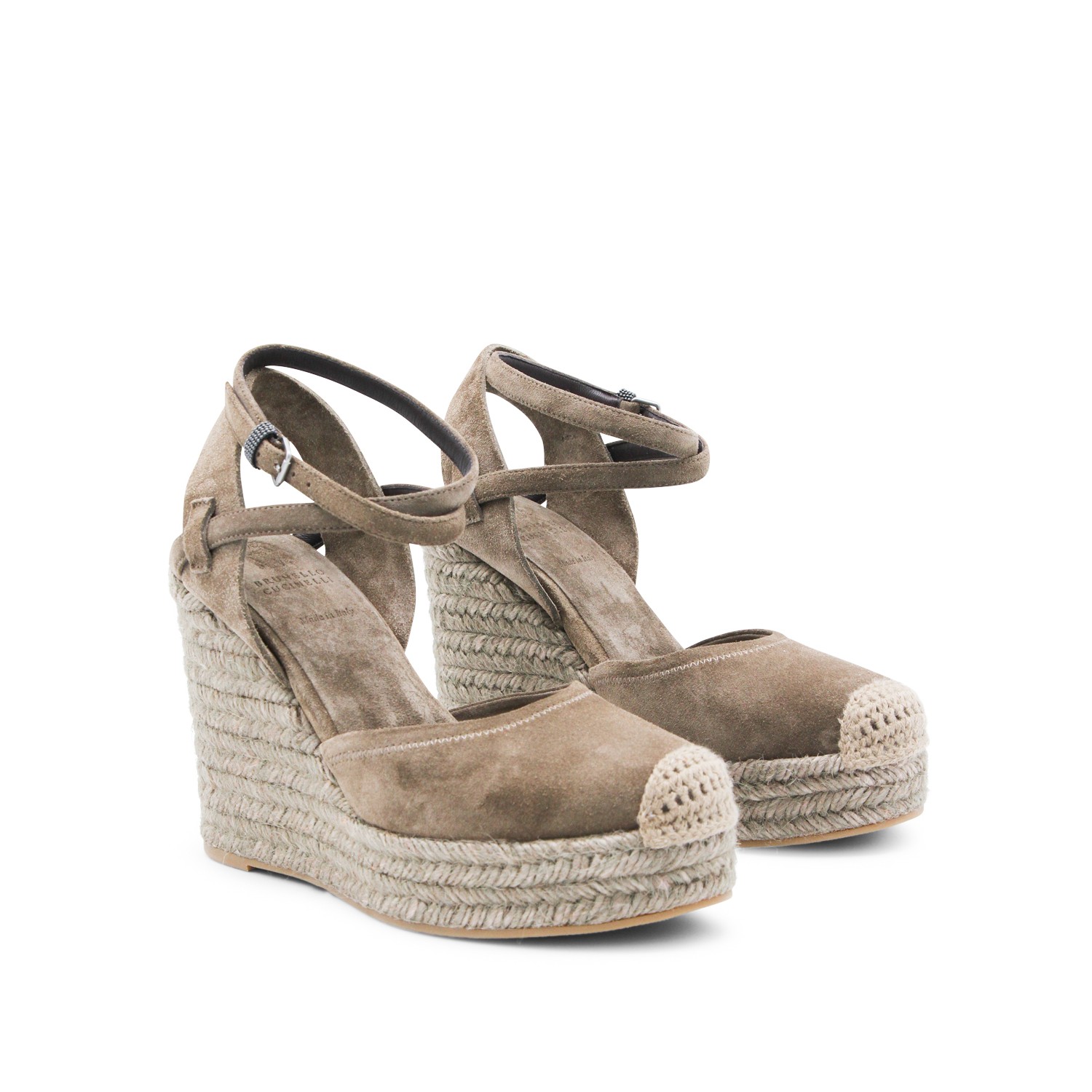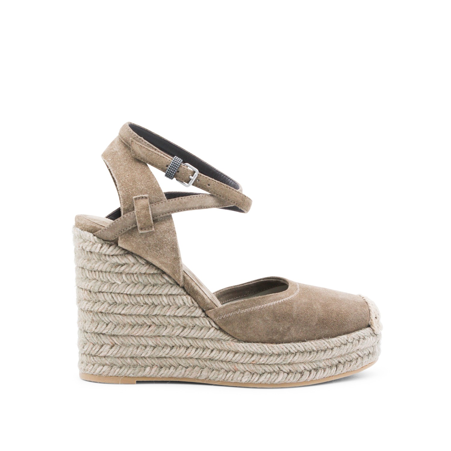 Beige leather espadrillas from Brunello Cucinelli featuring round toe, ankle buckle fastening, wedge with raffia and leather sole.