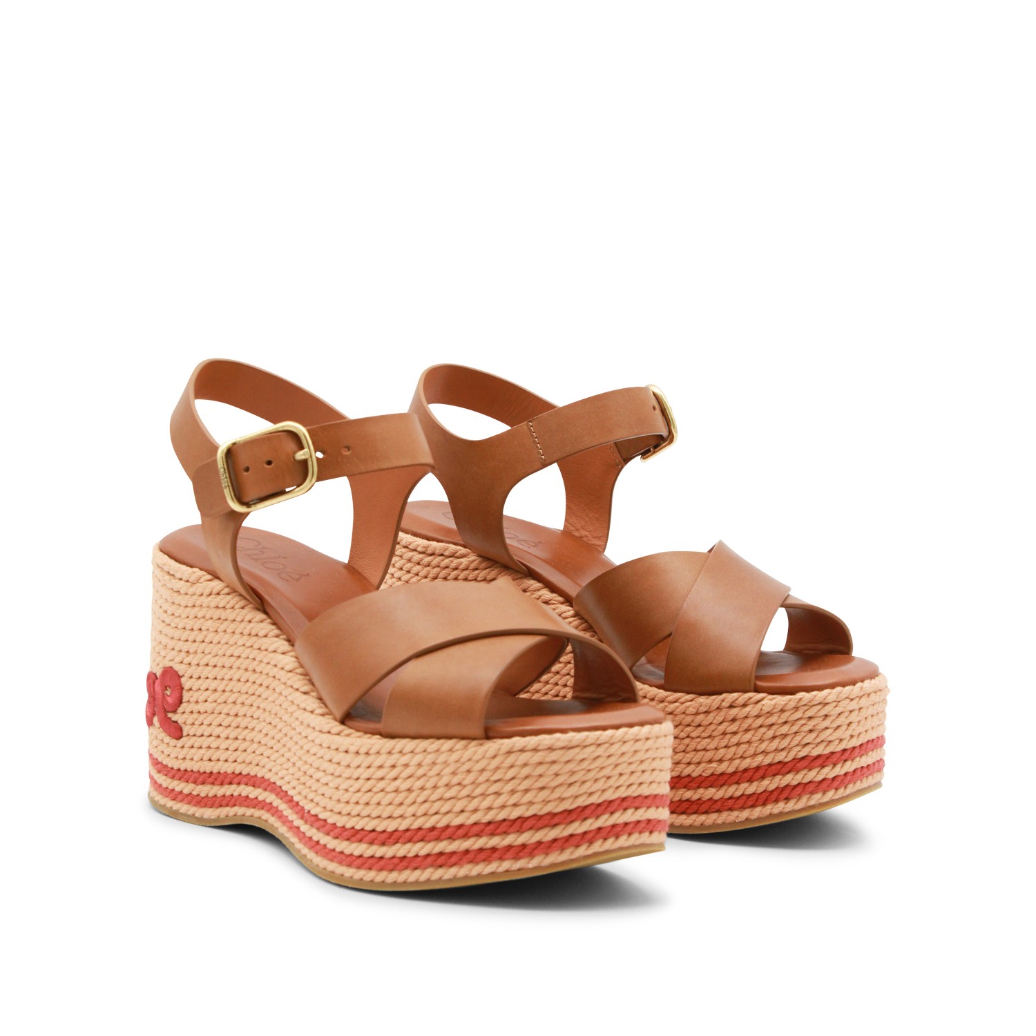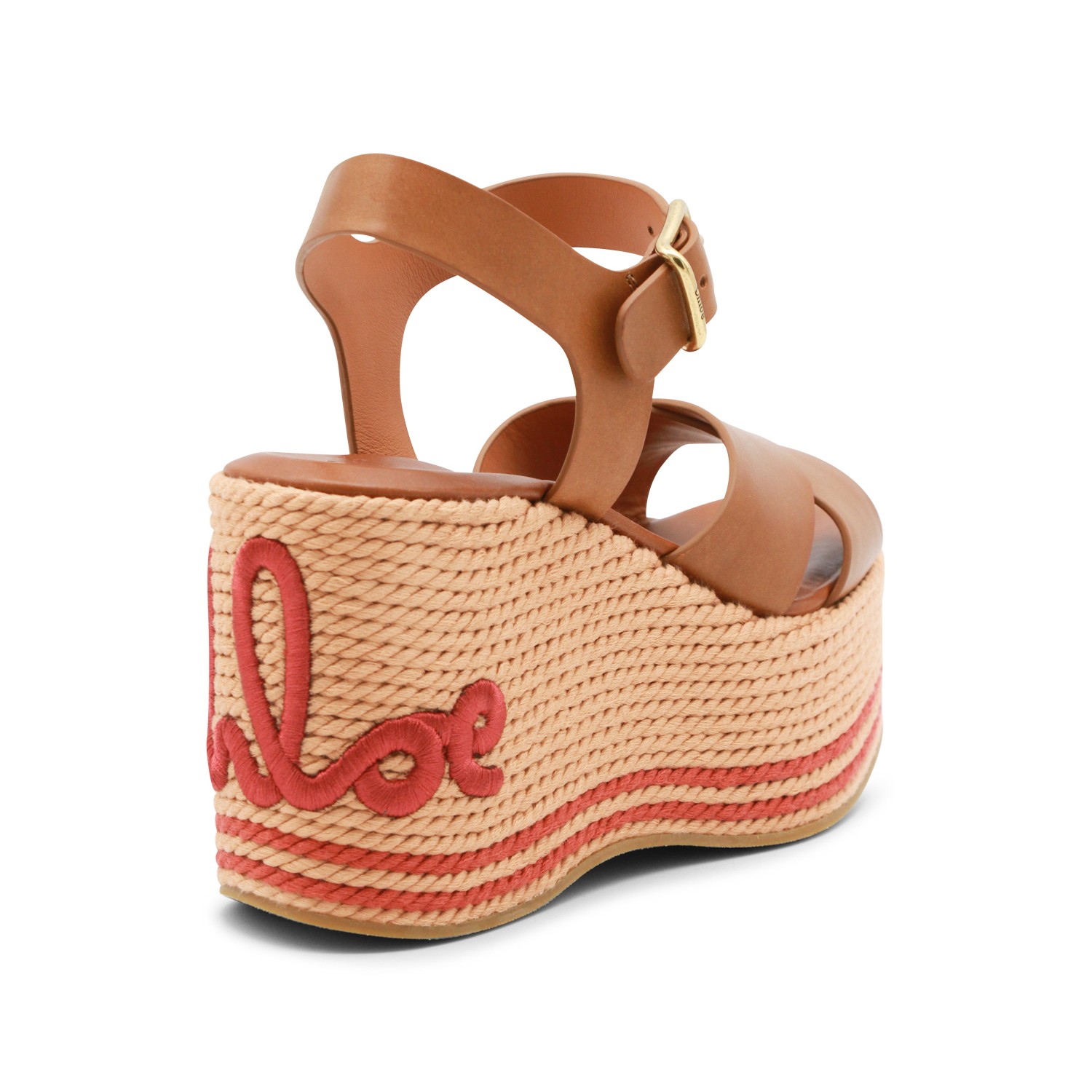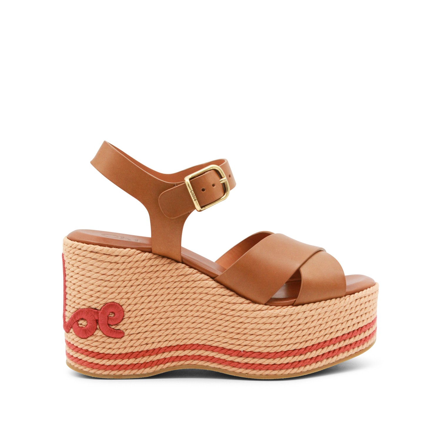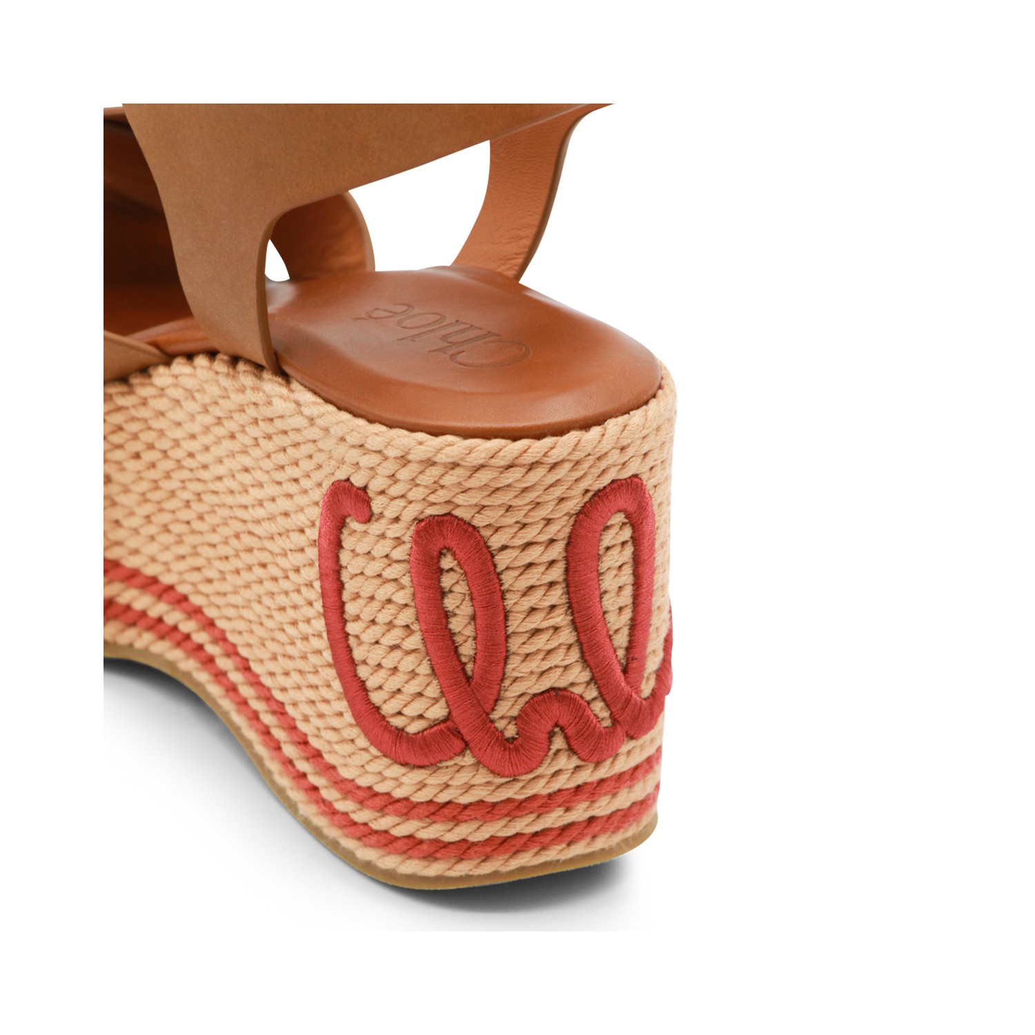 Brown and red leather espadrillad from Chlofeaturing open round toe, front crossed straps, adjustable ankle strap, wedge with embroidered logo and branded insole.