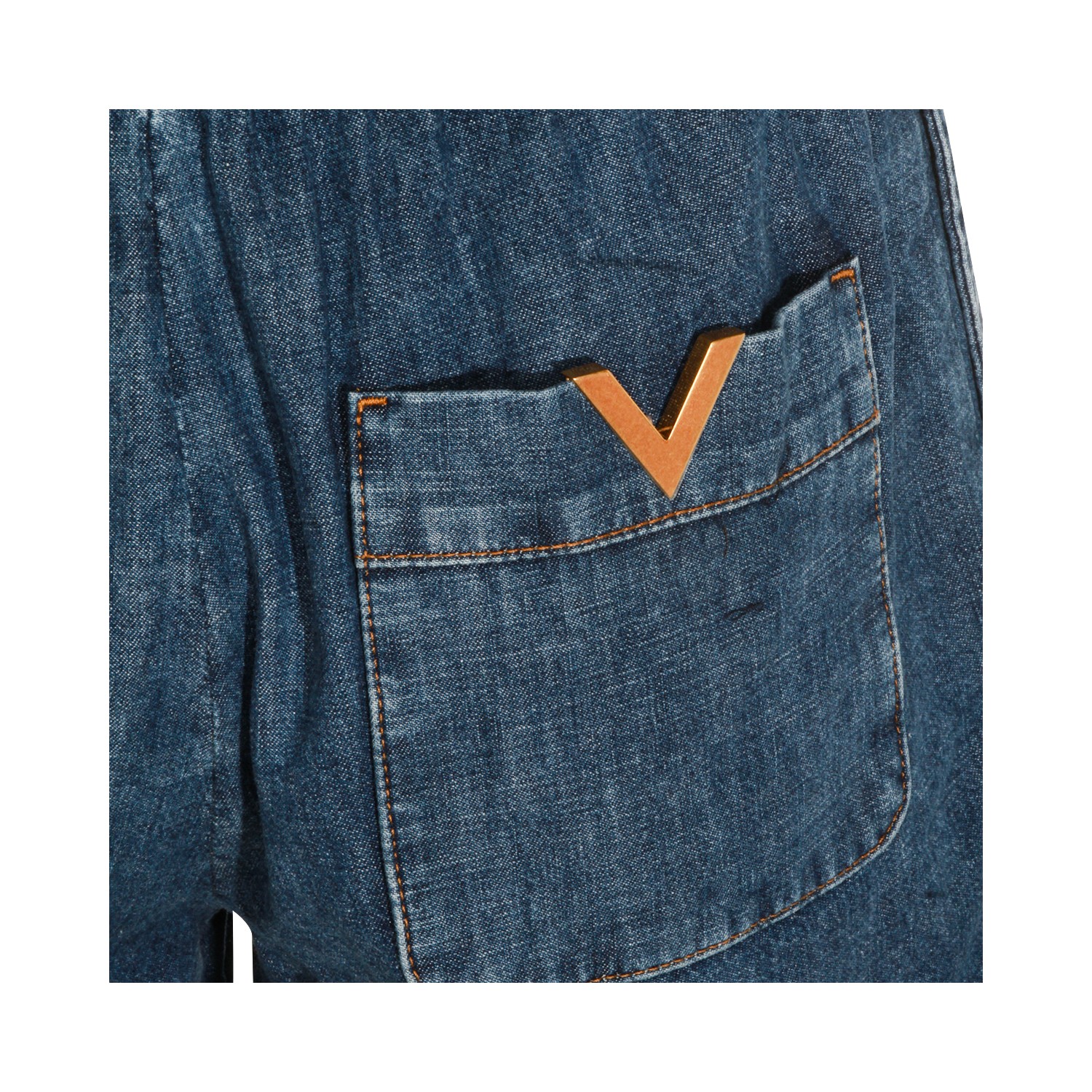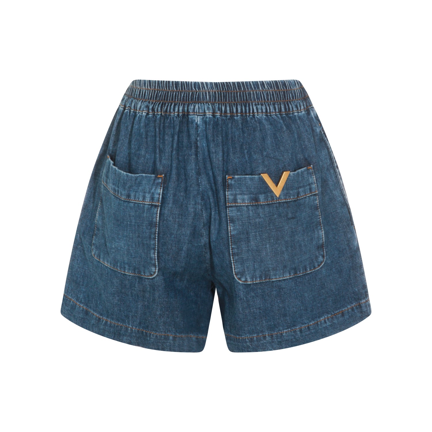 Blue cotton denim shorts from Valentino featuring elasticated waistband, back pockets, gold metal V detail and regular fit.