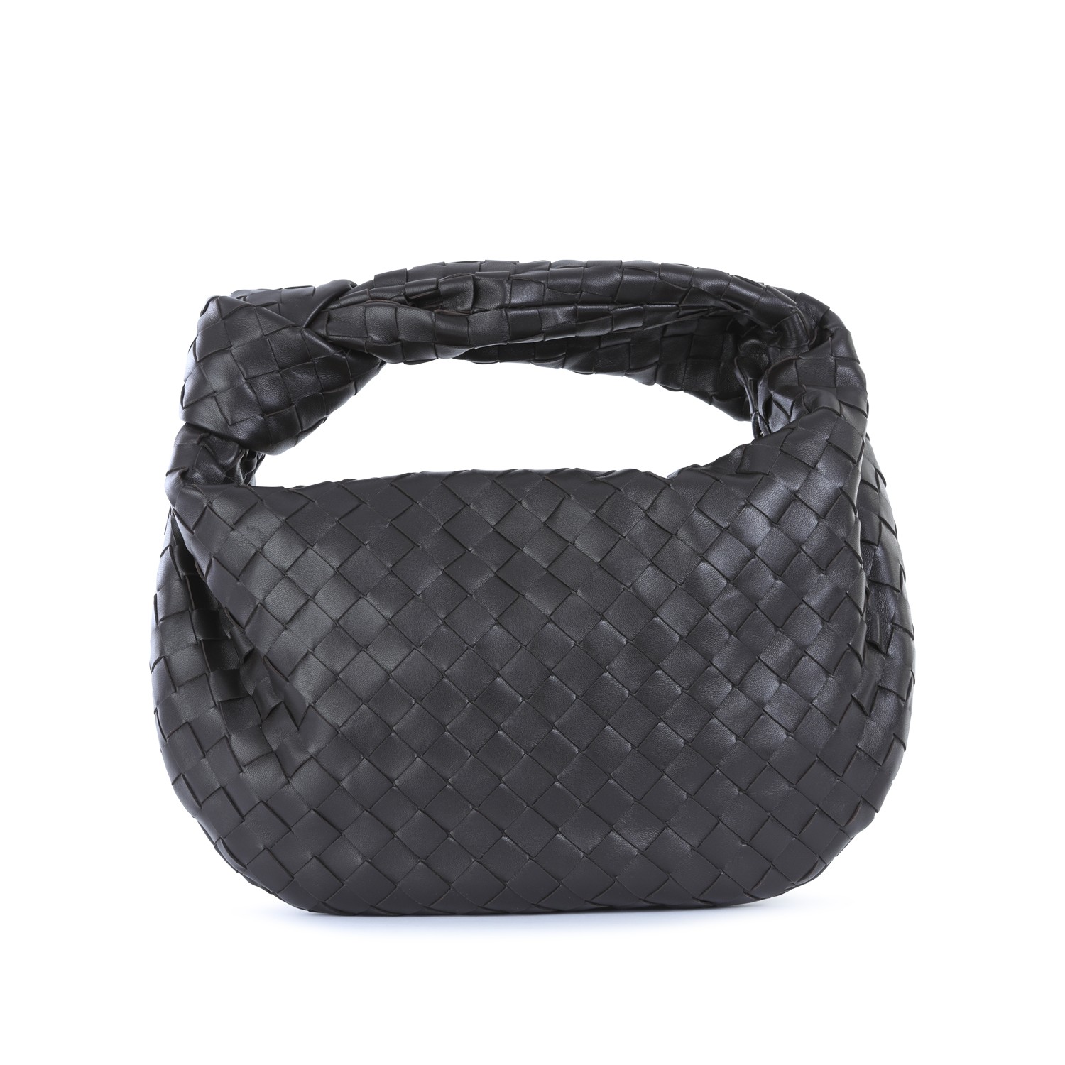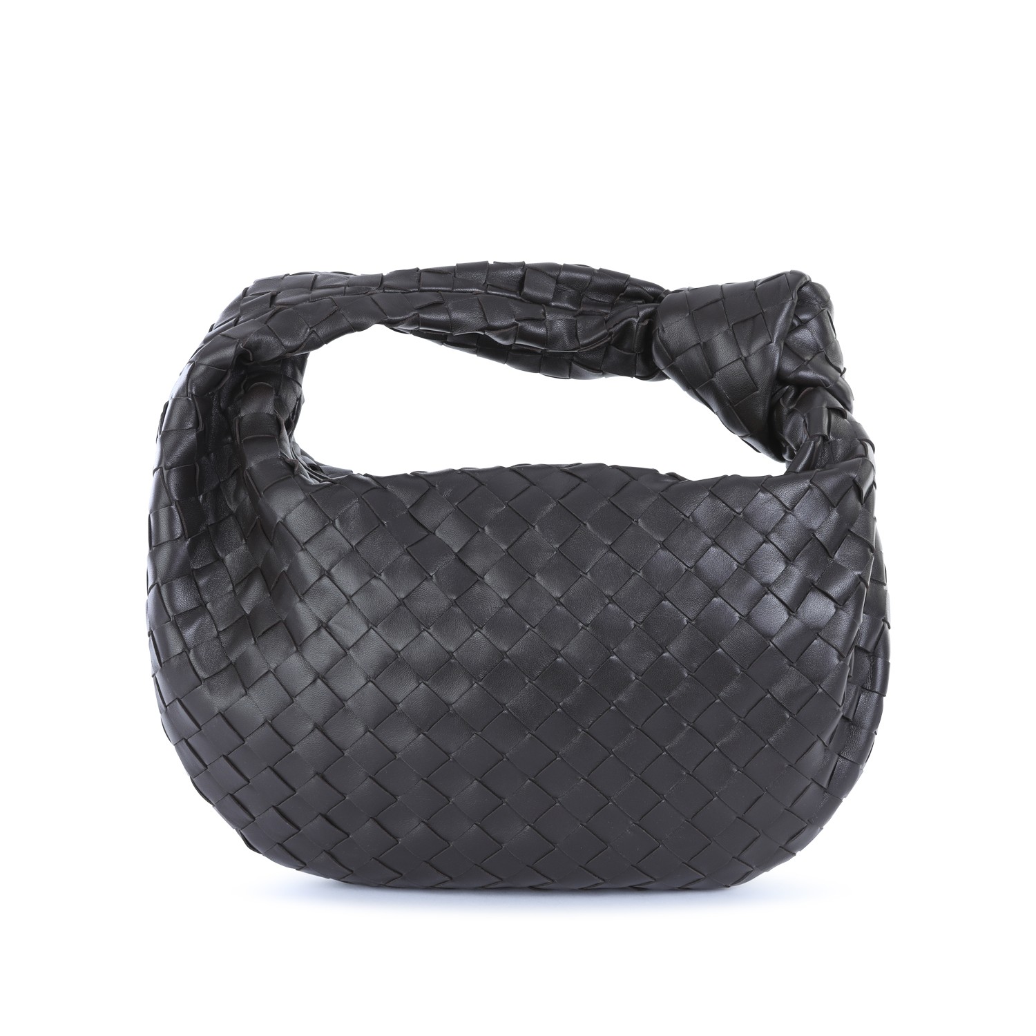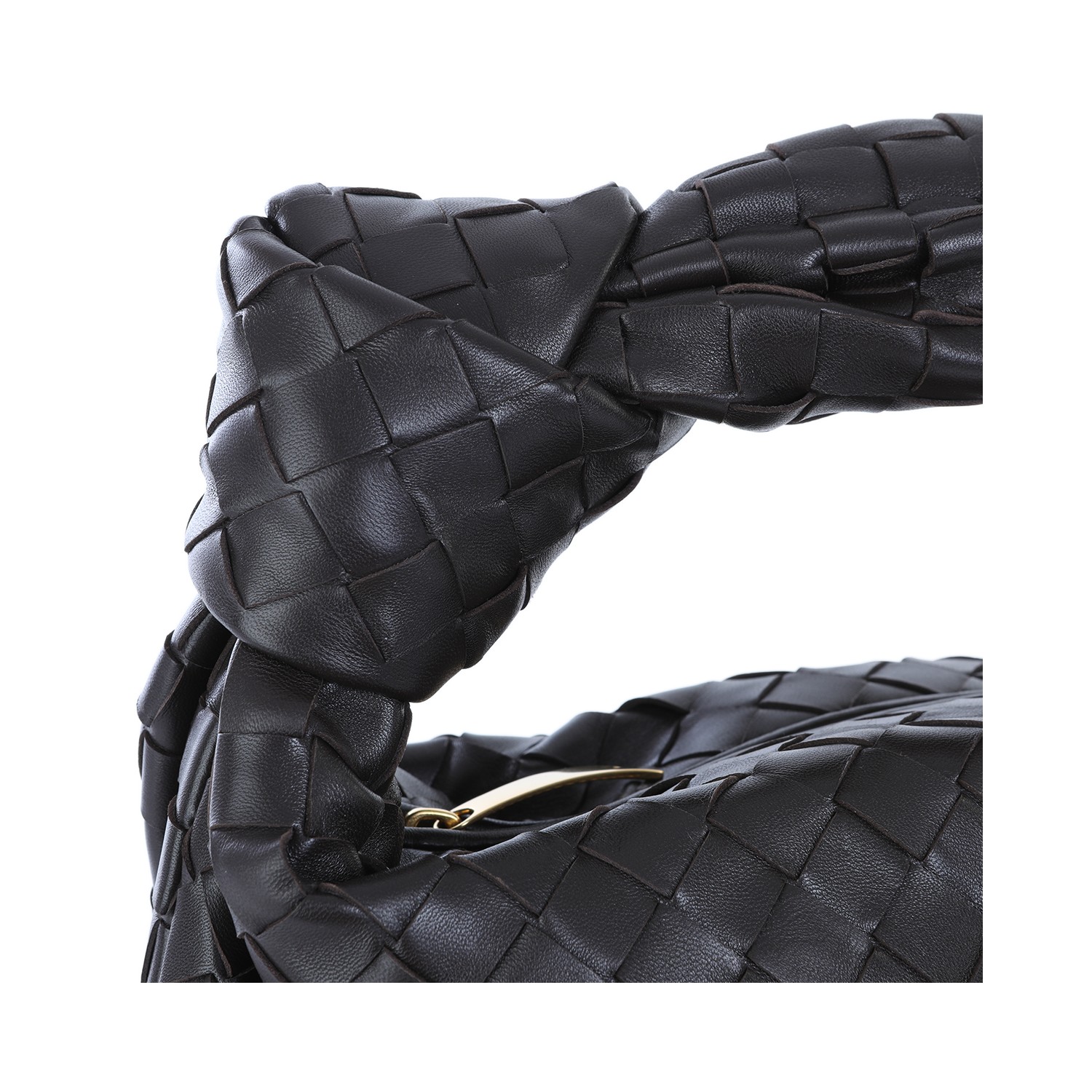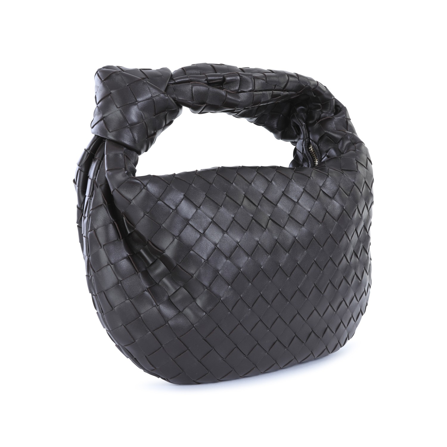 Dark brown leather Jodie shoulder bag from Bottega Veneta featuring Intreccio motif, zip closure, knot detail, main compartment and gold tone metal hardware.