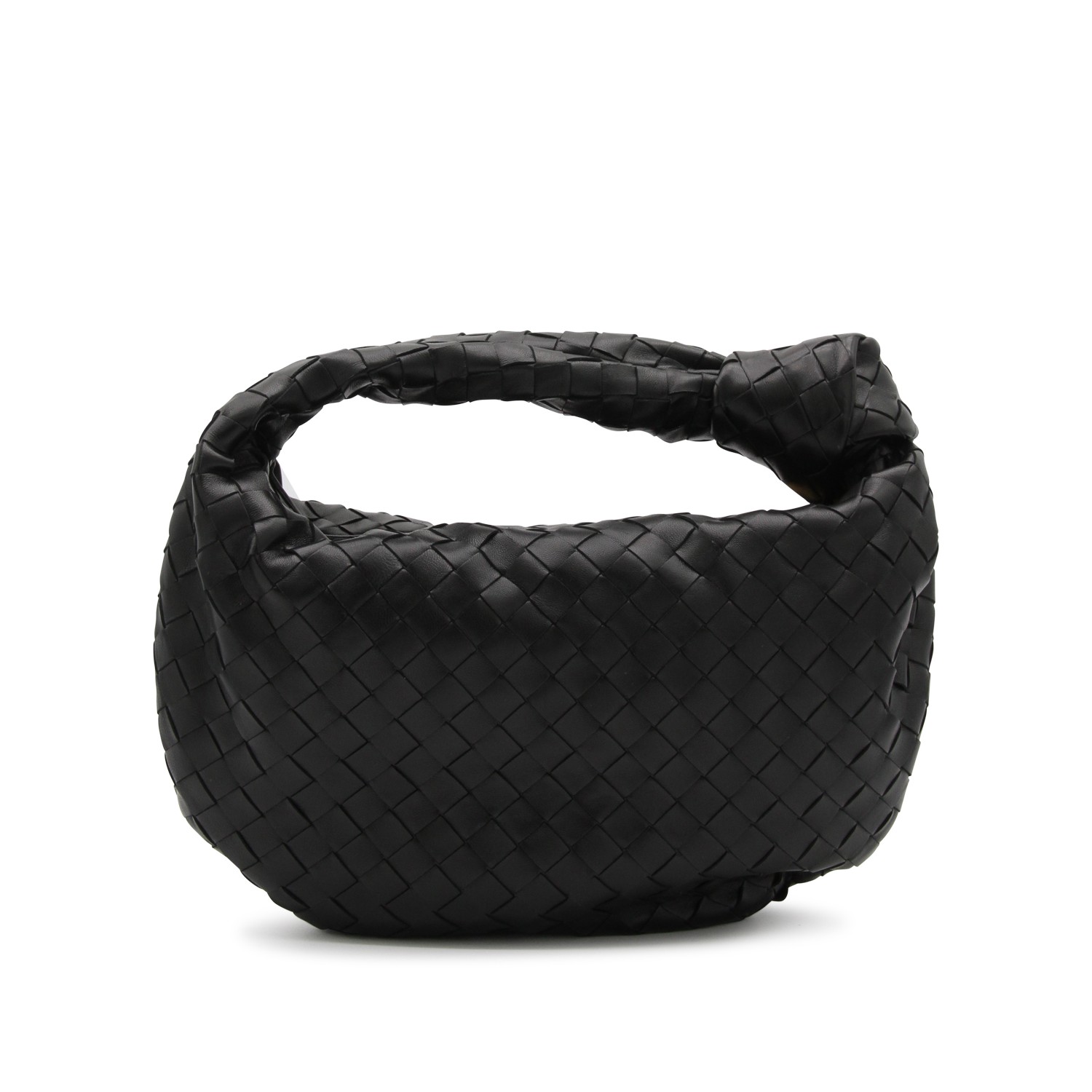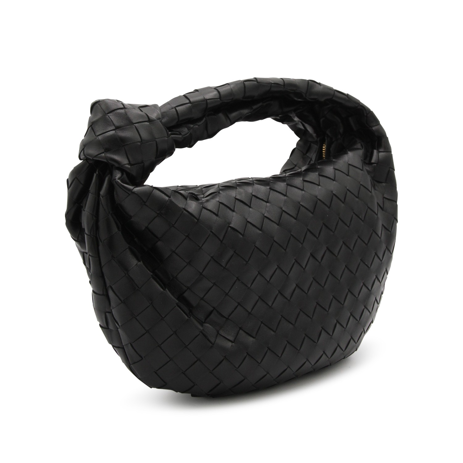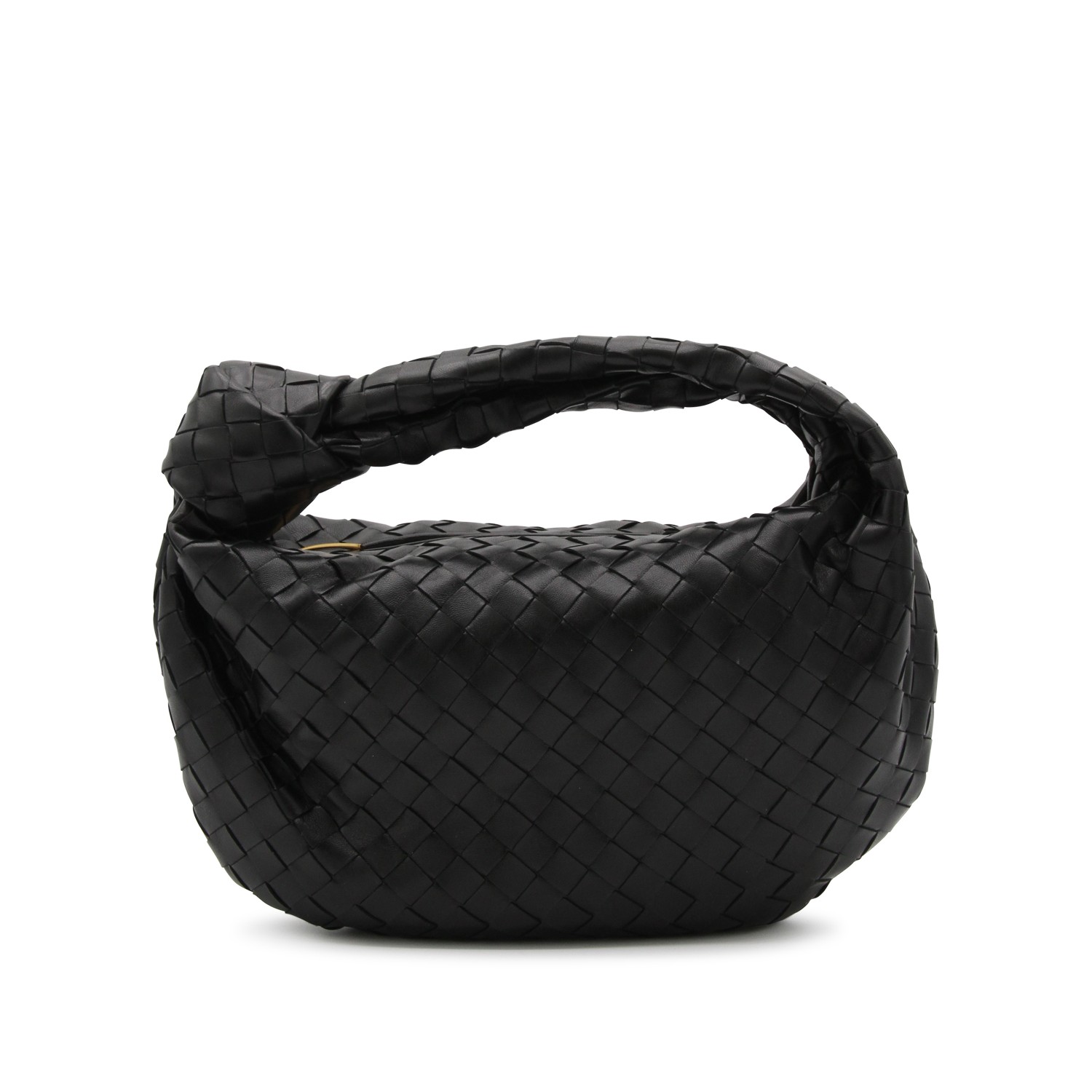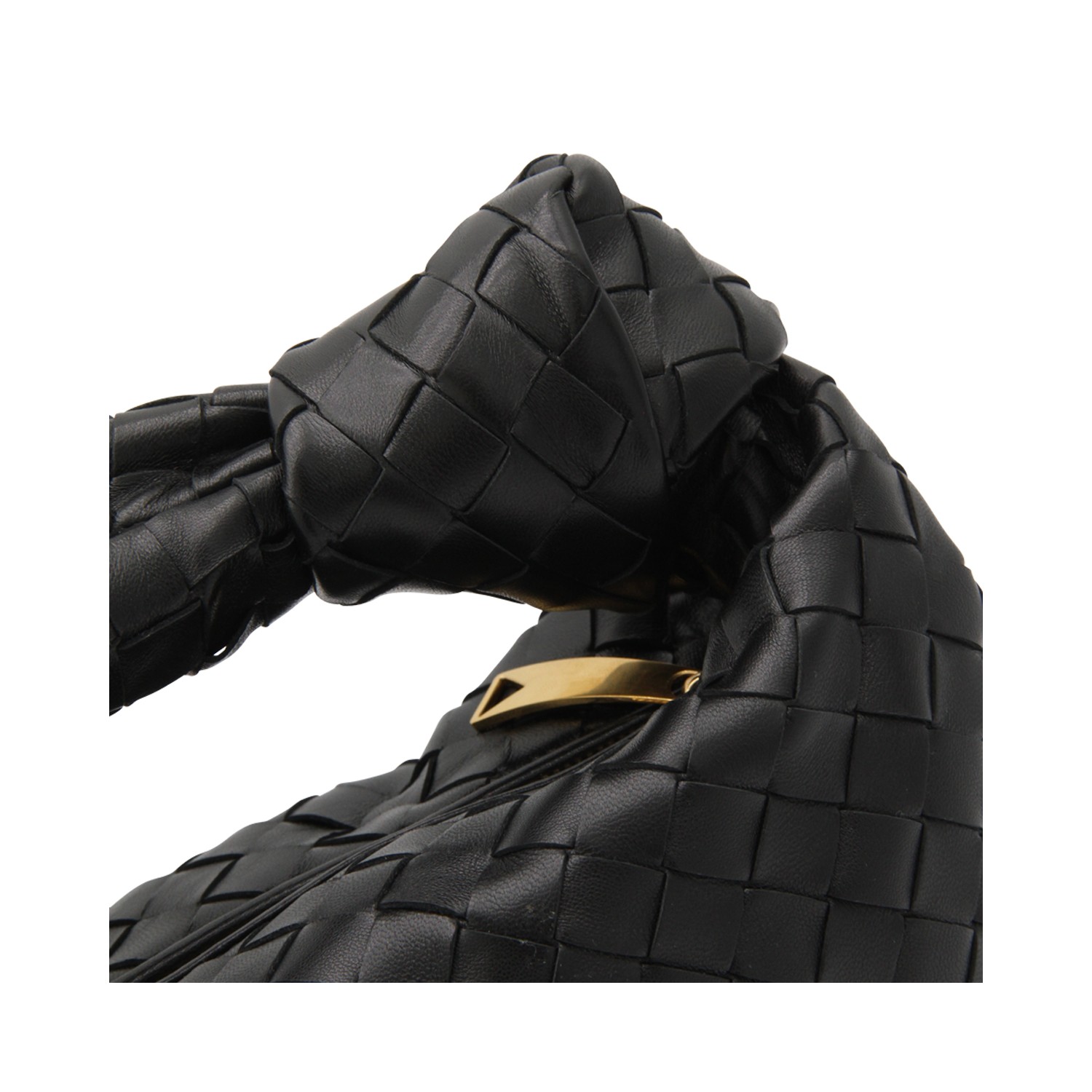 Black gold leather Teen Jodie top handle bag from Bottega Veneta featuring Teen Intrecciato leather texture, zip closure, gold tone metal finishes and main compartment.