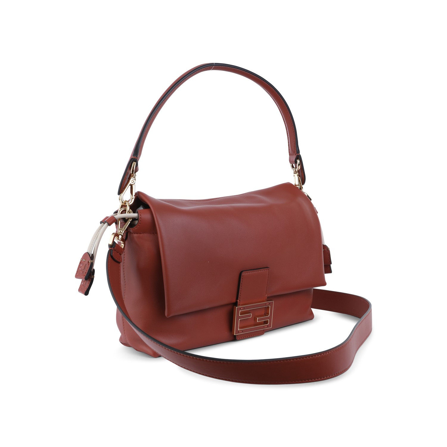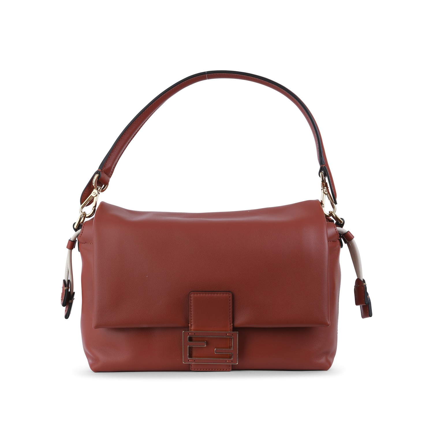 Brown leather Mamma Baguette medium shoulder bag from Fendi featuring top handle, FF buckle, foldovertop with magnetic closure, drawstring and main compartment.