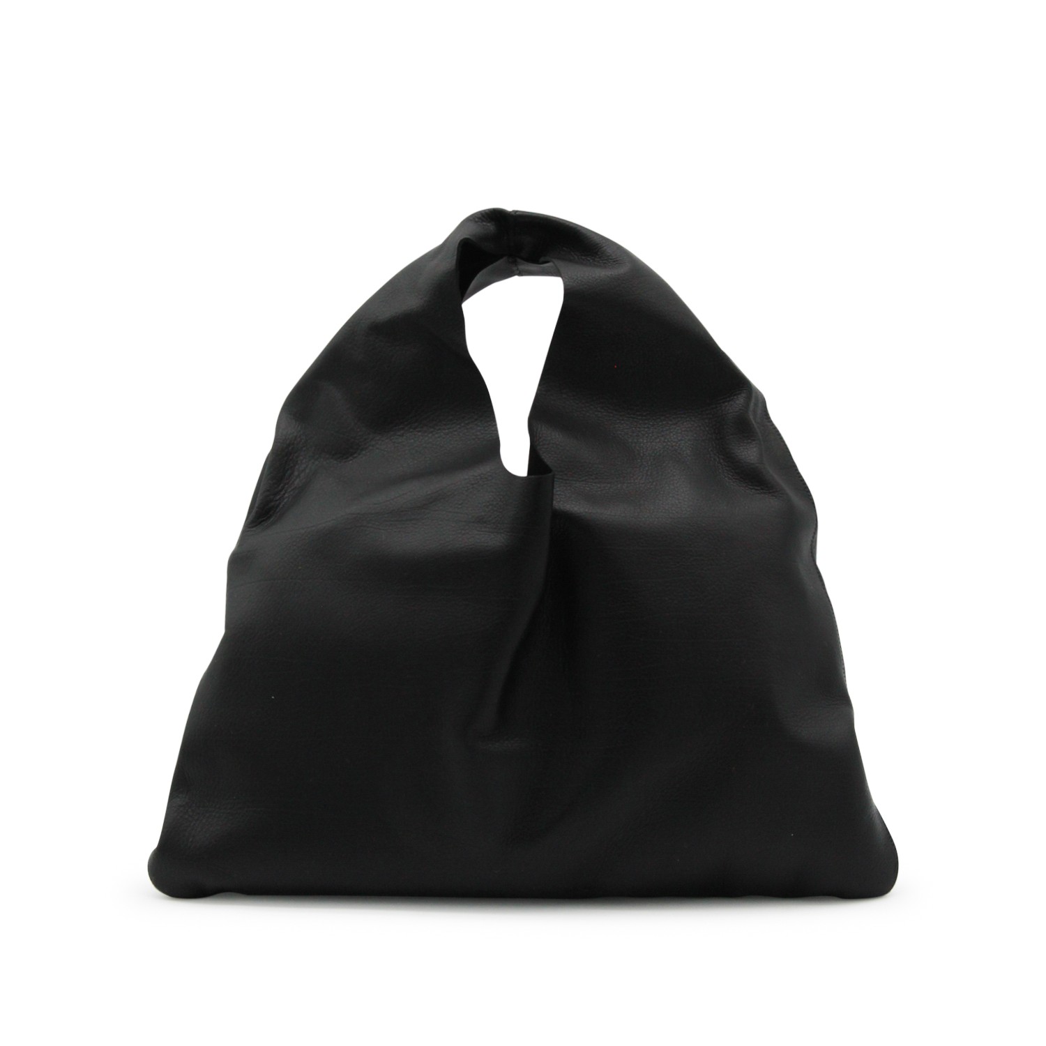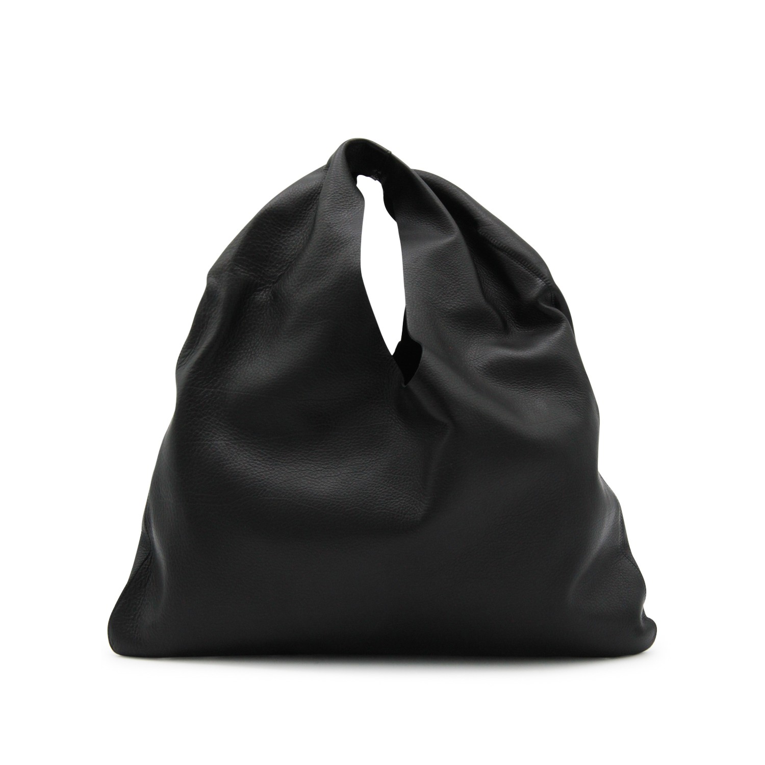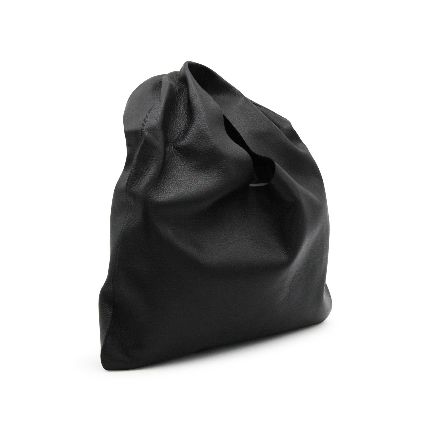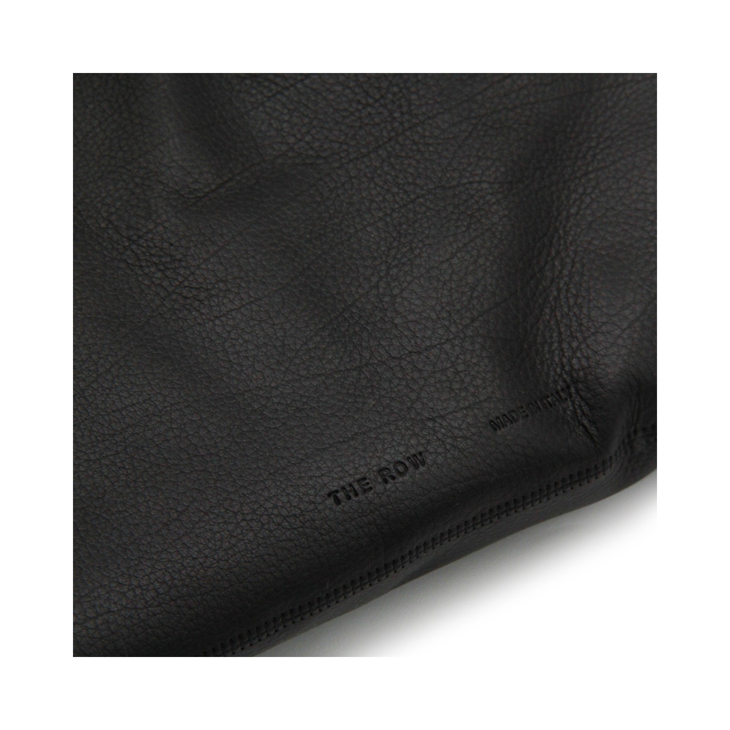 Black leather Bidle small shoulder bag from The Row featuring one top handle, open top, logo and main compartment.