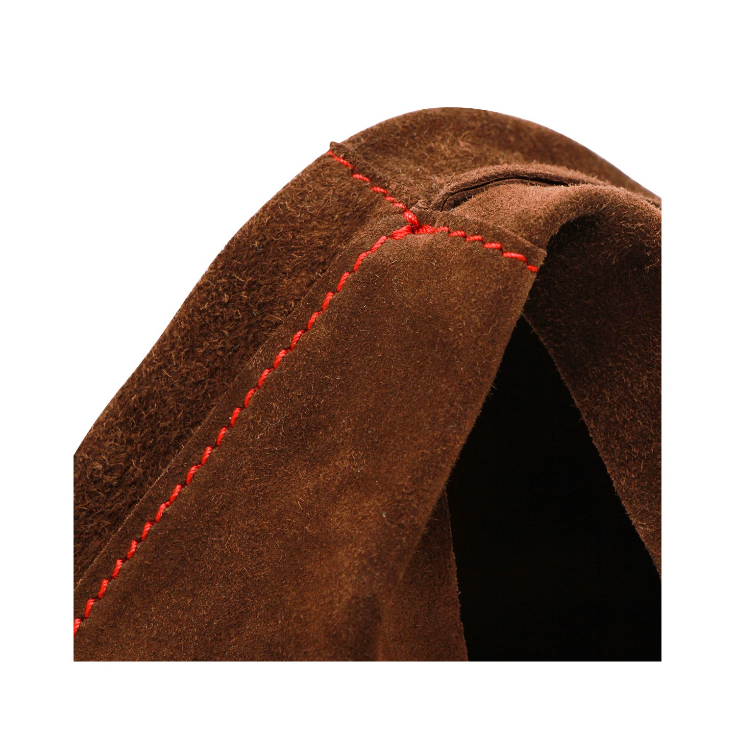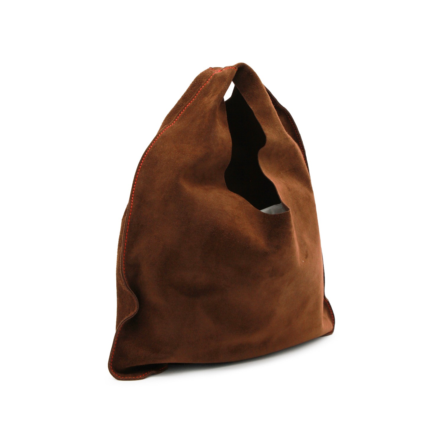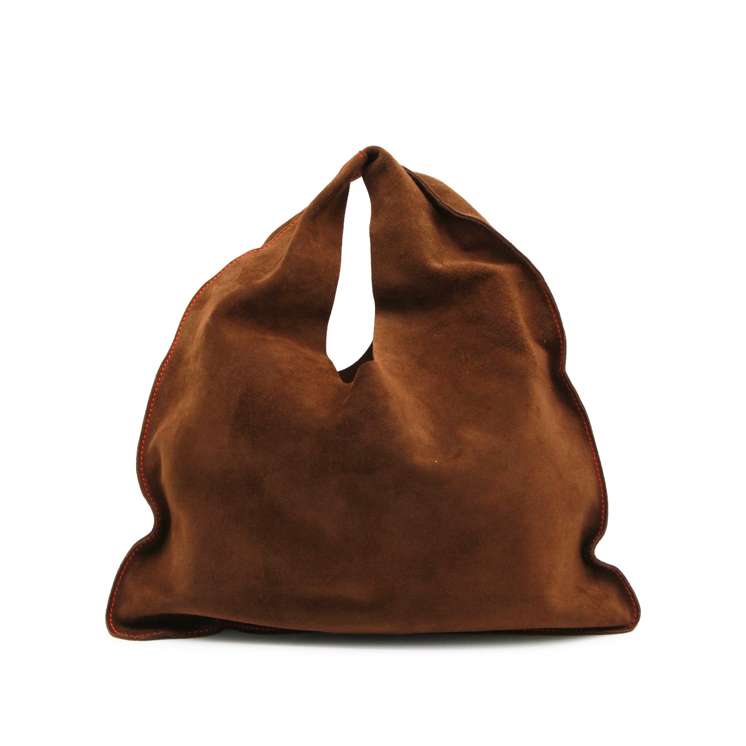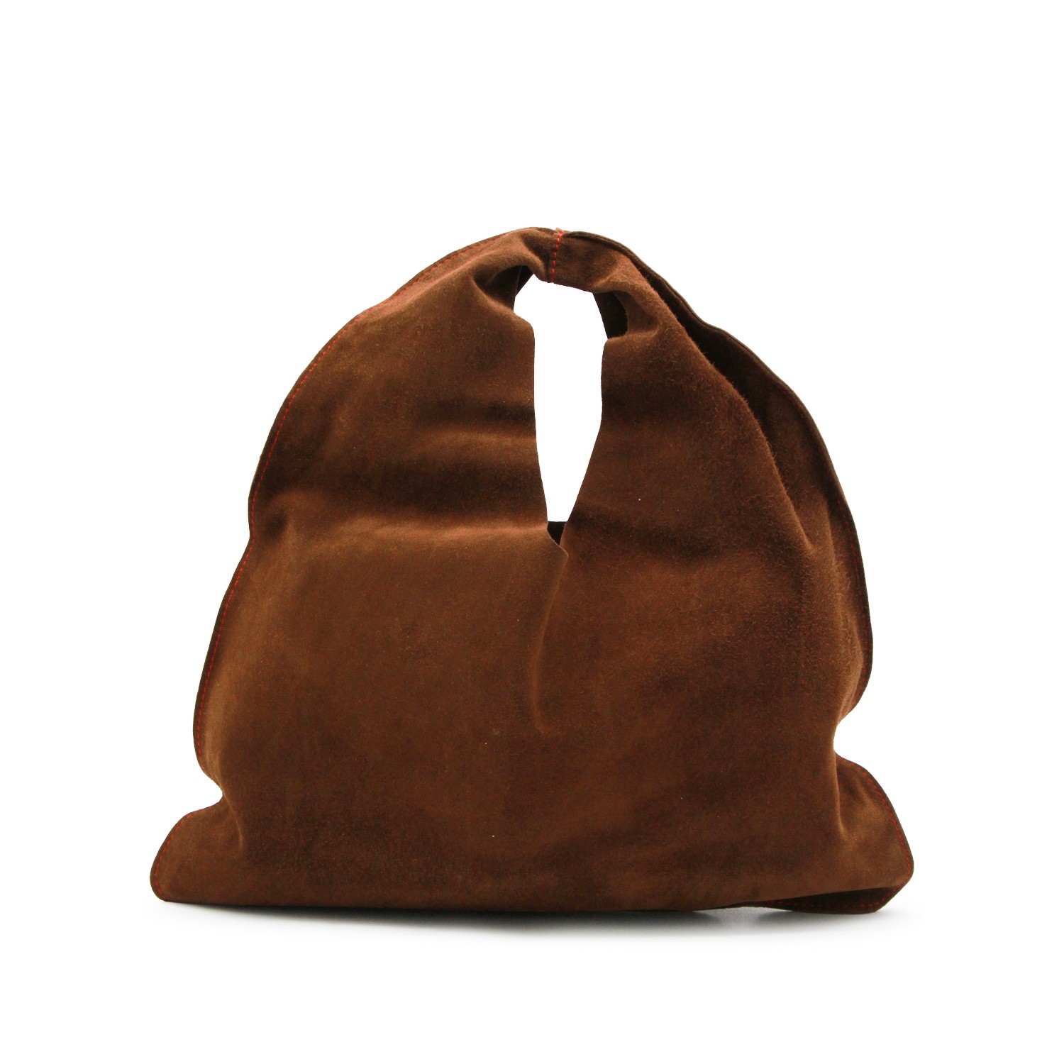 Brown leather small Bindle shoulder bag from The Row featuring draped handle, suede, main compartment and single interior pocket.