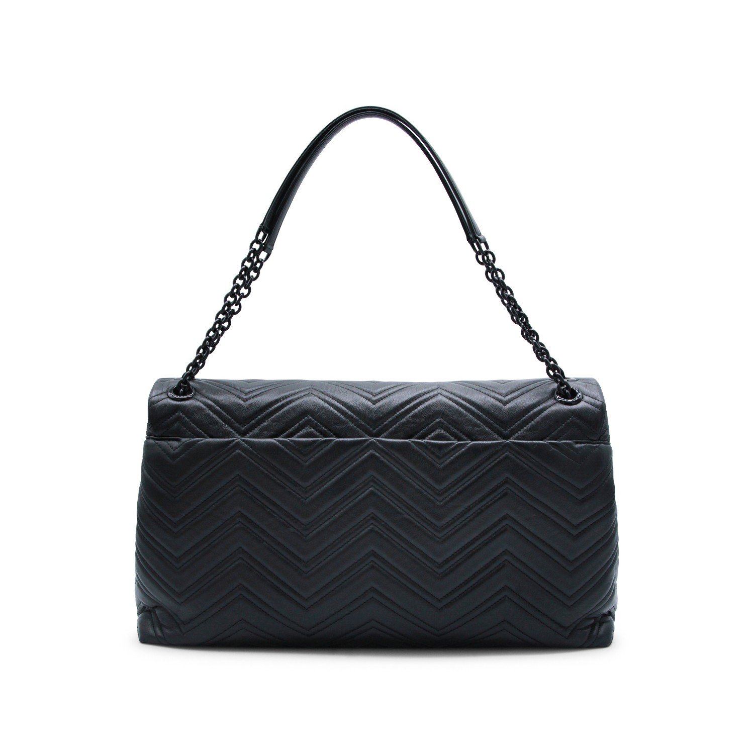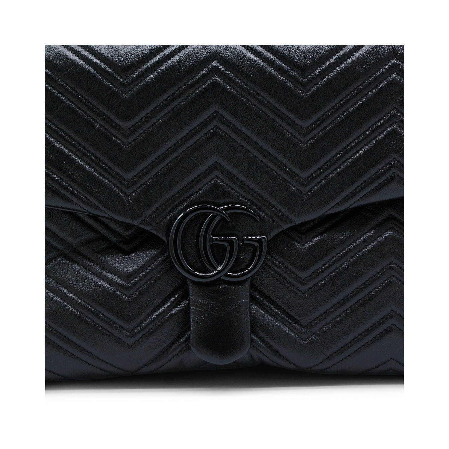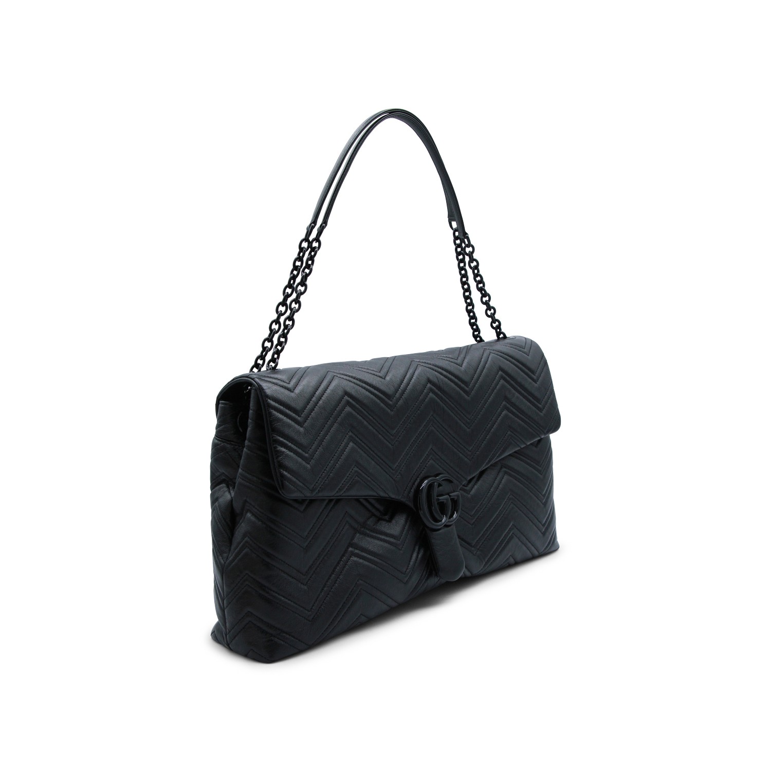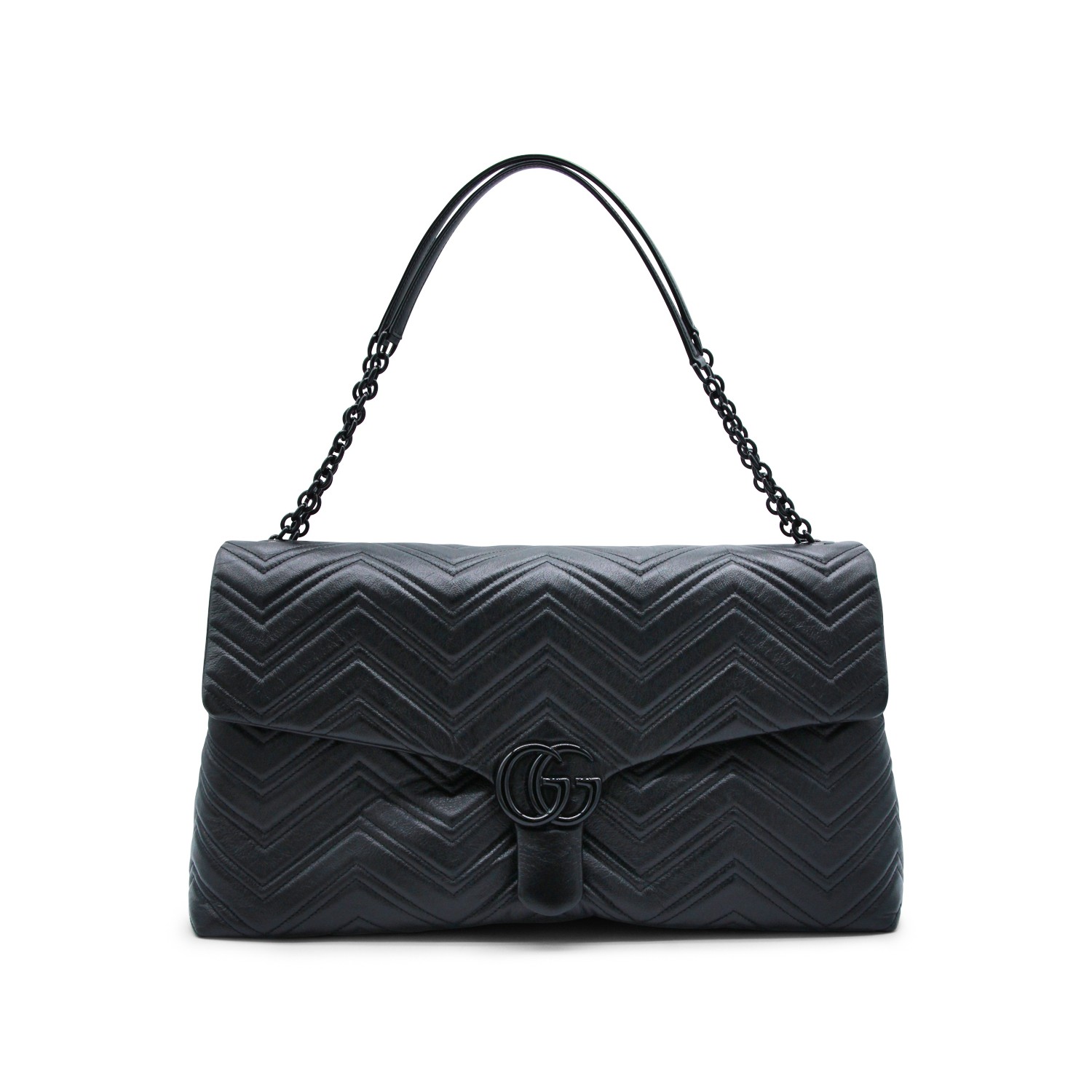 Black leather GG Marmont maxi shoulder bag from Gucci featuring chevron pattern, tone on tone hardware, GG frontal logo, foldover top with magnetic closure, sliding chain shuolde strap, main compartment and internal zip pocket.