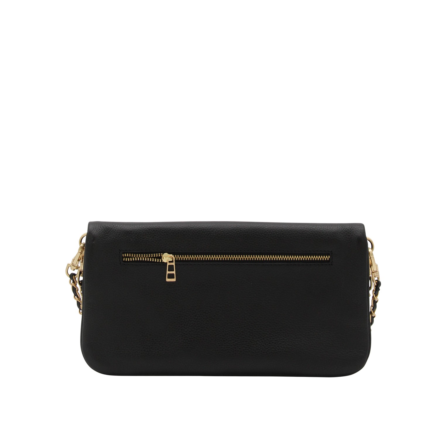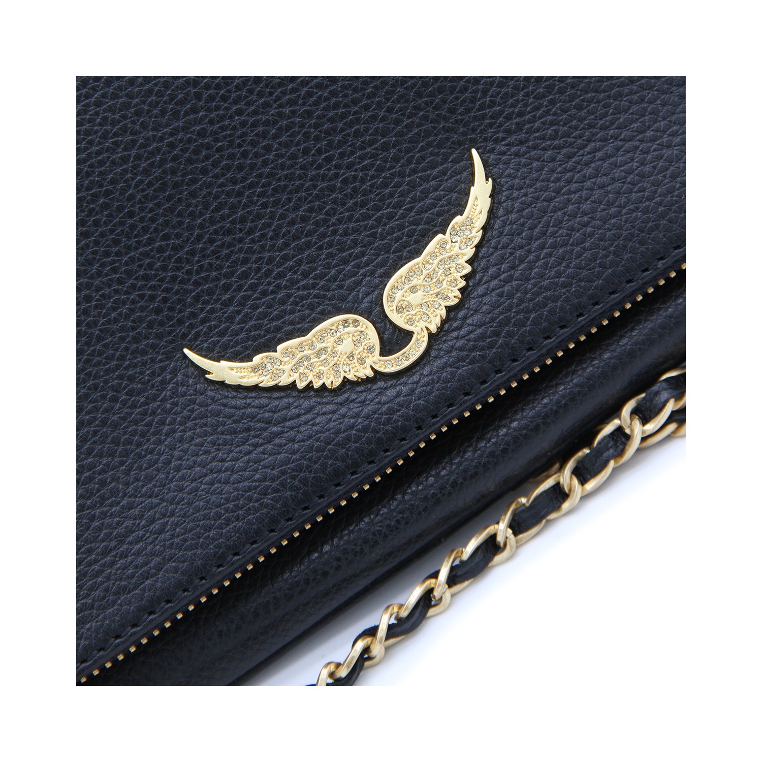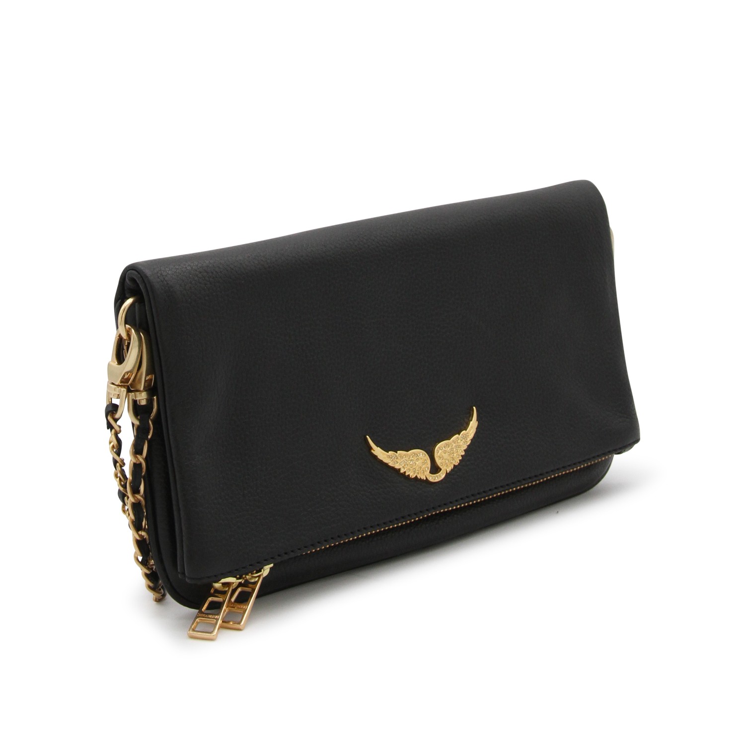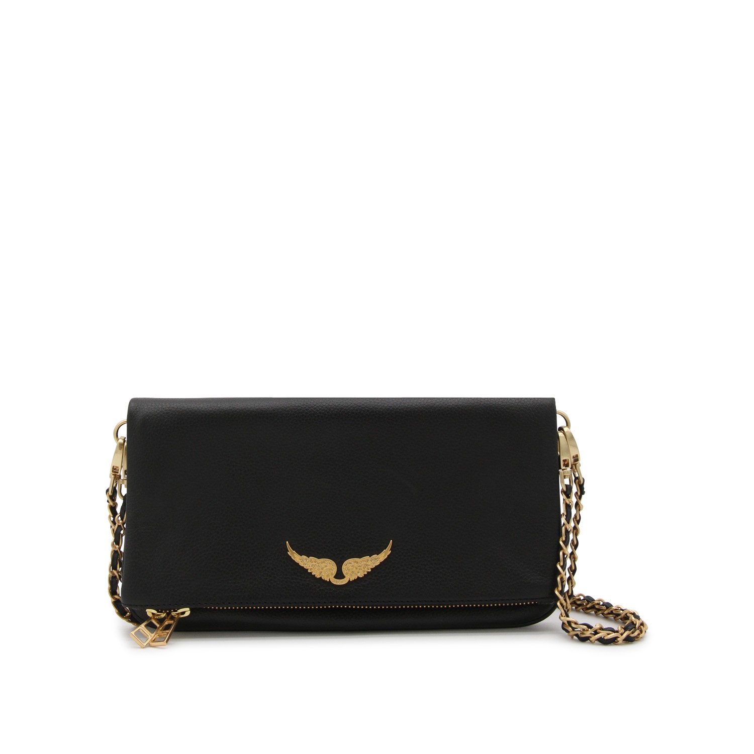 Black and gold leather shoulder bag from Zadig&Voltaire featuring zip pocket, frontal logo, chain, magnetic fastening and details.