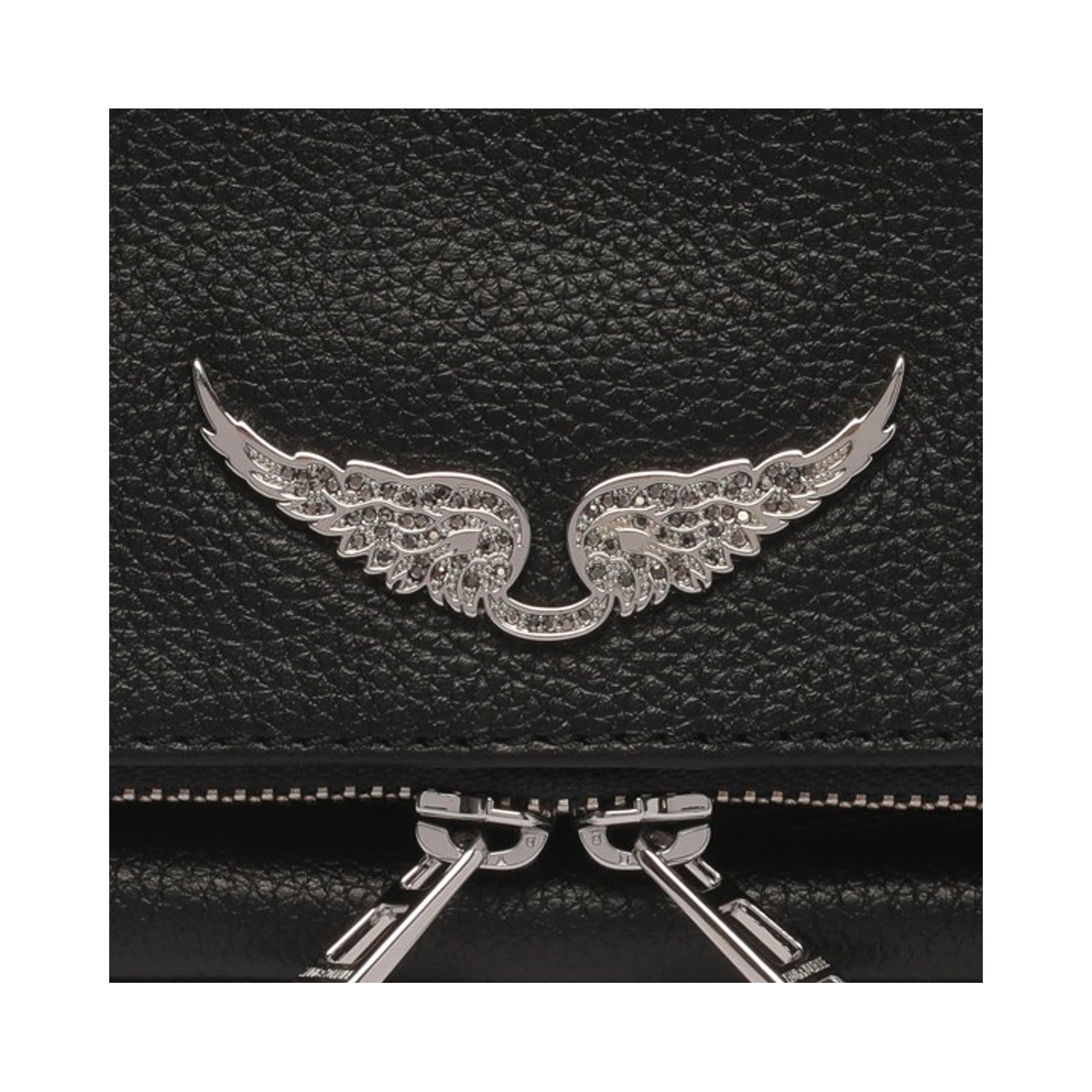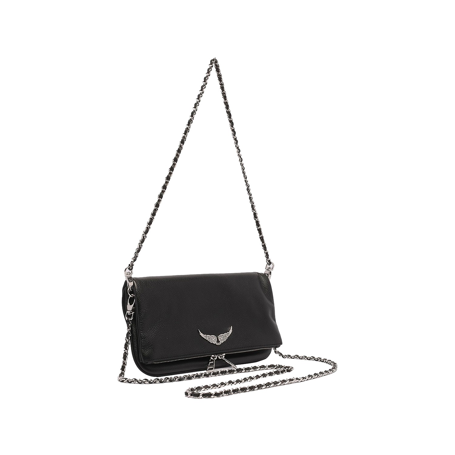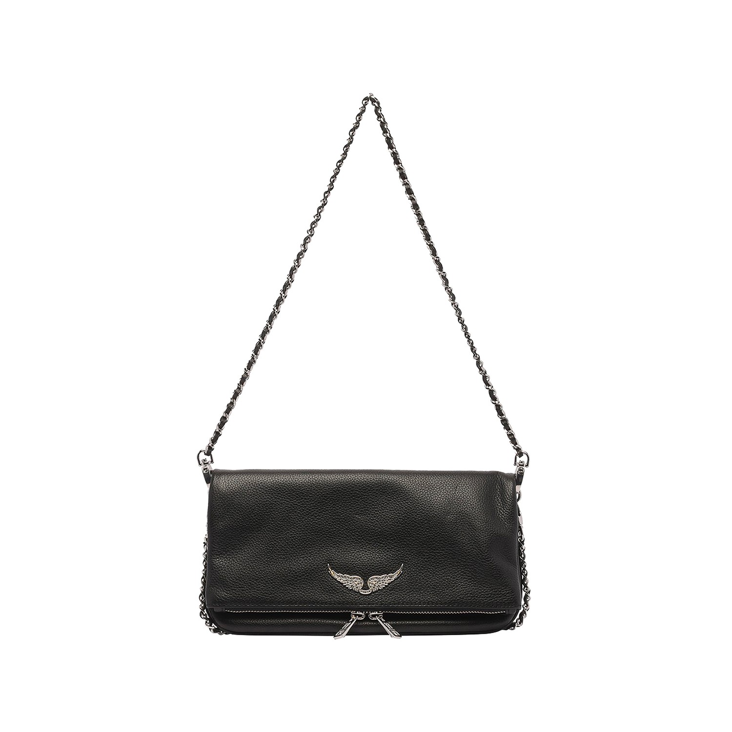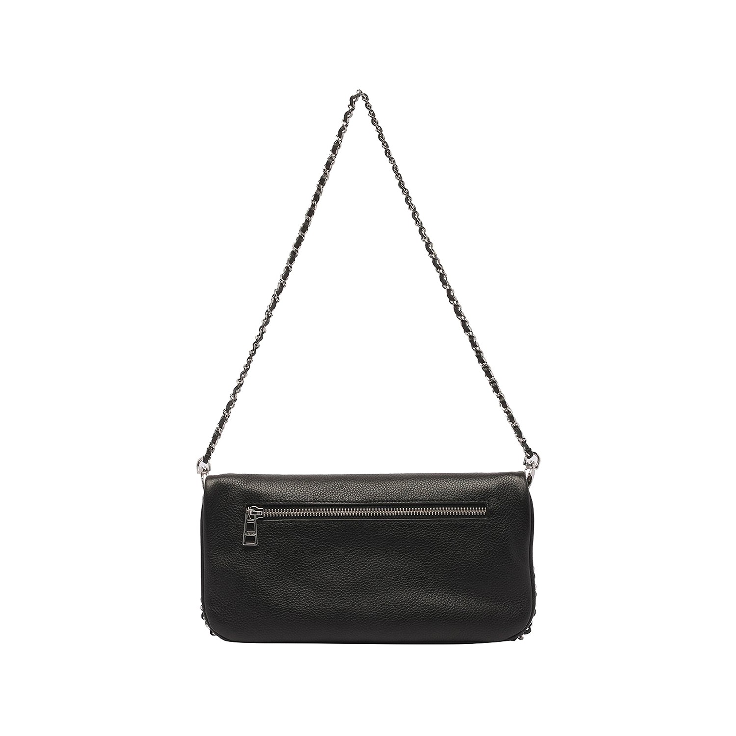 Black leather Rock shoulder bag from Zadig & Voltaire featuring chain-link shoulder strap, frontal metal logo, zip fastening and main compartment.