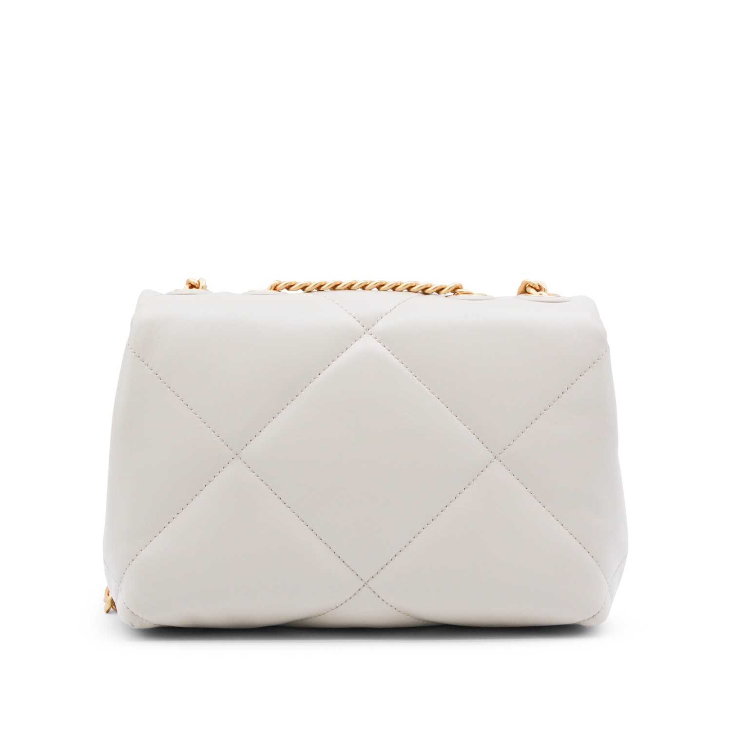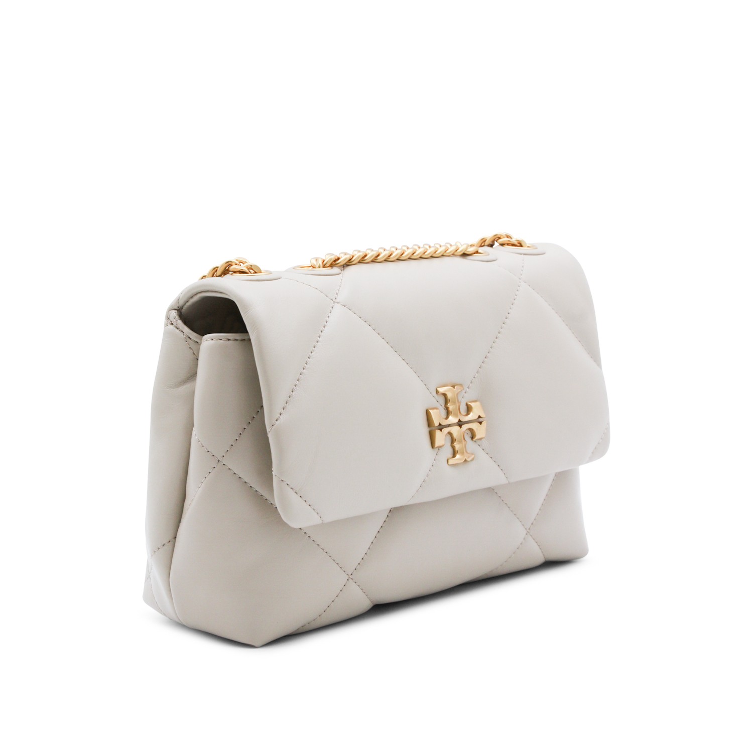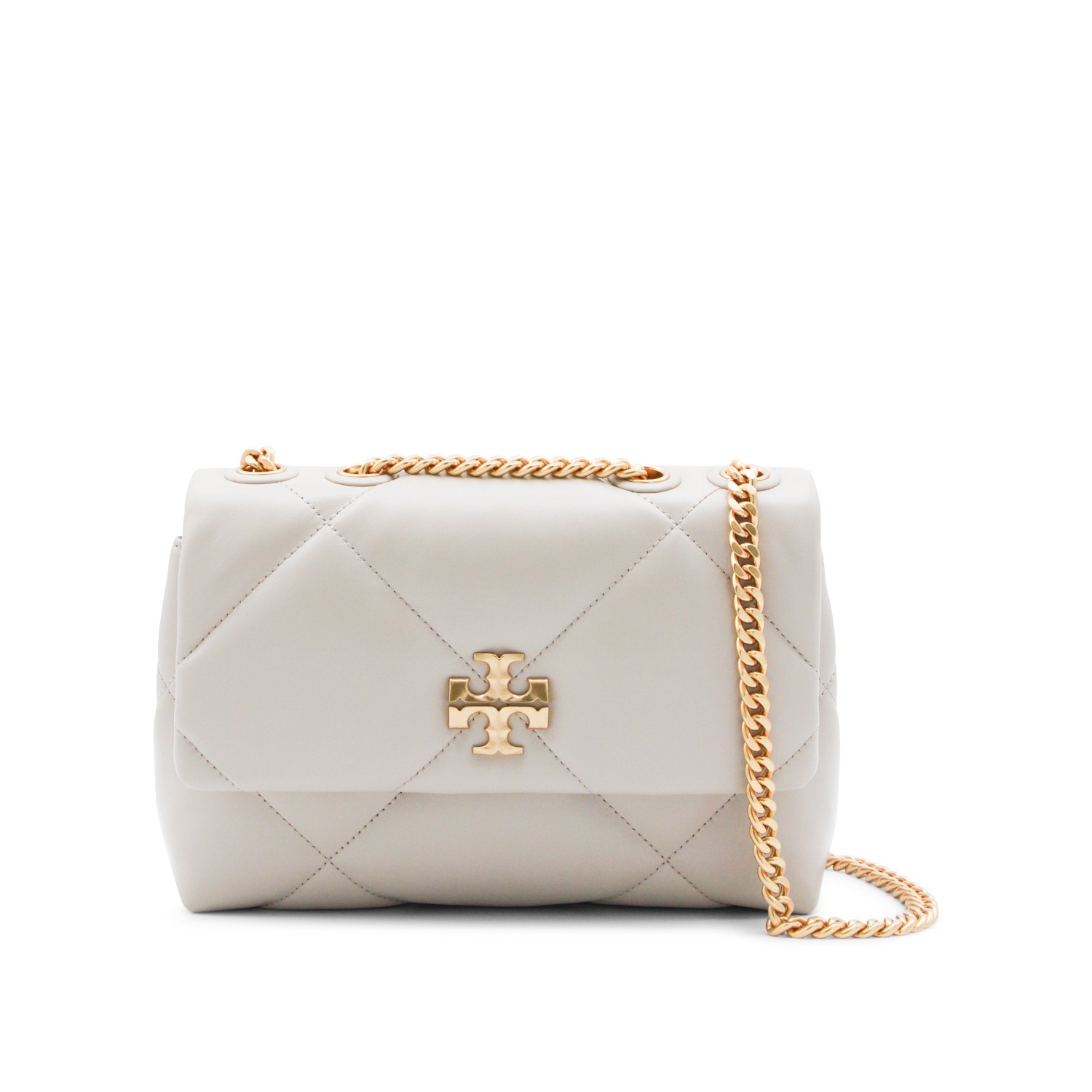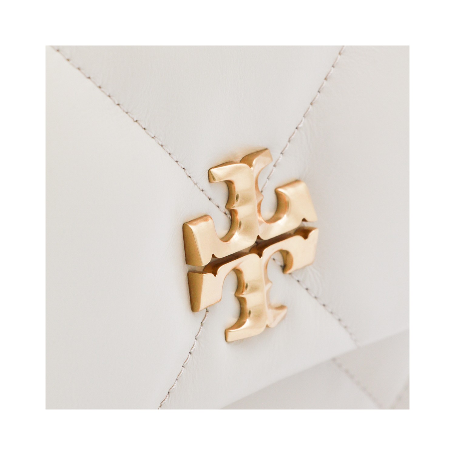 White leather shoulder bag from Tory Burch featuring frontal magneti fastening, gold tone logo and hardware, chain and inside pocket.
