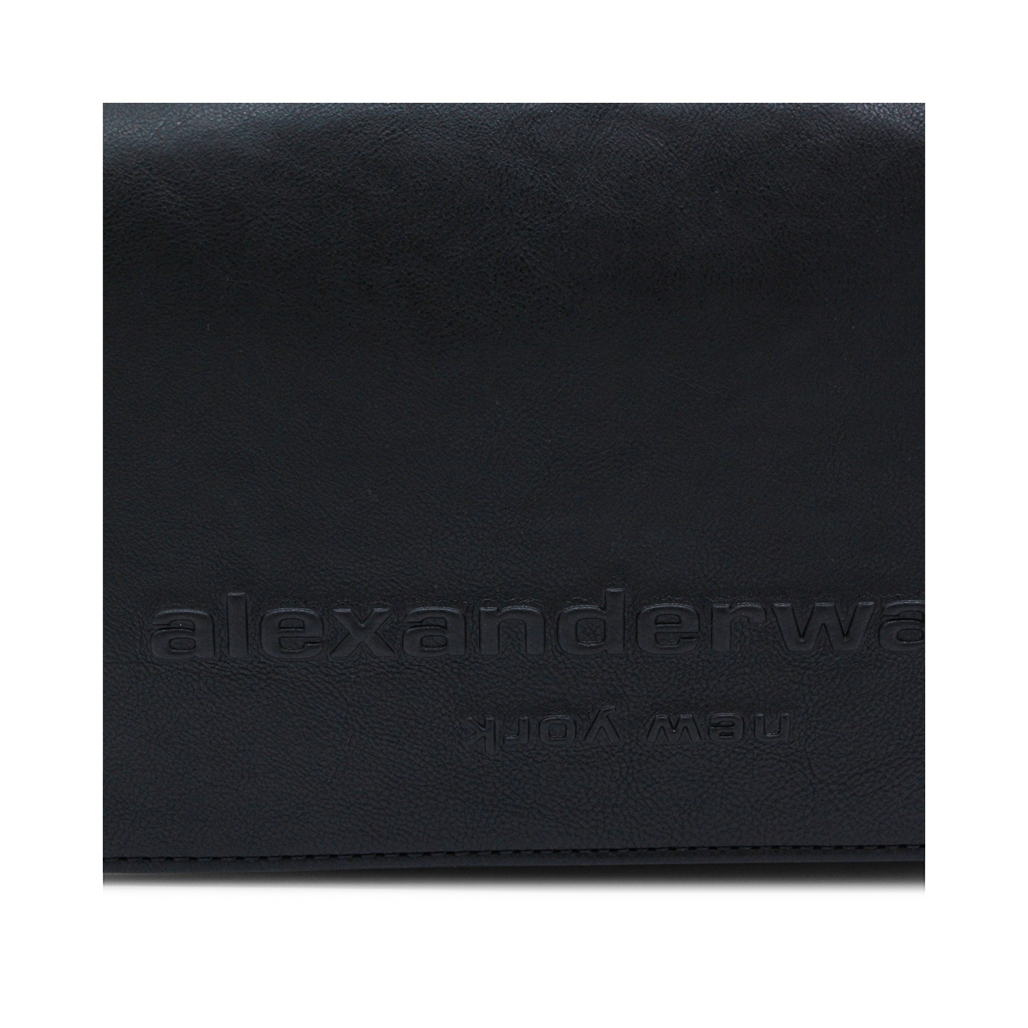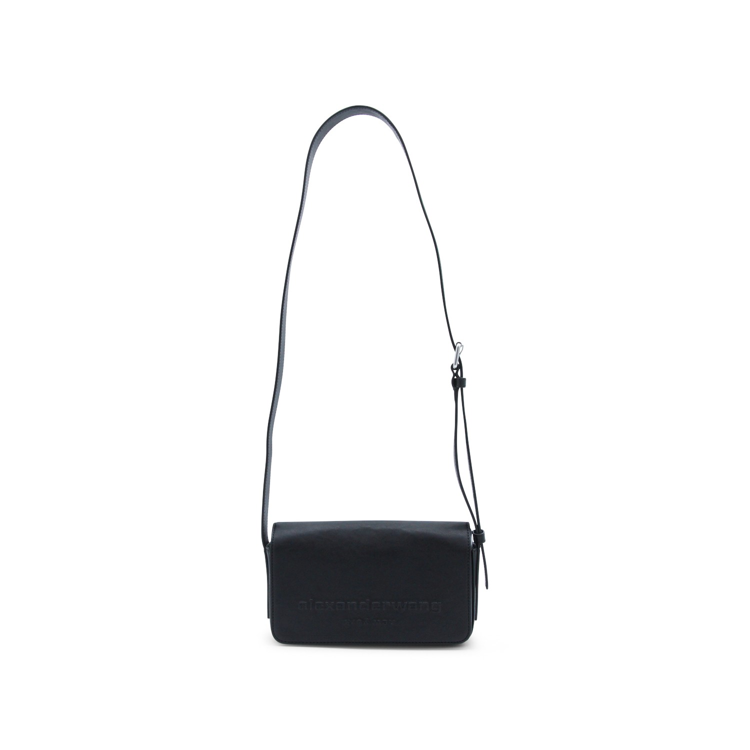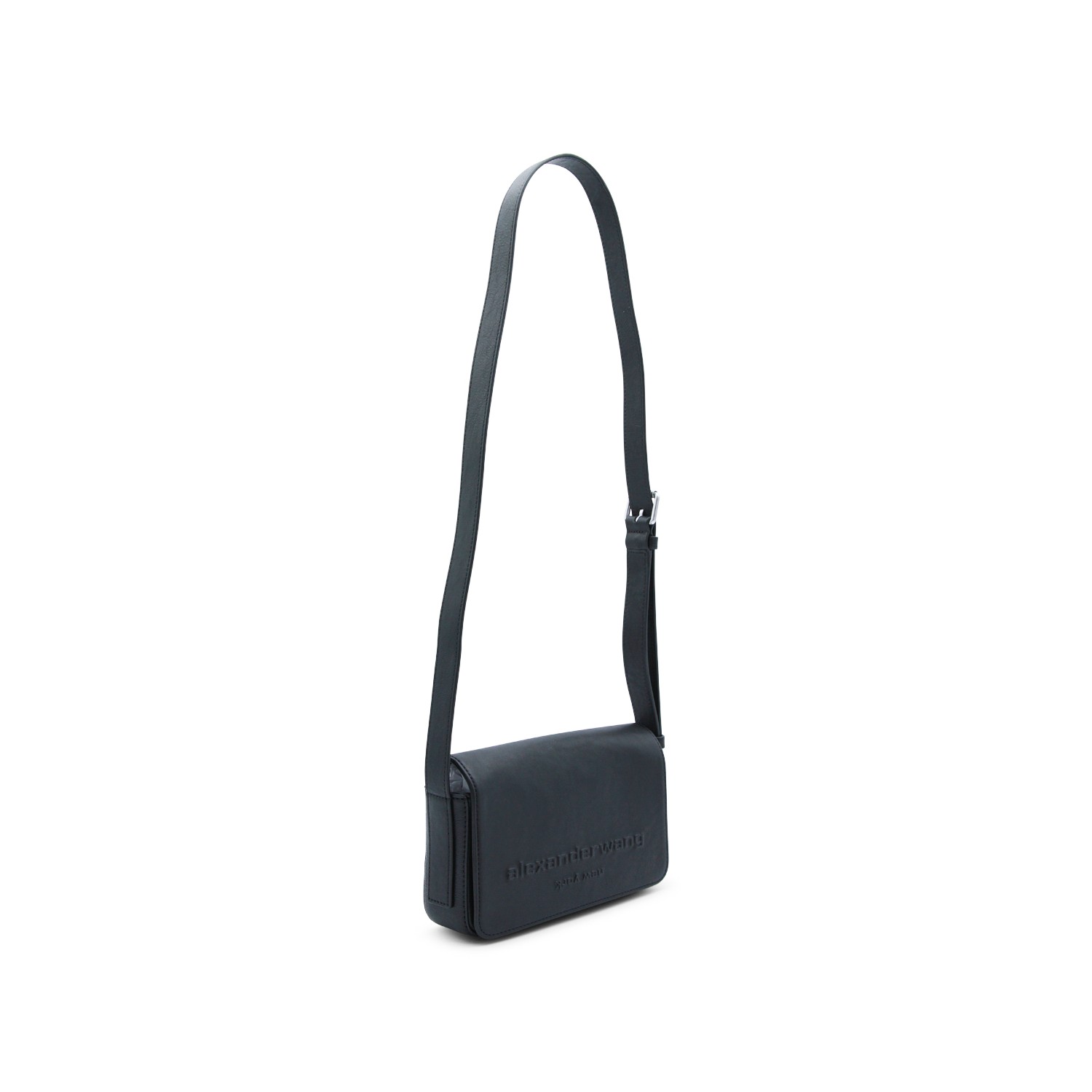 Black leather shoulder bag from Alexander Wang featuring rounded edges, adjustable shoulder strap, frontal logo and main compartment.