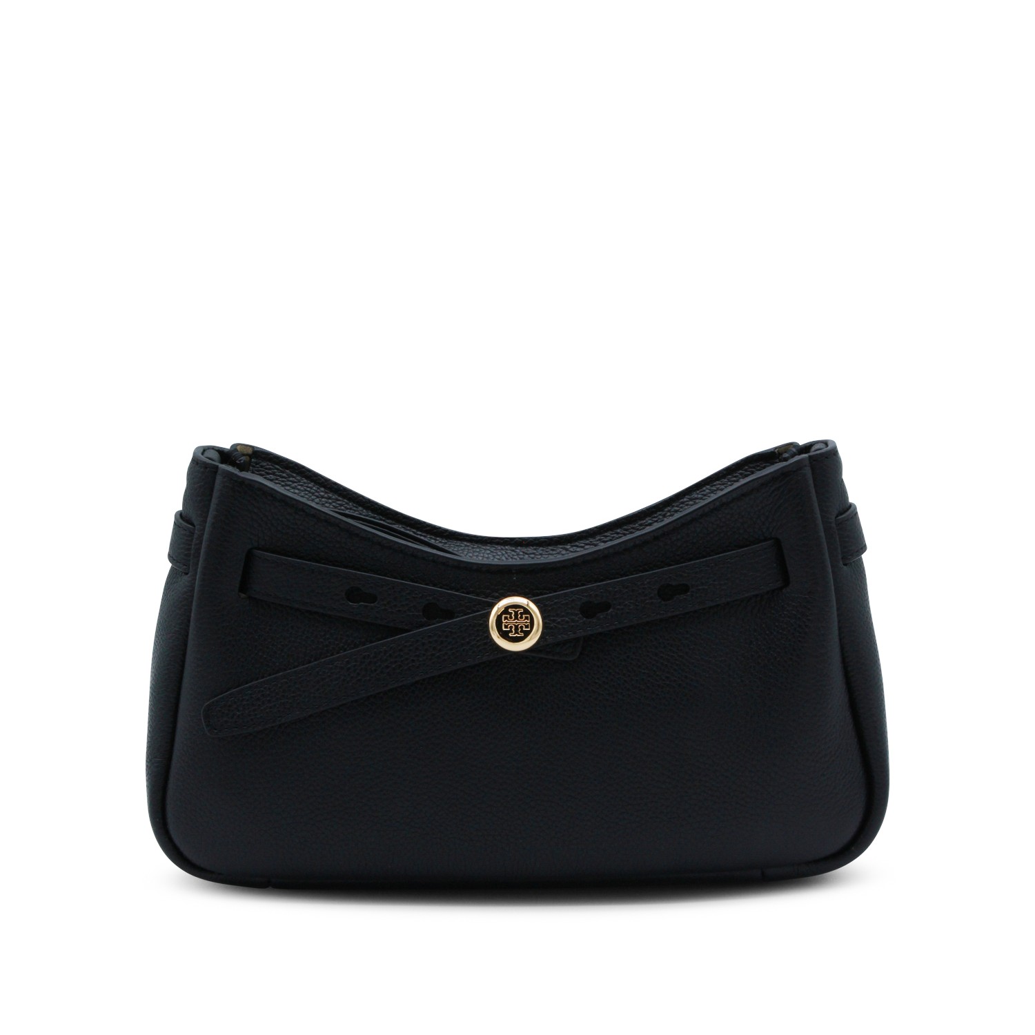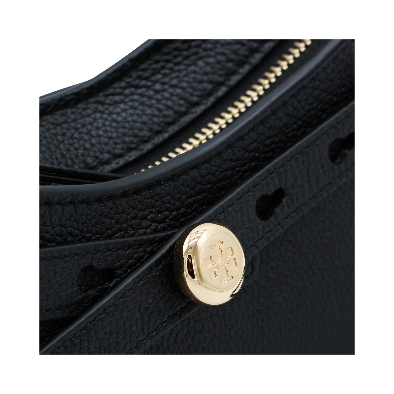 Black leather crossbody bag from Tory Burch featuring zip fastening, frontal logo, removable strap and gold tone hardware.