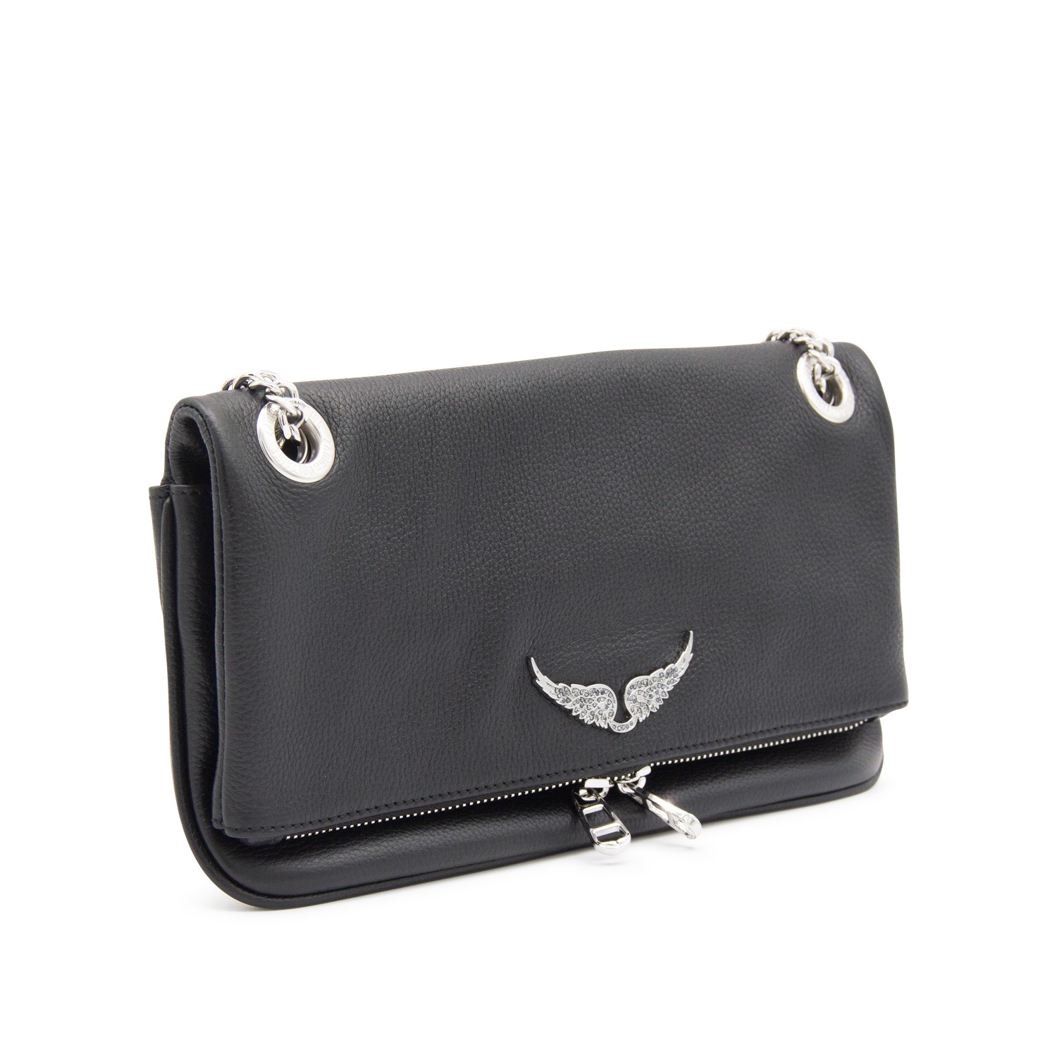 Black leather Rock II shoulder bag from Zadig & Voltaire featuring silver tone hardware, chain link strap, frontal logo, magnetic closure and main compartment.