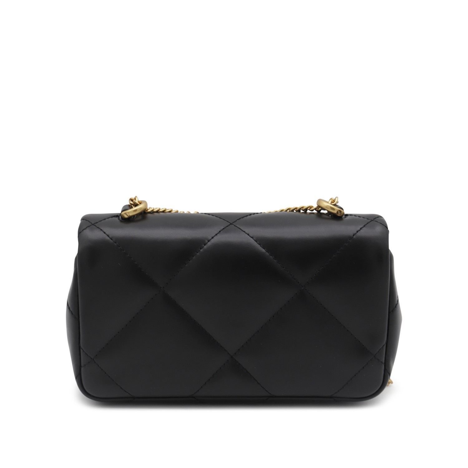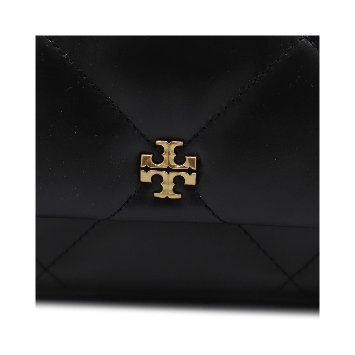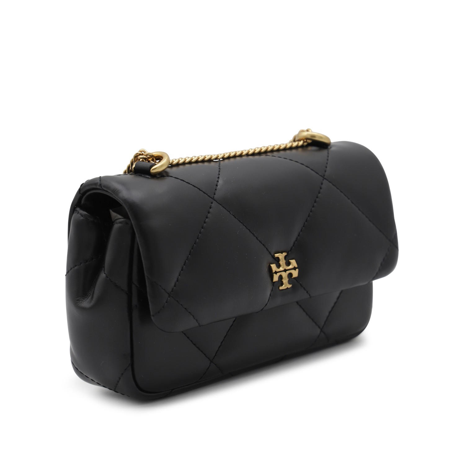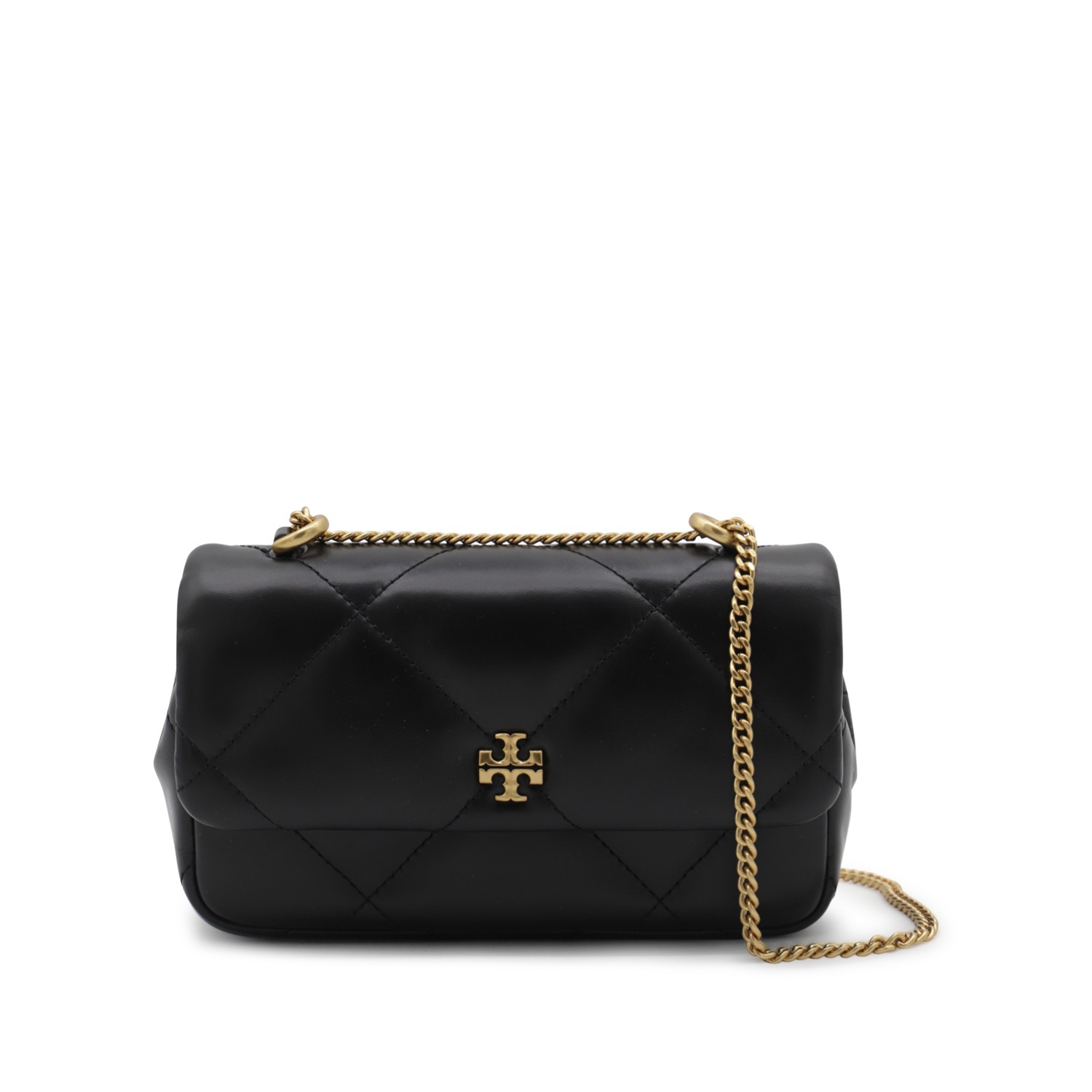 Black leather Kira Diamond small shoulder bag from Tory Burch featuring flap with magnetic closure, gold tone metal hardware, chain shoulder strap, frontal logo, main compartment and card slots.