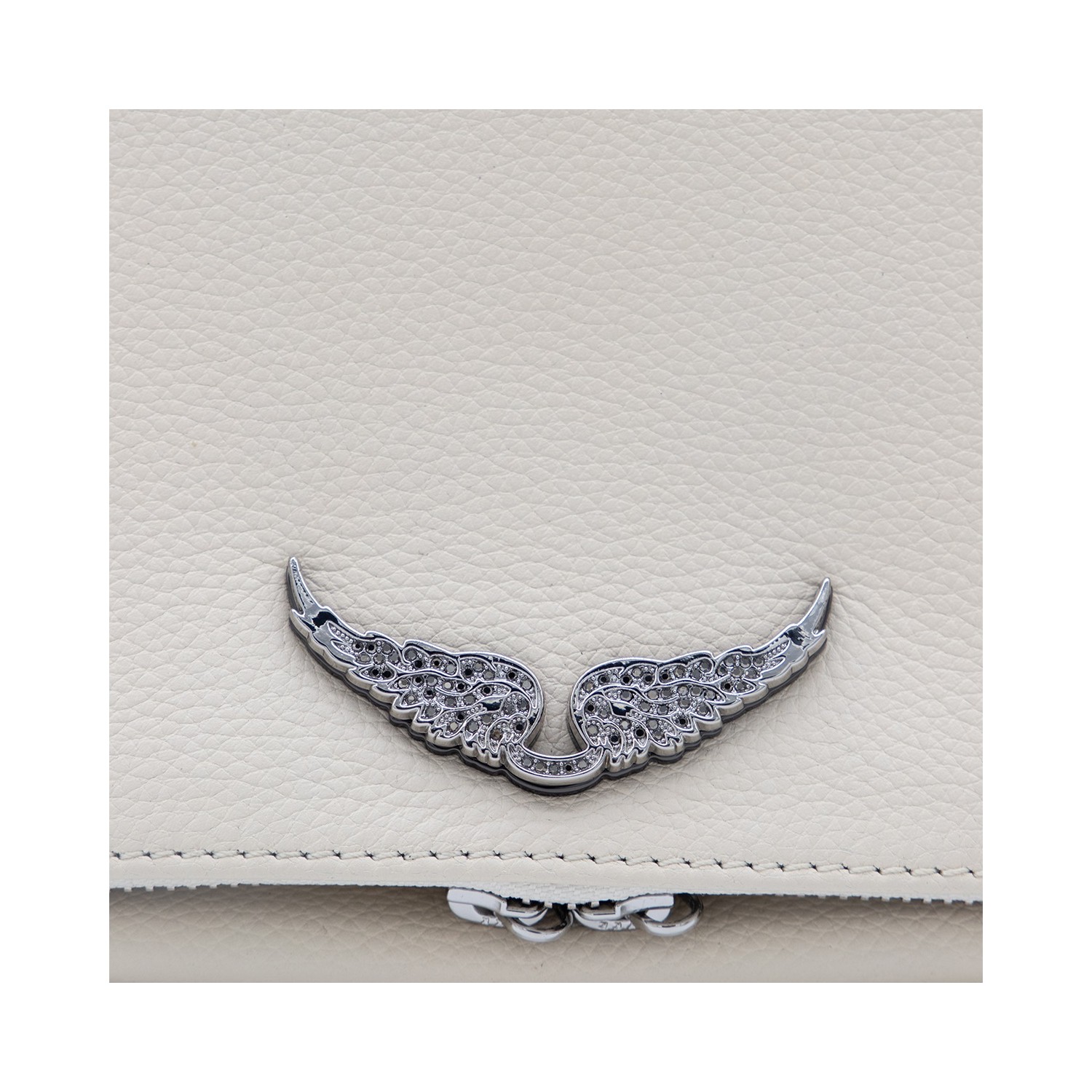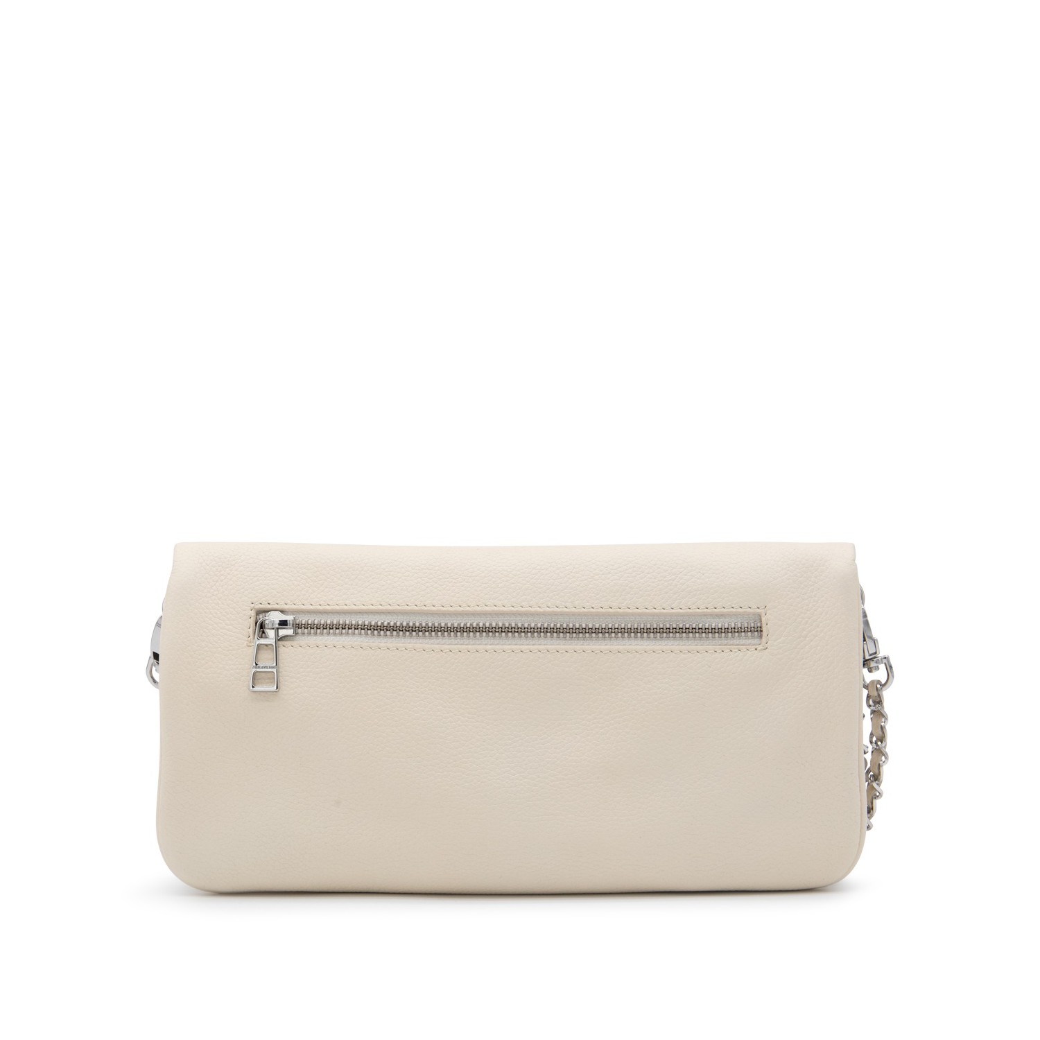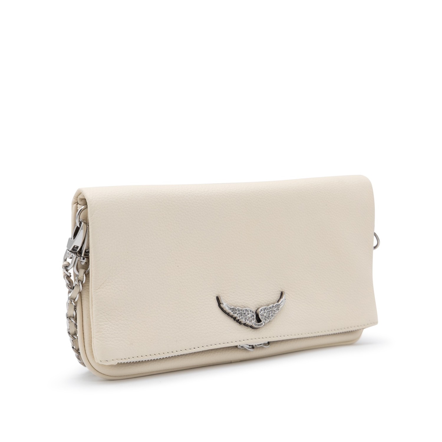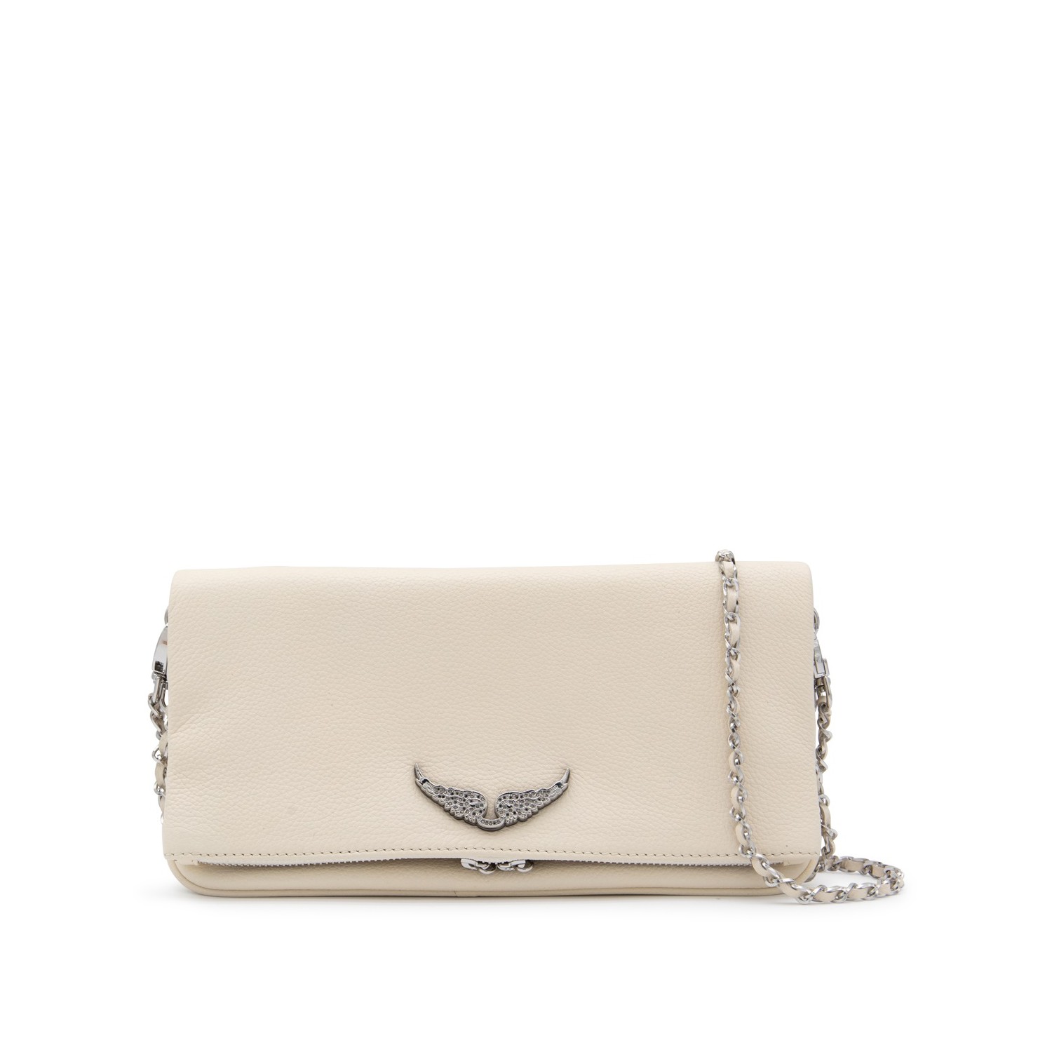 White leather Rock Nano shoulder bag from Zadig & Voltaire featuring chain-link strap, gold tone hardware, frontal logo plaque, zip fastening and main compartment.