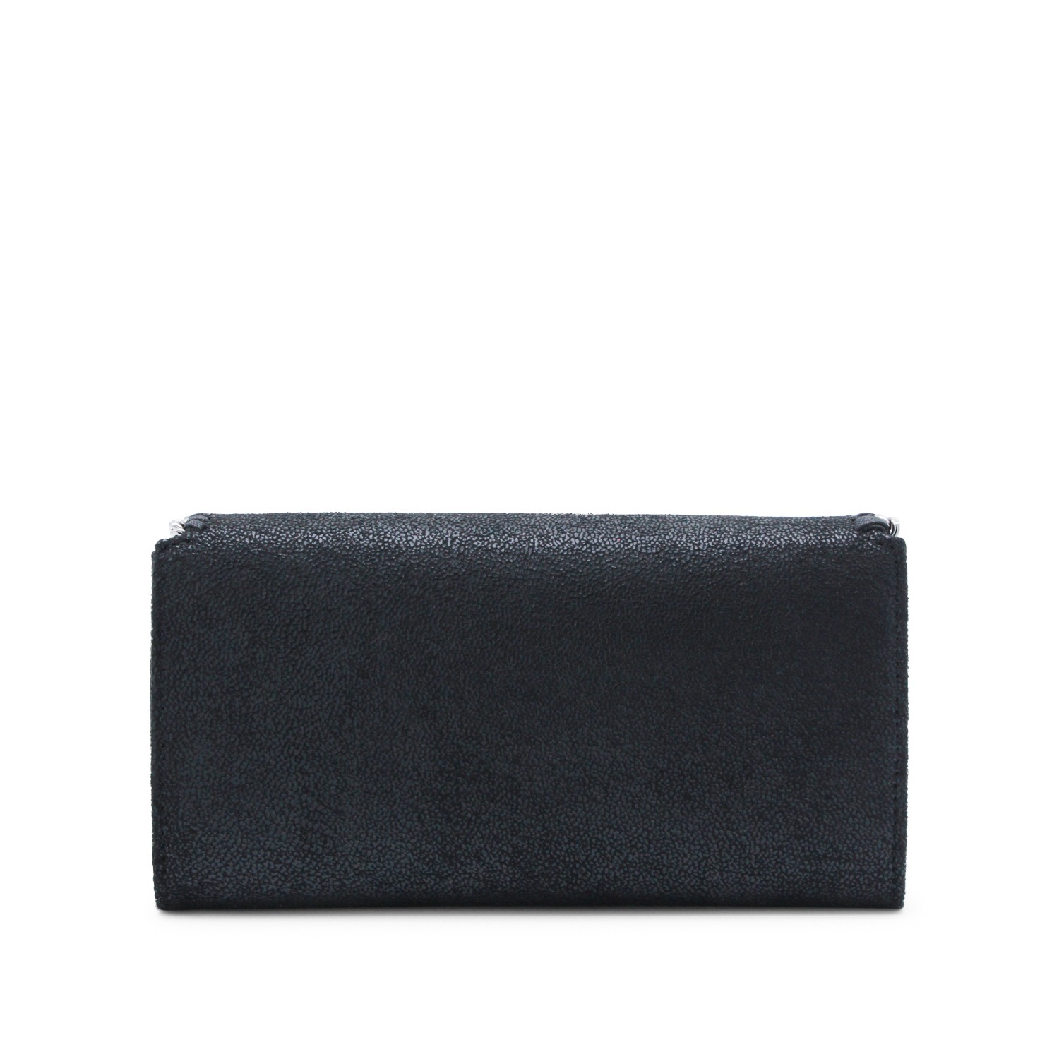 Black faux leather Continental wallet crossbody bag from Stella McCartney featuring sivler tone metal finishes, snap button closure, logo details, detachable chain shoulder strap, main compartment and lining.