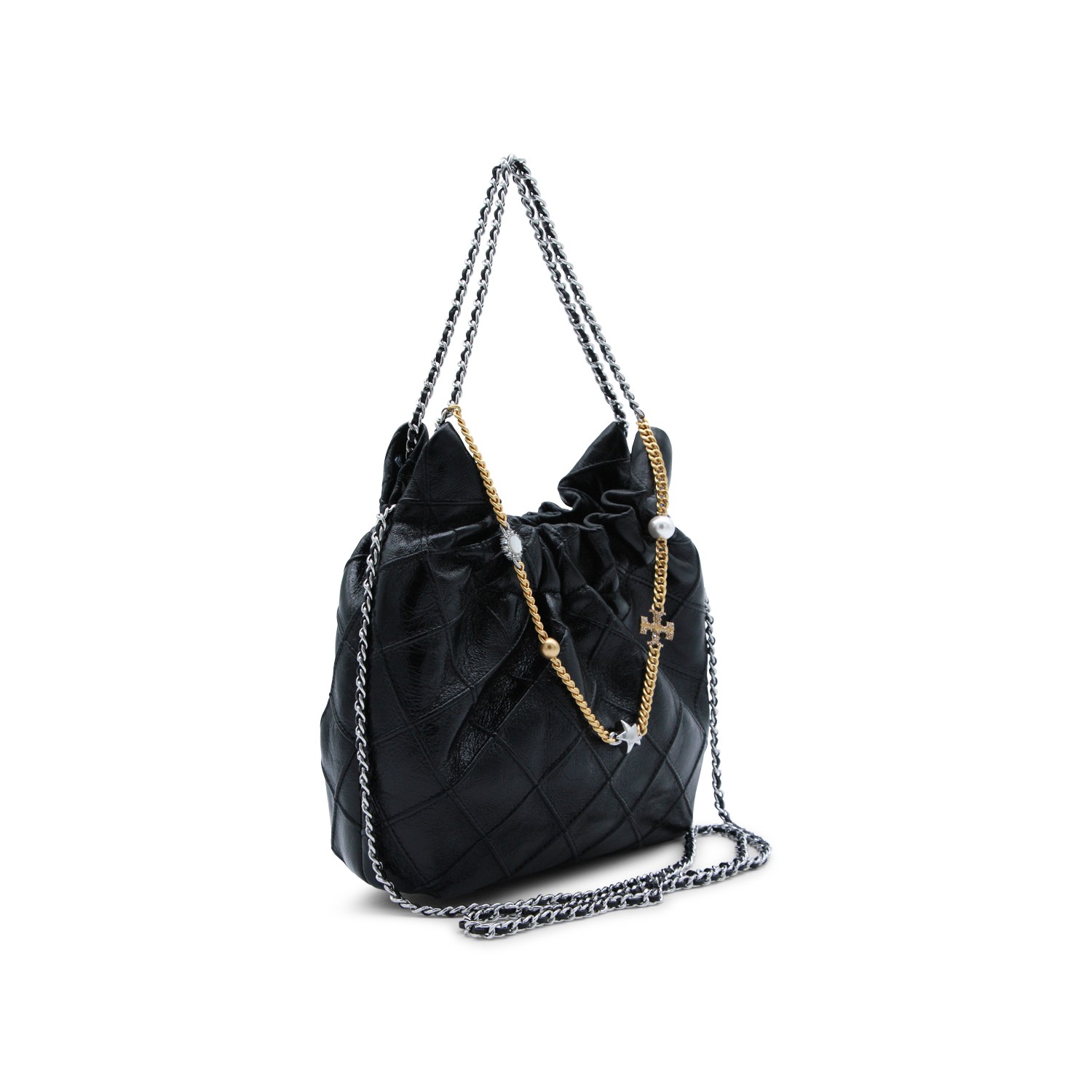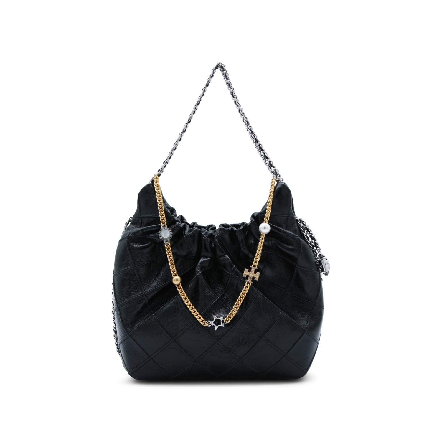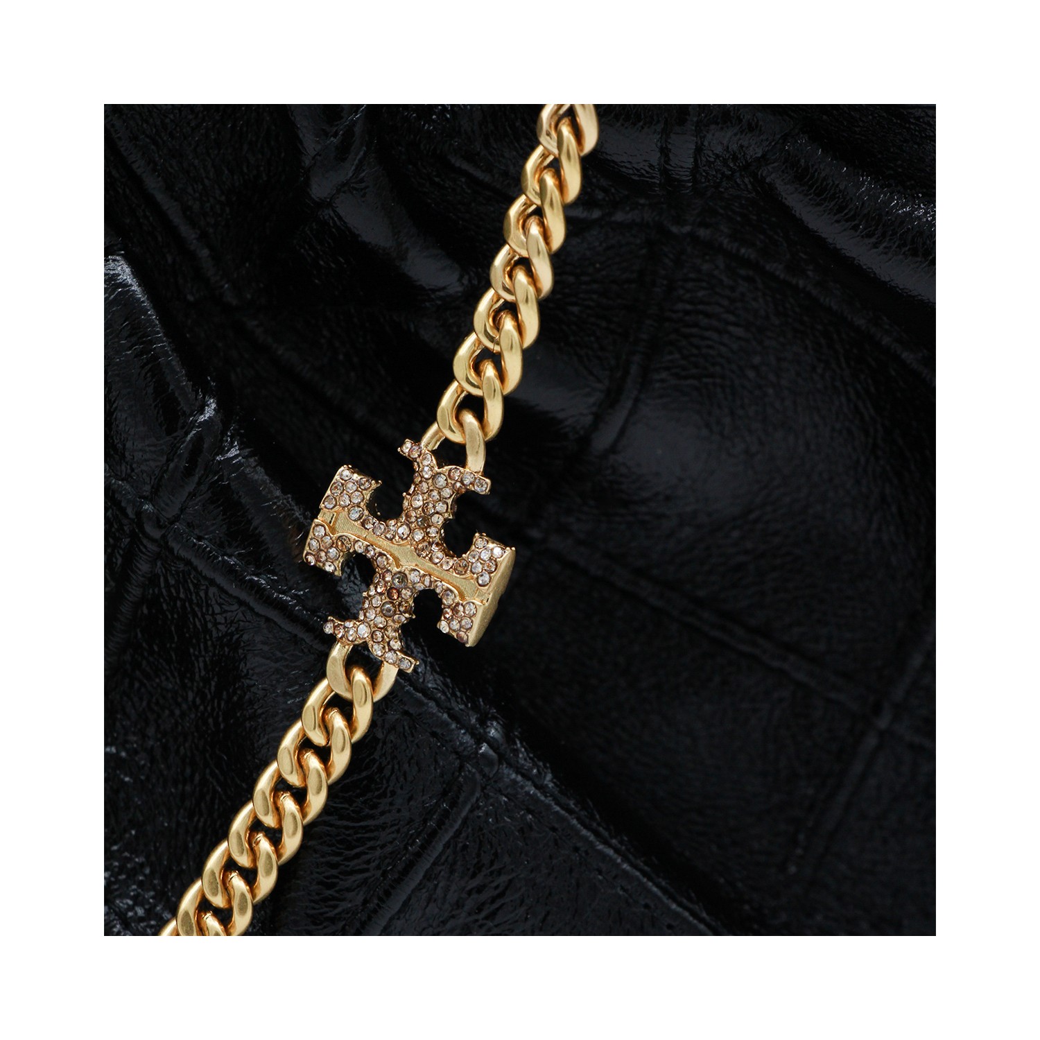 Black leather crossbody bag from Tory Burch featuring top handles, strap, gold tone hardware and main compartment.