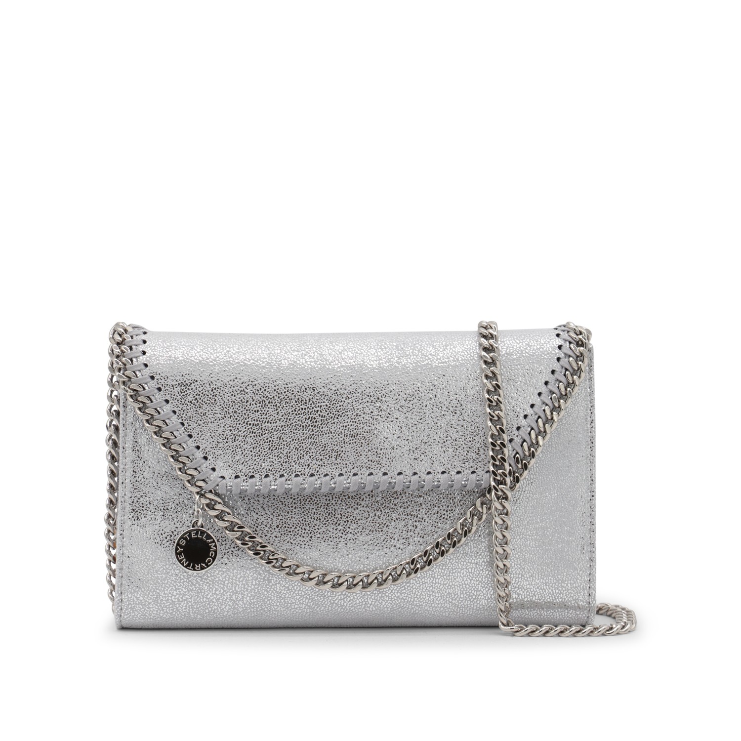 Silver faux leather Falabella mini crossbody shoulder bag from Stella McCartney featuring sivler tone metal finishes, snap button closure, logo details, detachable chain shoulder strap, main compartment and lining.