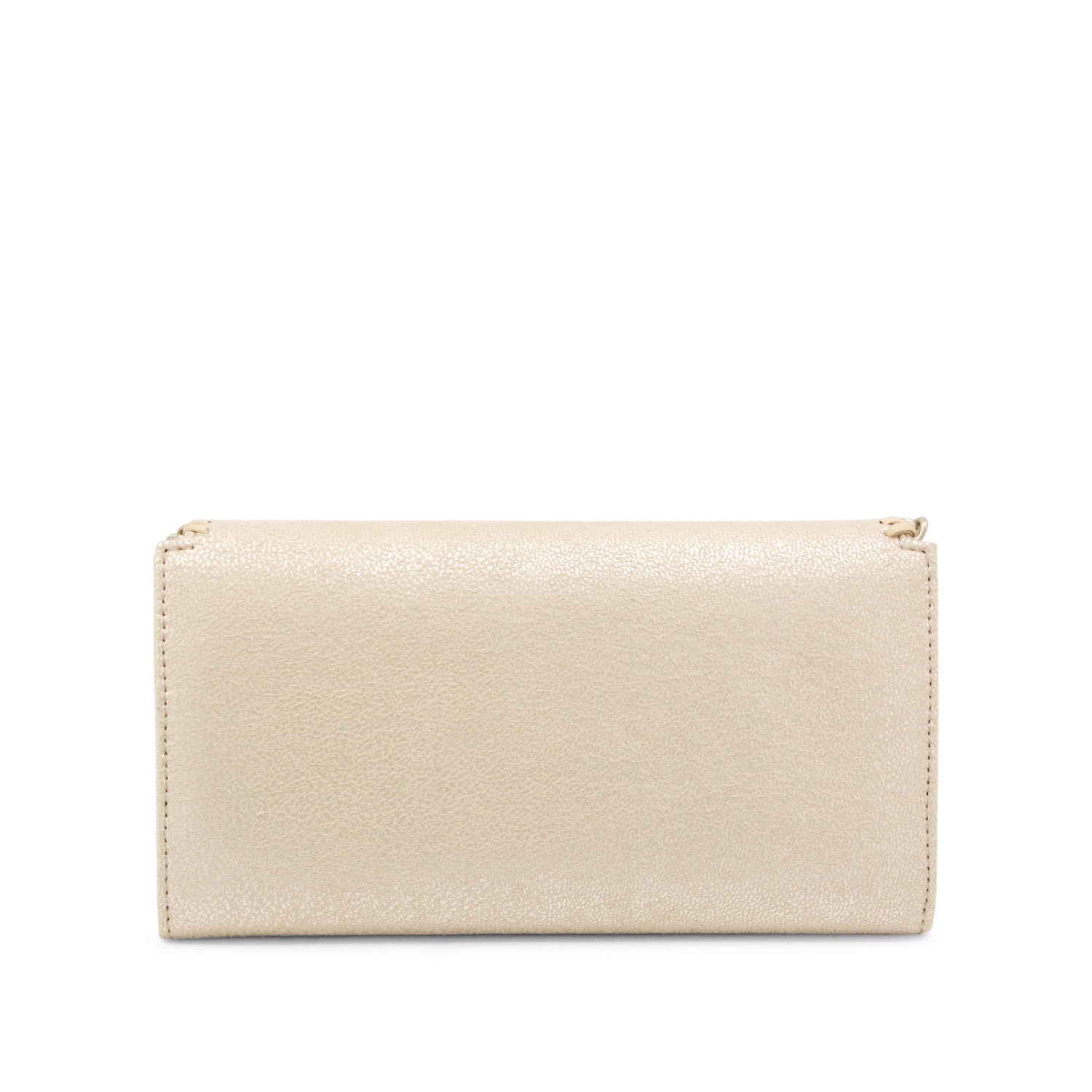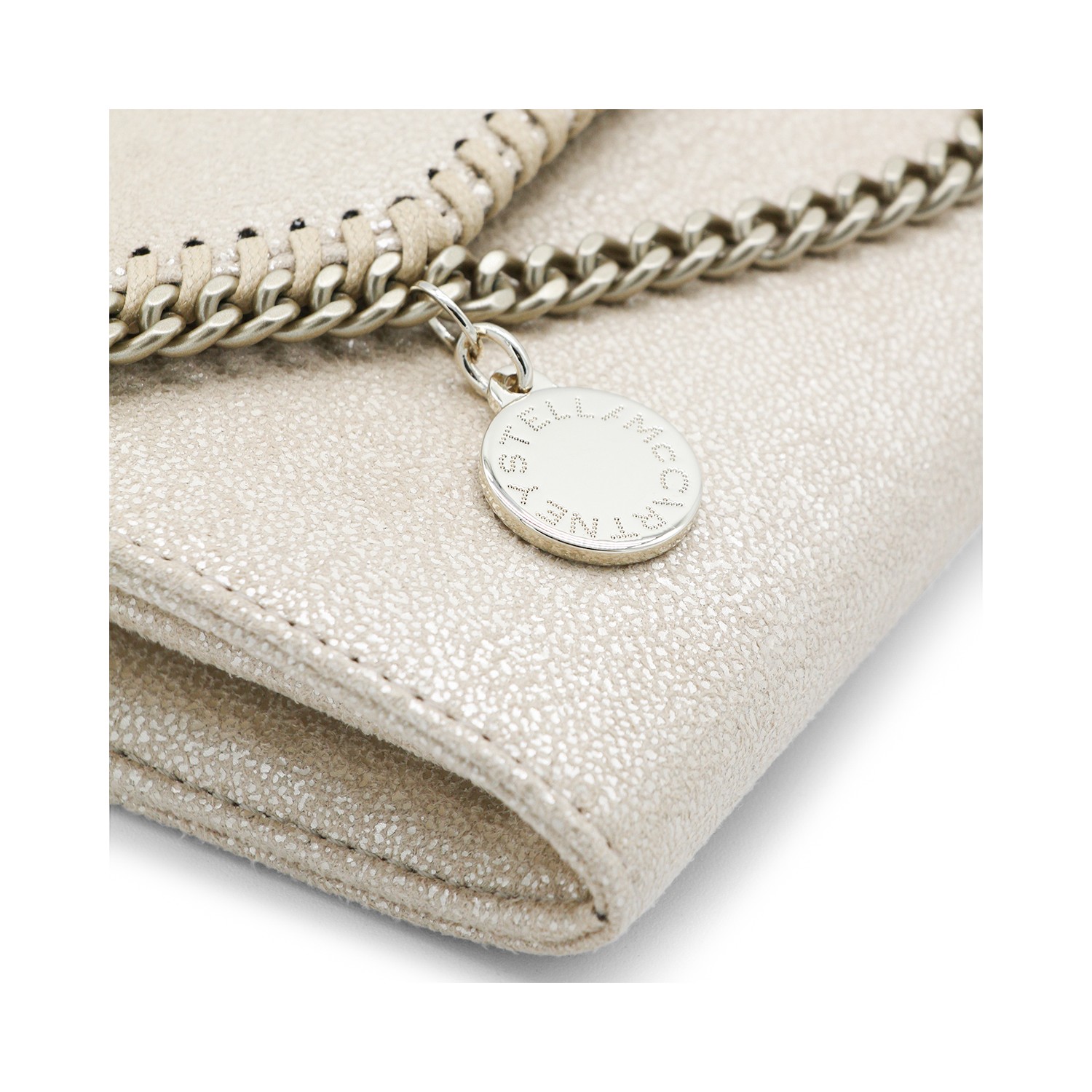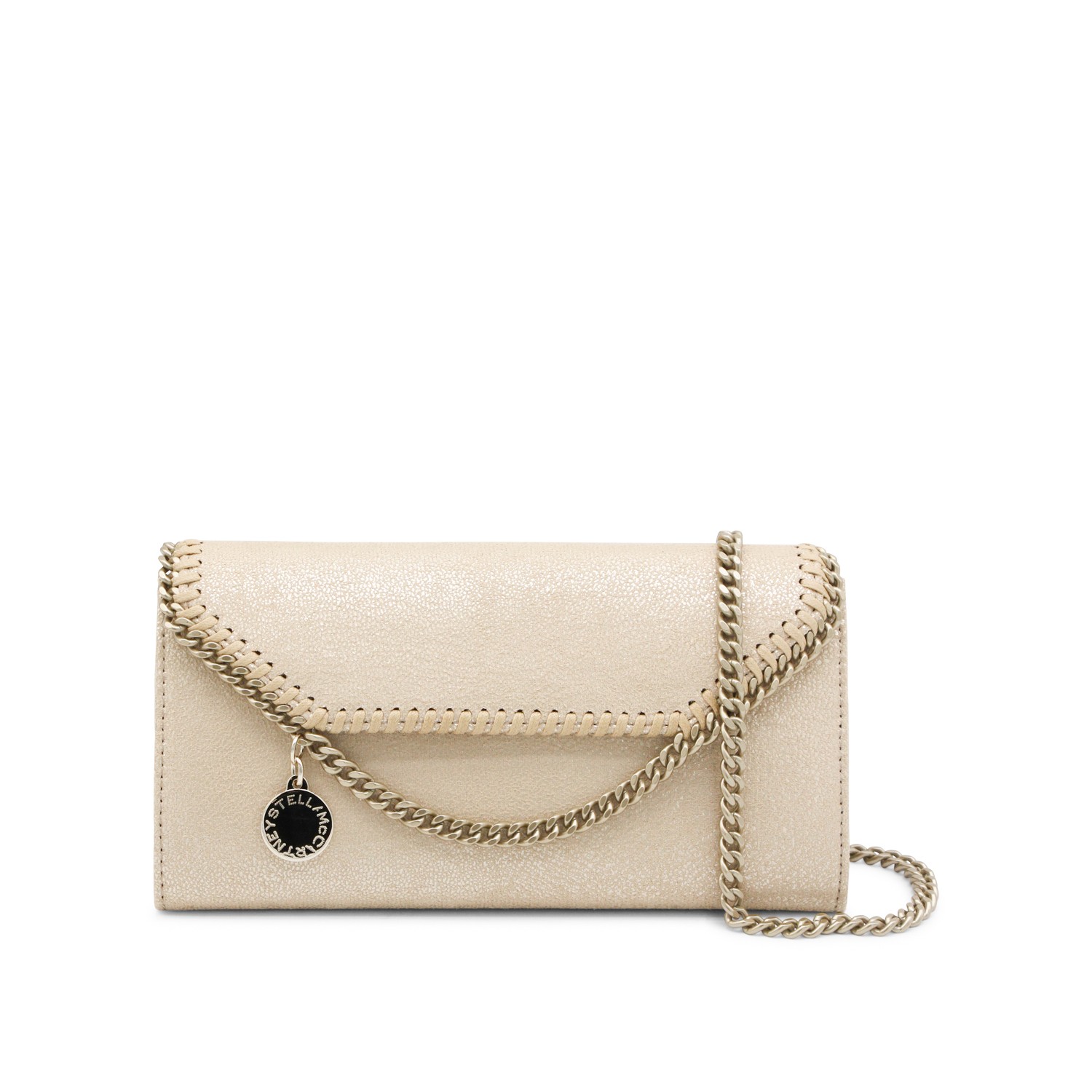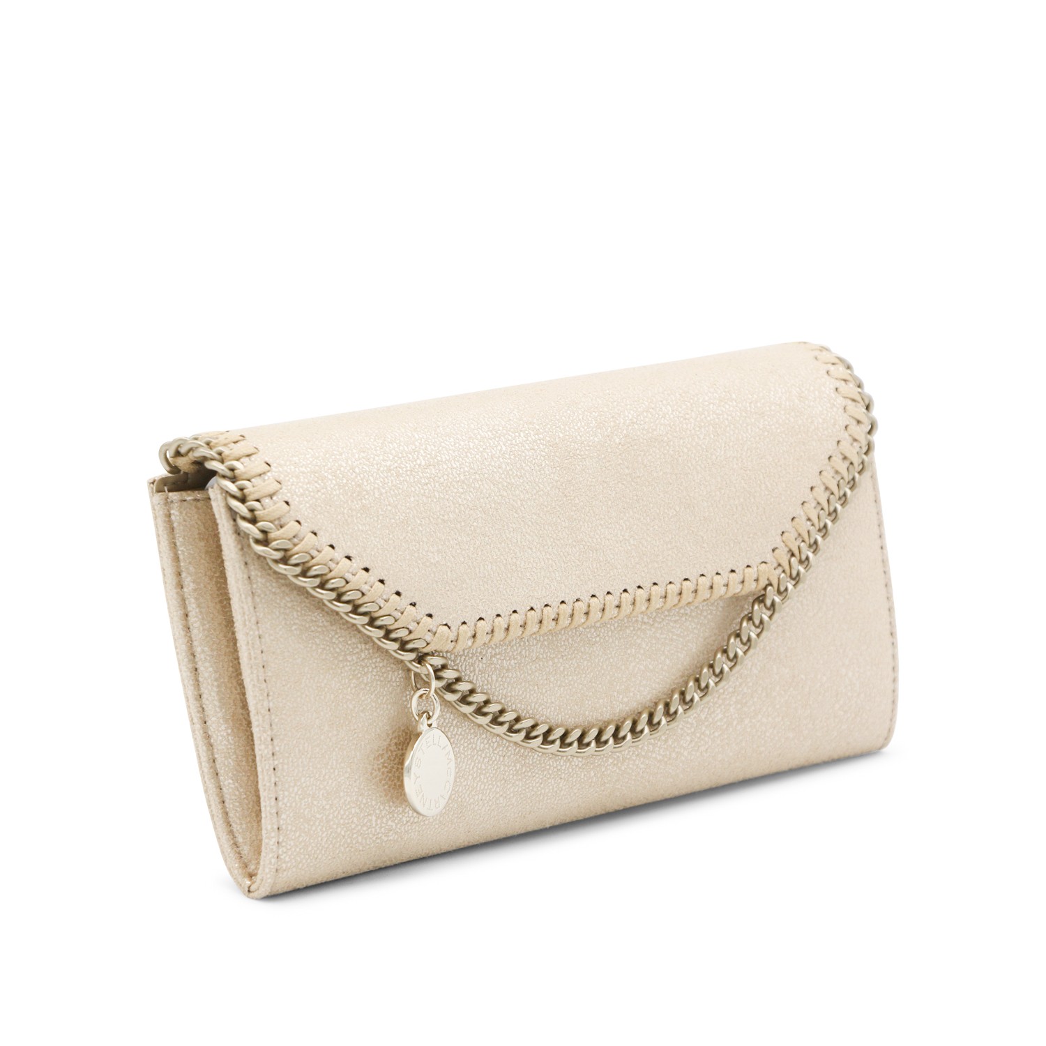 Gold faux leather Continental wallet crossbody bag from Stella McCartney featuring gold tone metal finishes, snap button closure, logo details, detachable chain shoulder strap, main compartment and lining.