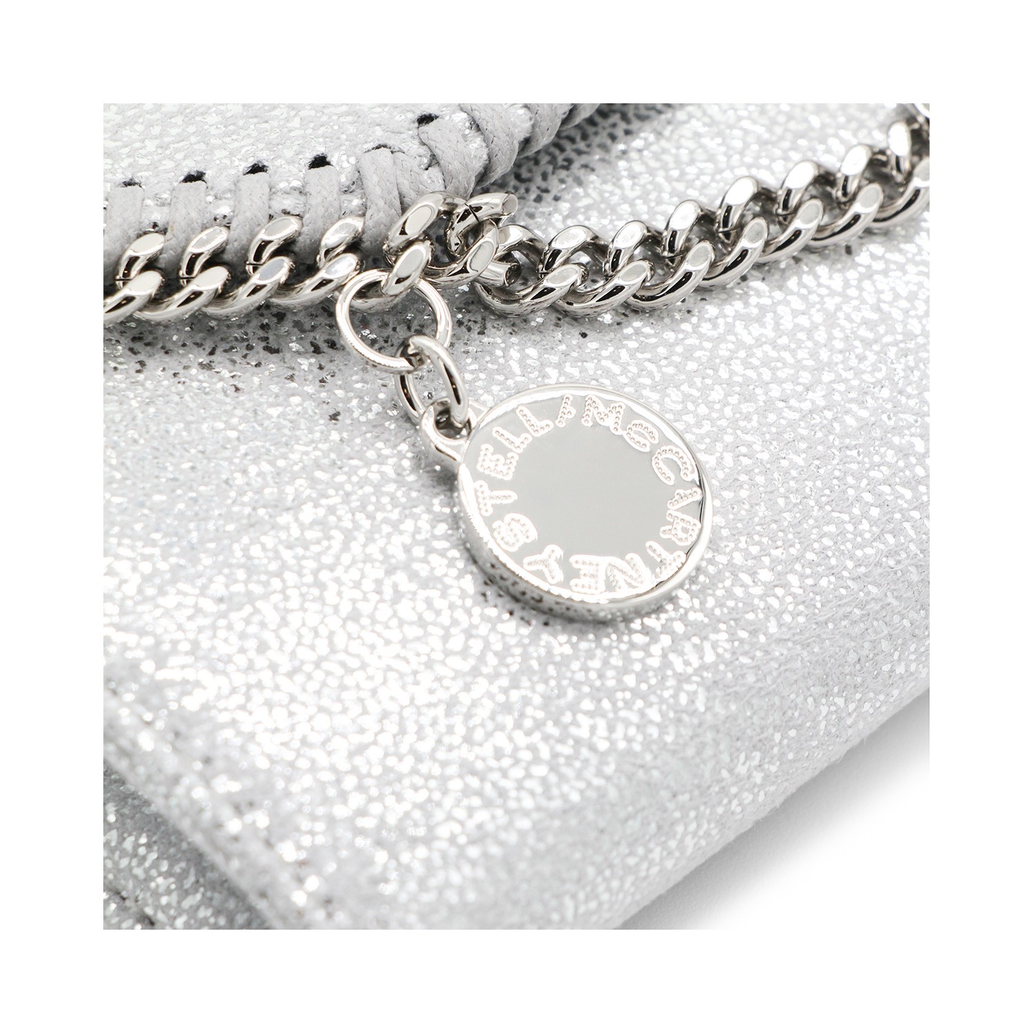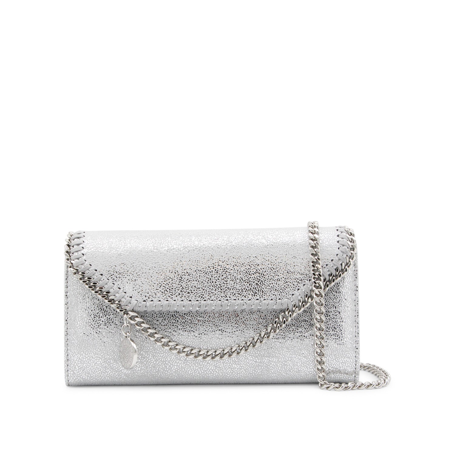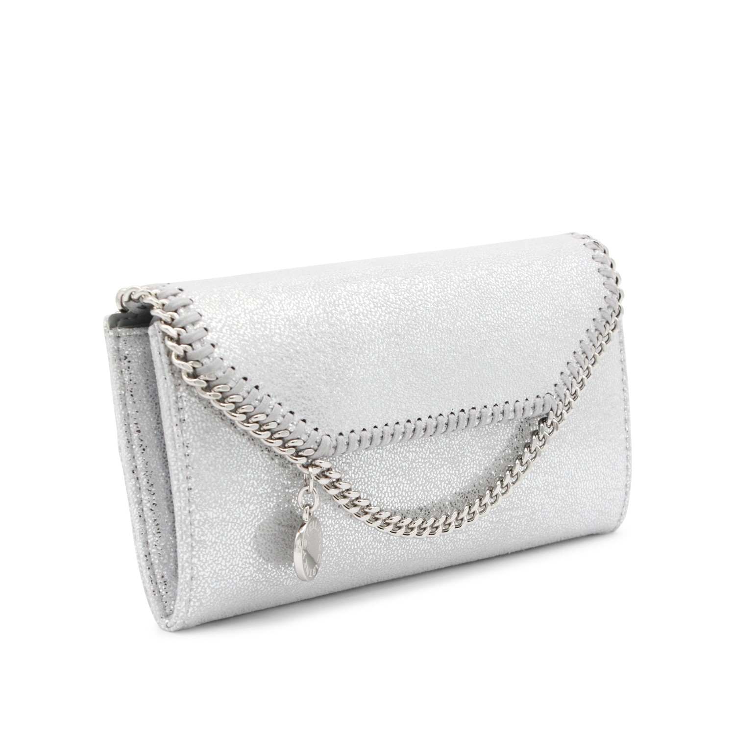 Silver faux leather Continental wallet crossbody bag from Stella McCartney featuring silver tone metal finishes, snap button closure, logo details, detachable chain shoulder strap, main compartment and lining.