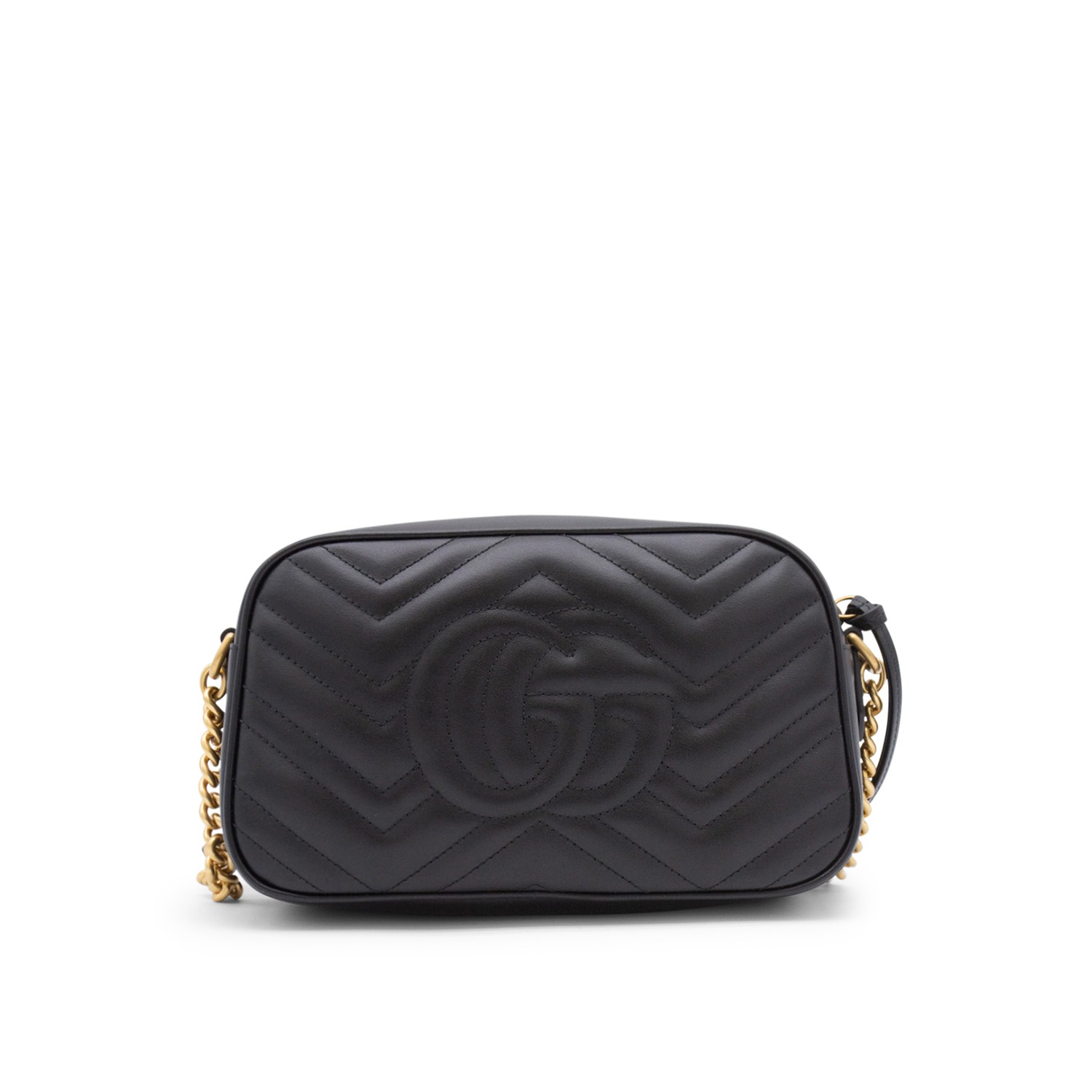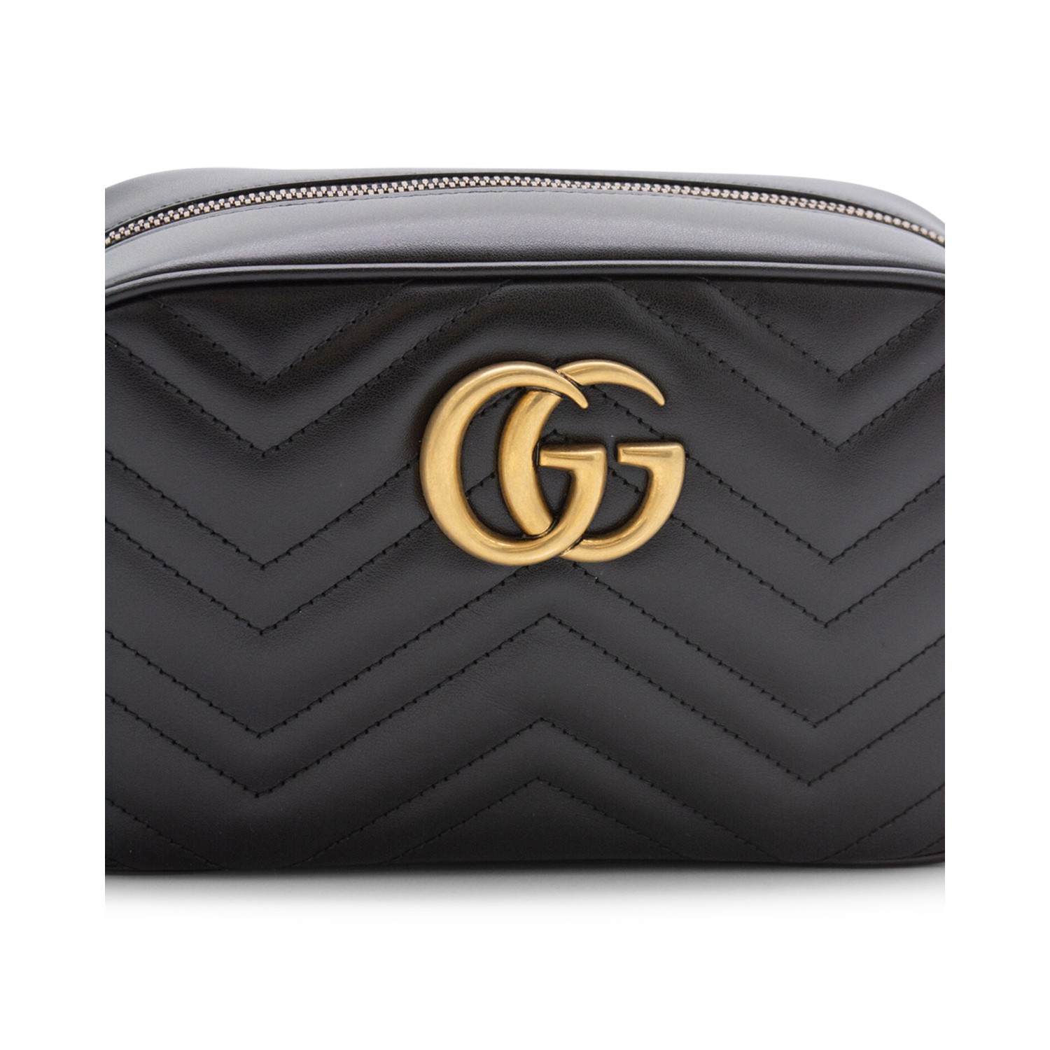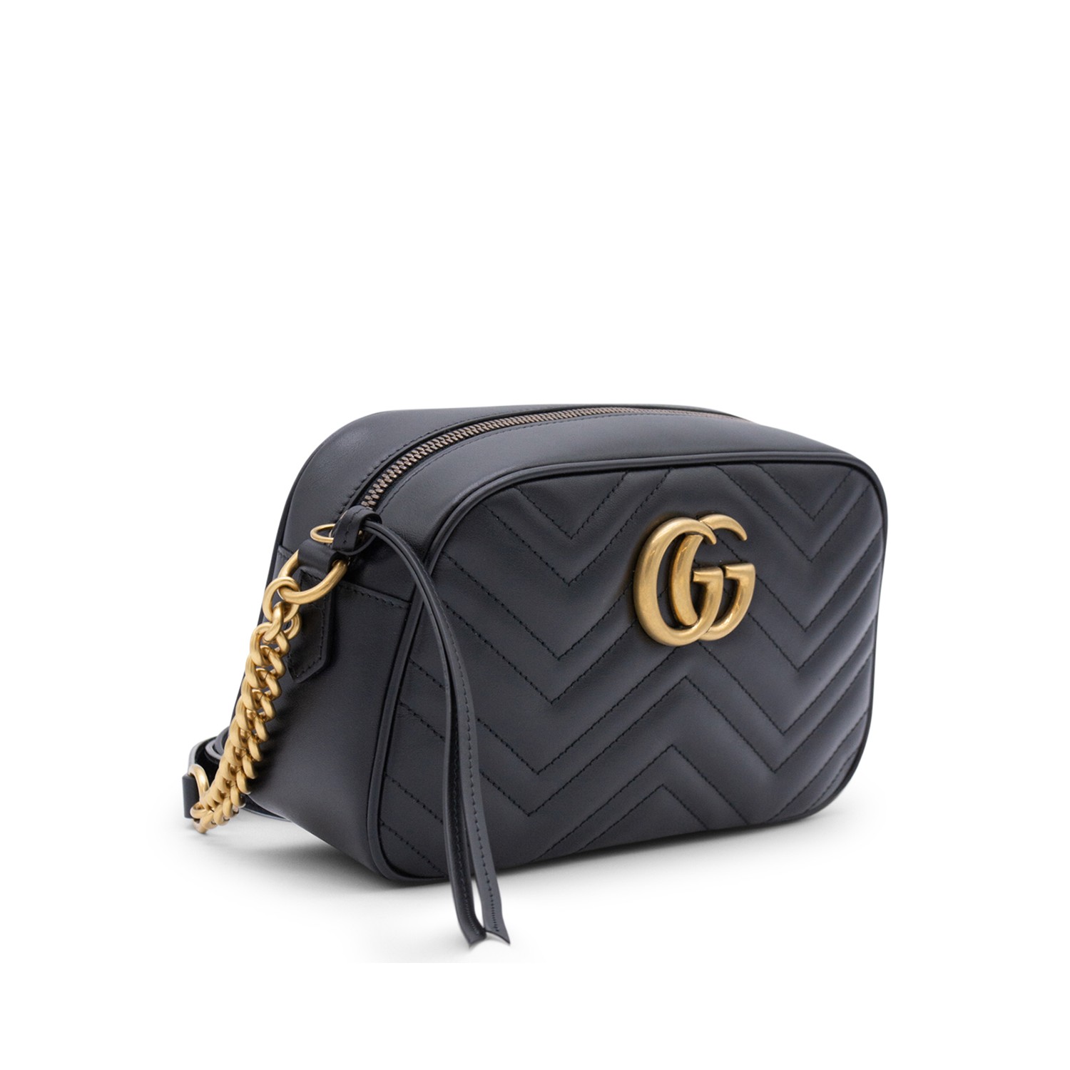 Black leather crossbody bag from Gucci featuring strap, zip fastening, main compartment, padded, frontal logo and gold tone hardware.