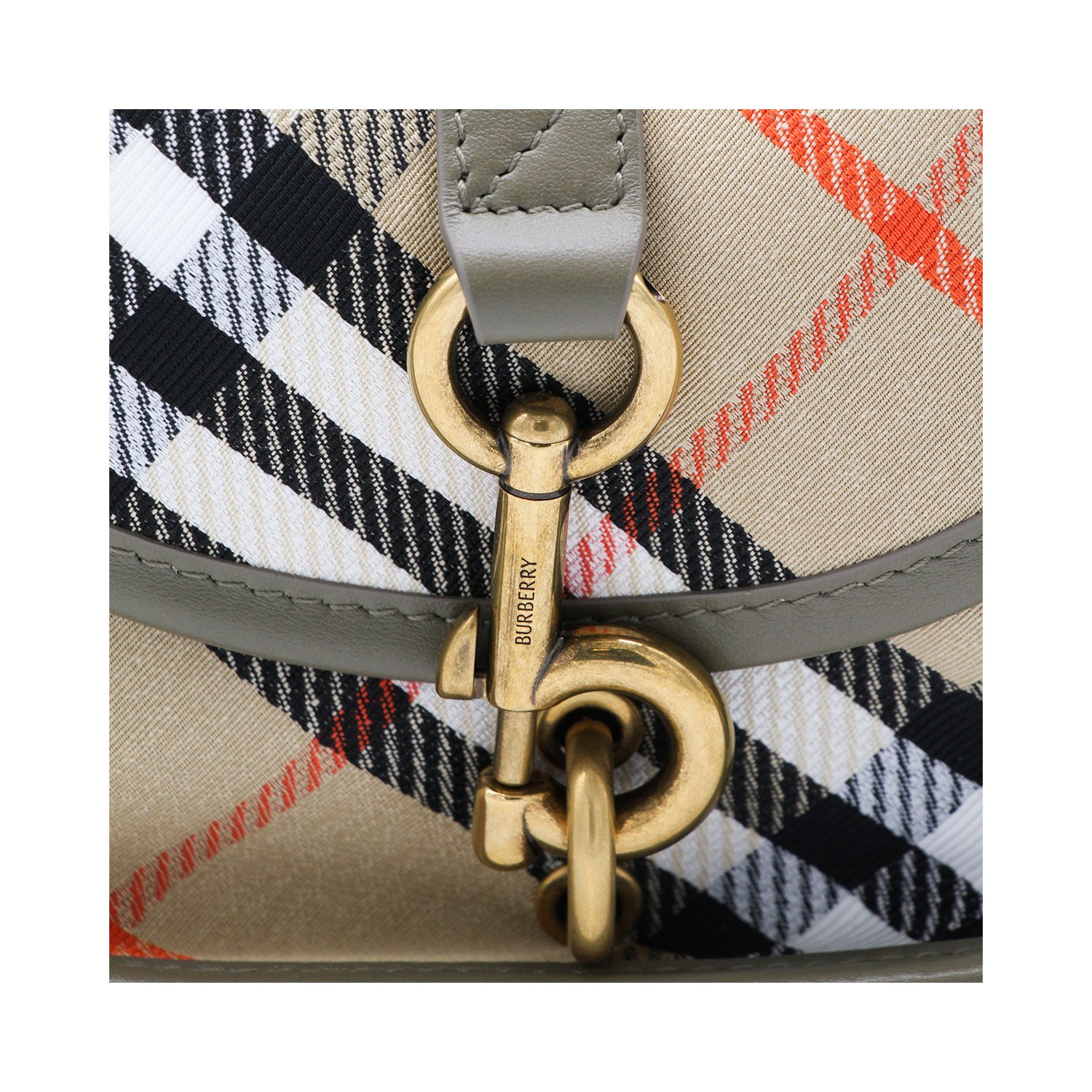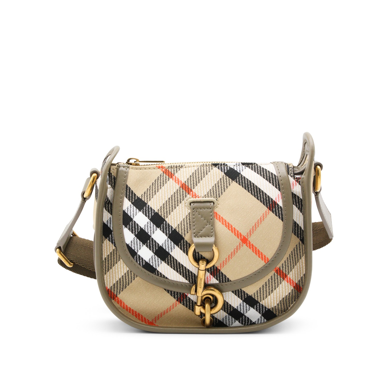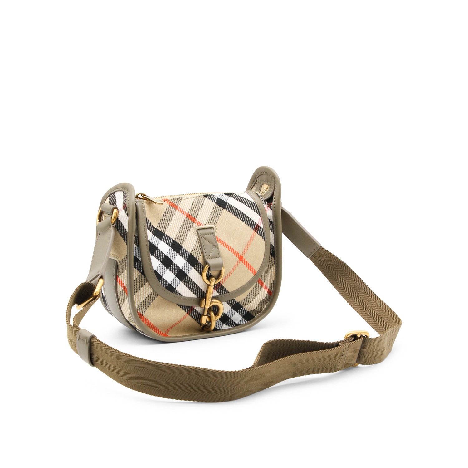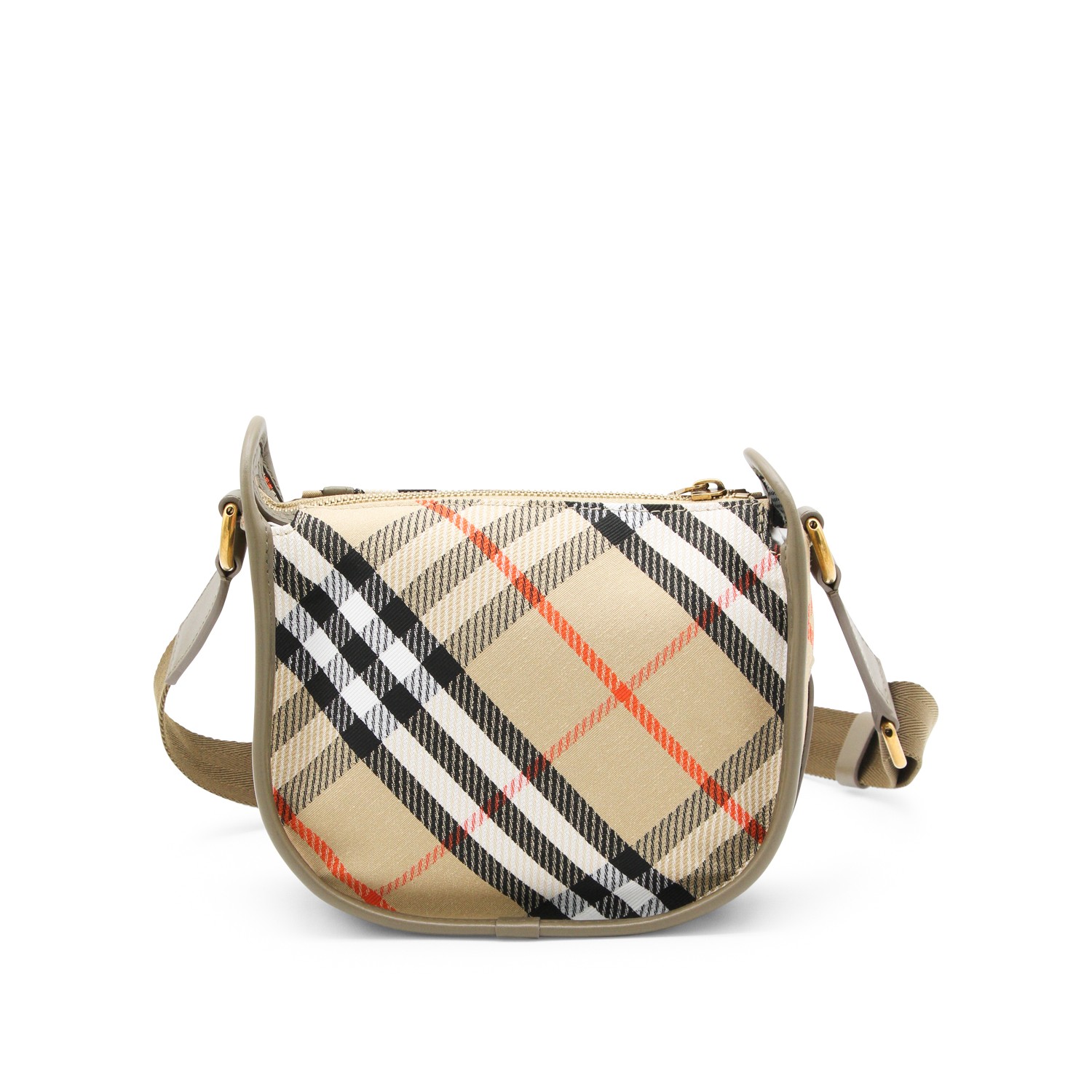 Beige cotton crossbody bag from Burberry featuring top handle, main compartment, zip fastening, all over iconic stamp and gold tone hardware.