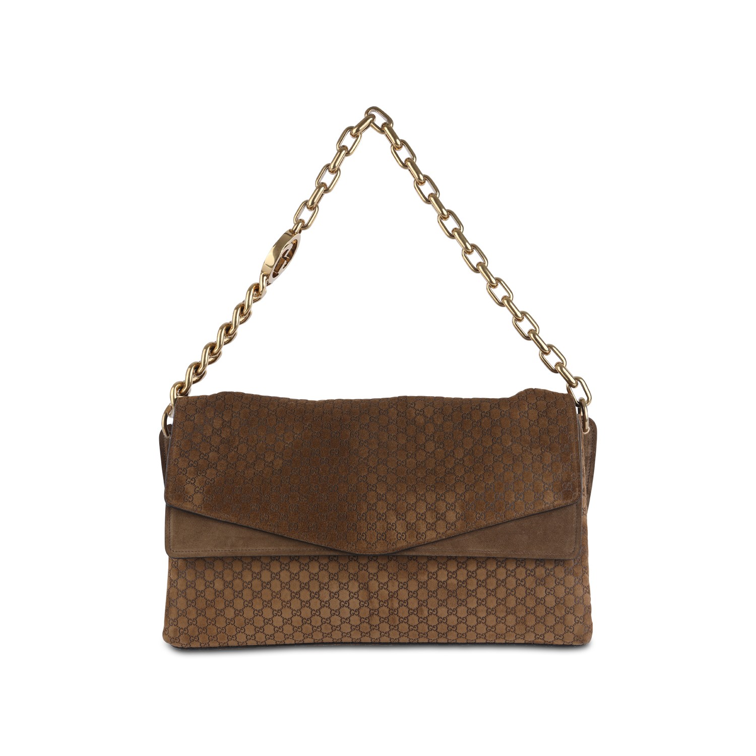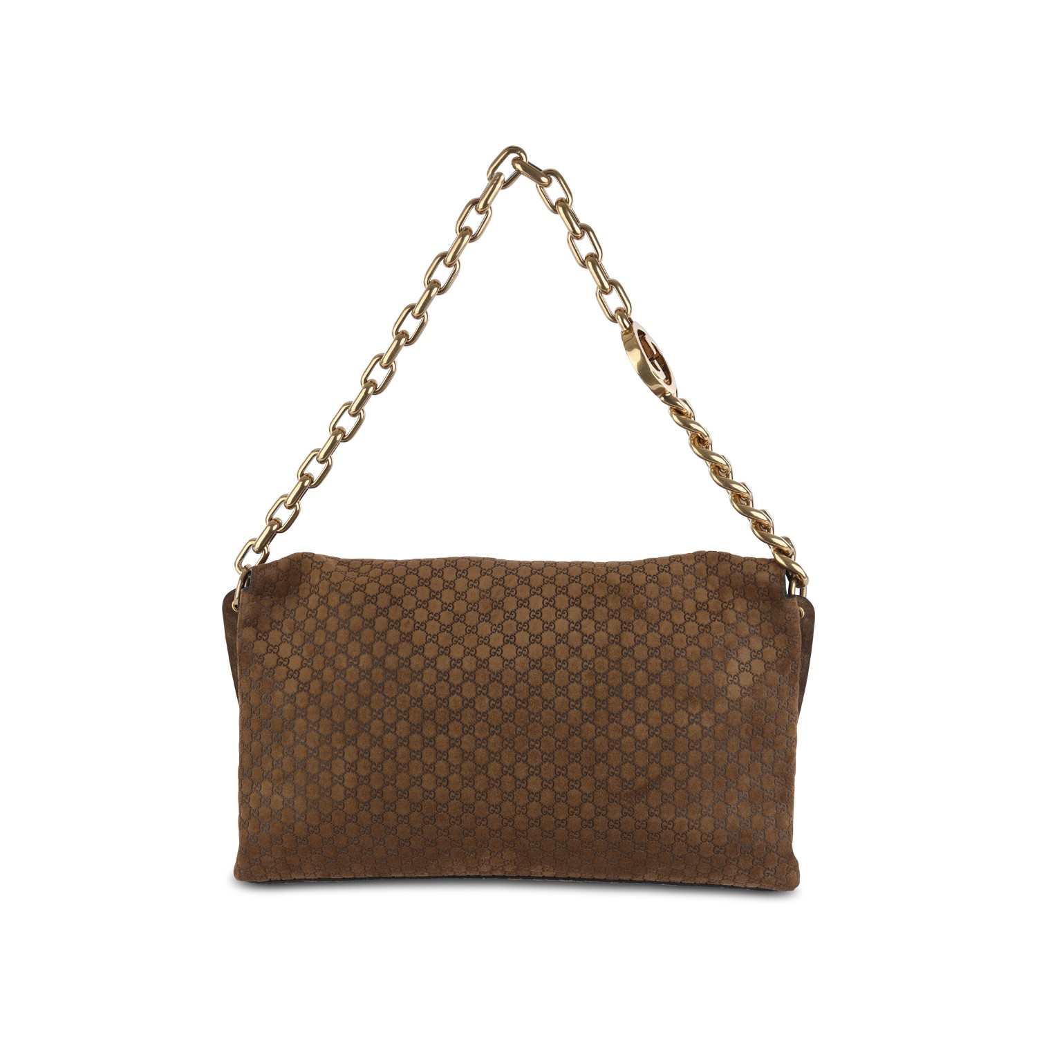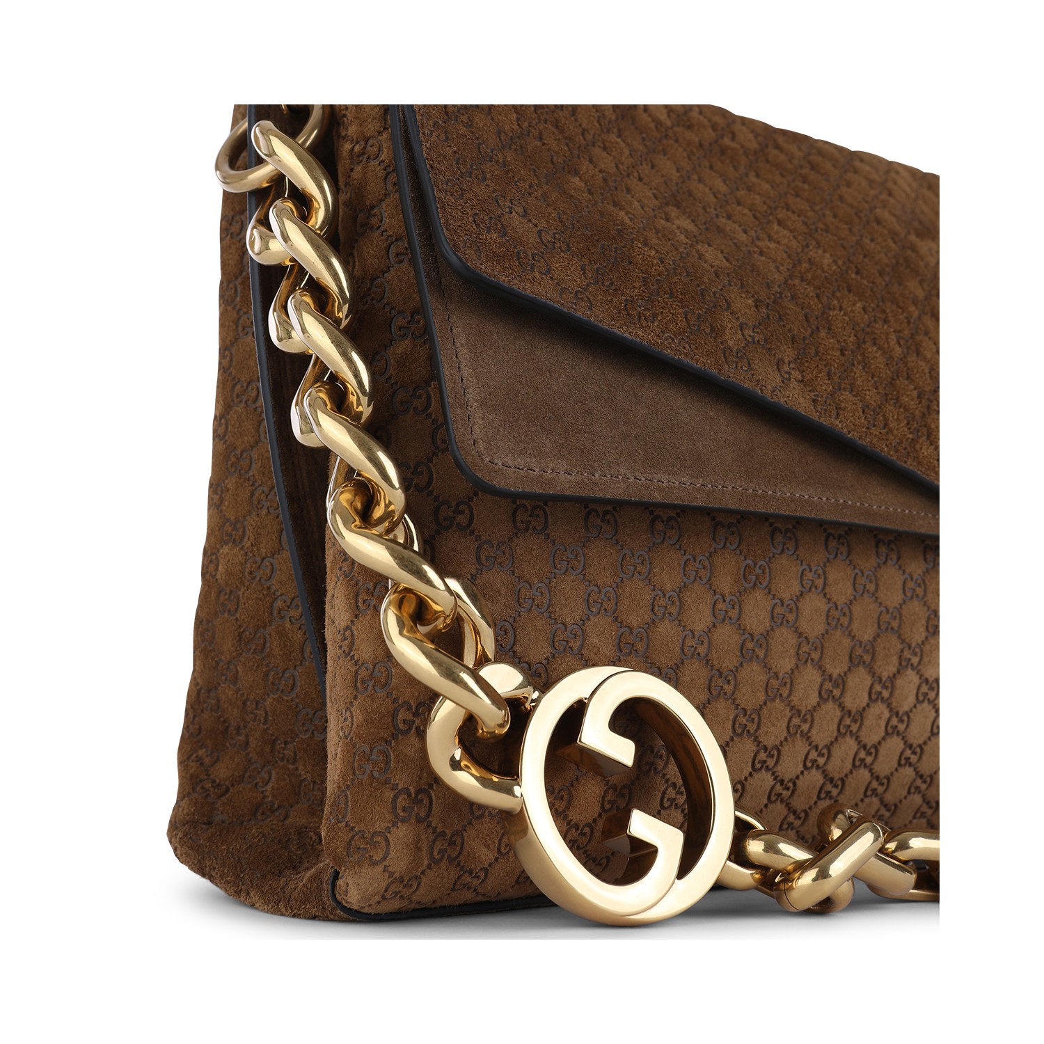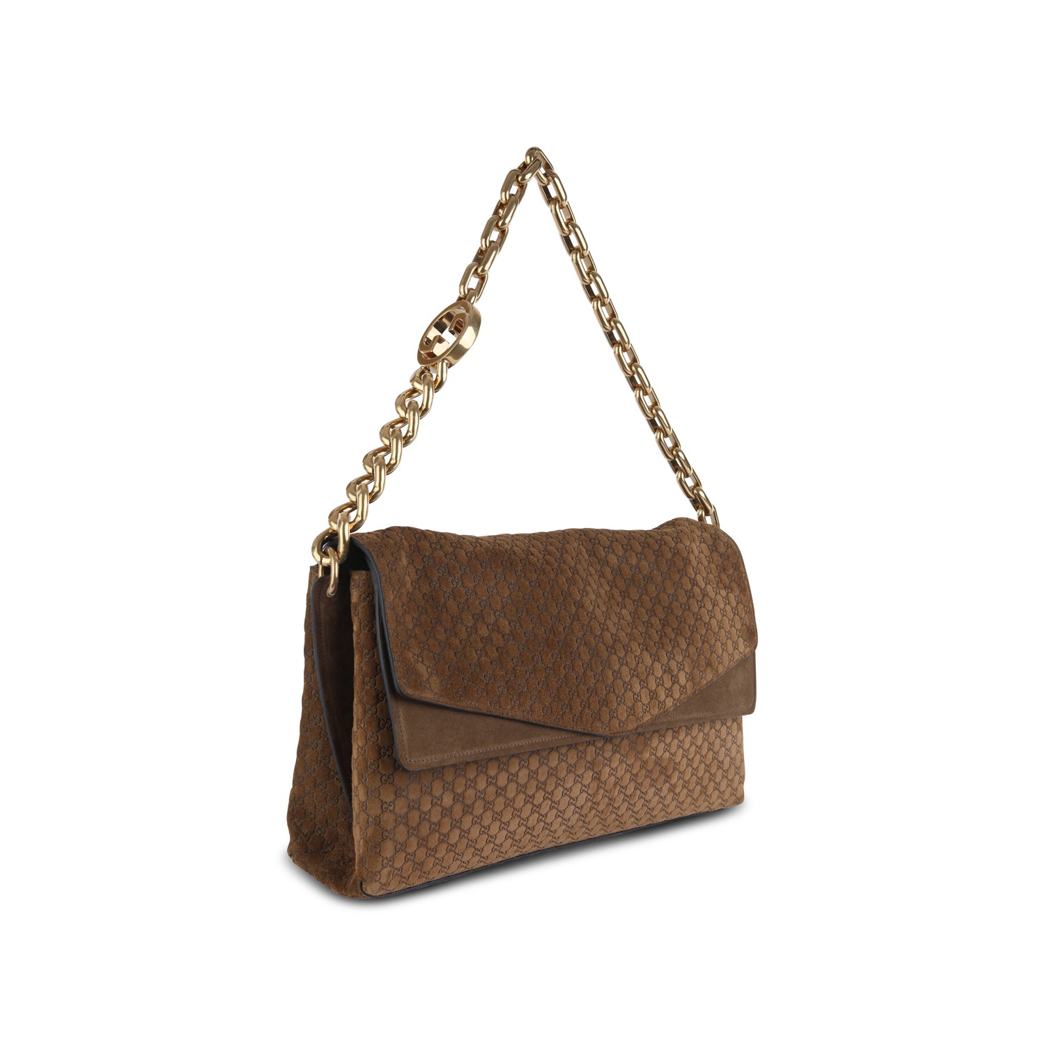 Brown leather shoulder bag from Gucci featuring top handle, main compartment, button fastenign, logo and gold tone hardware.