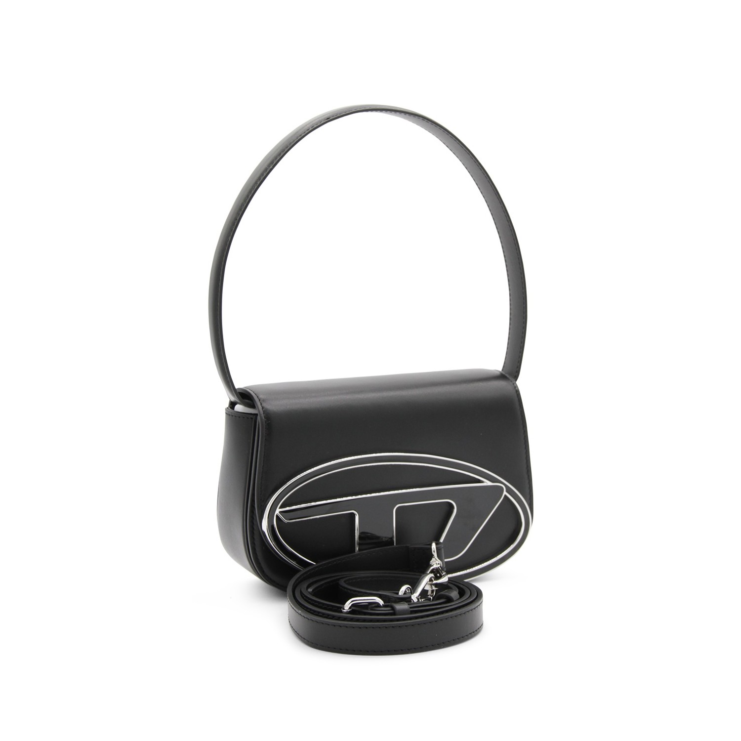 Black leather 1DR shoulder bag from Diesel featuring front logo plaque, foldover top with magnetic fastening, silver-tone hardware, detachable shoulder strap, internal logo patch, partitioned compartment and single rounded top handle.