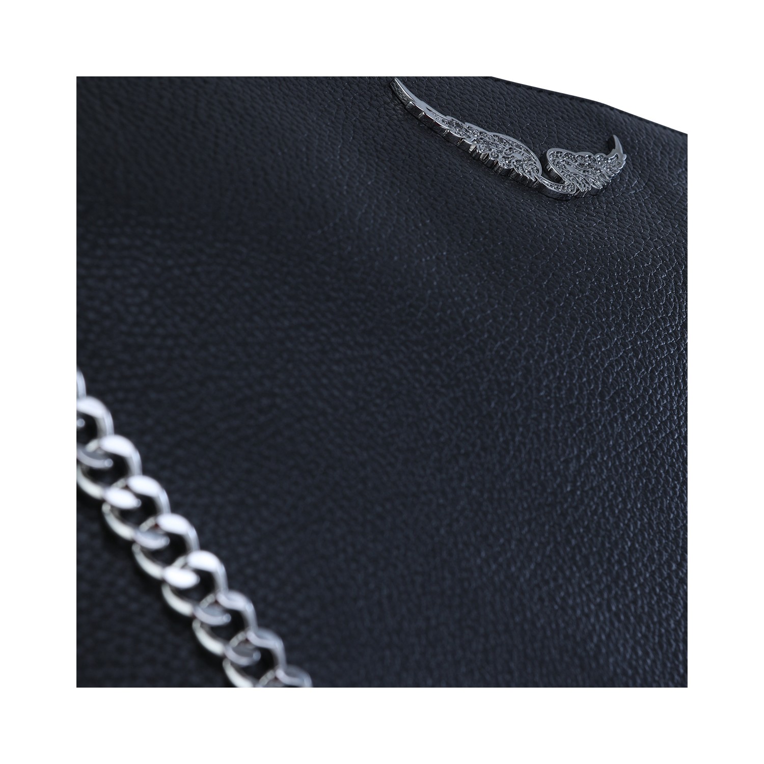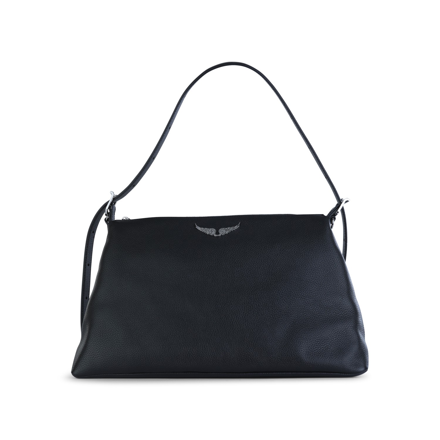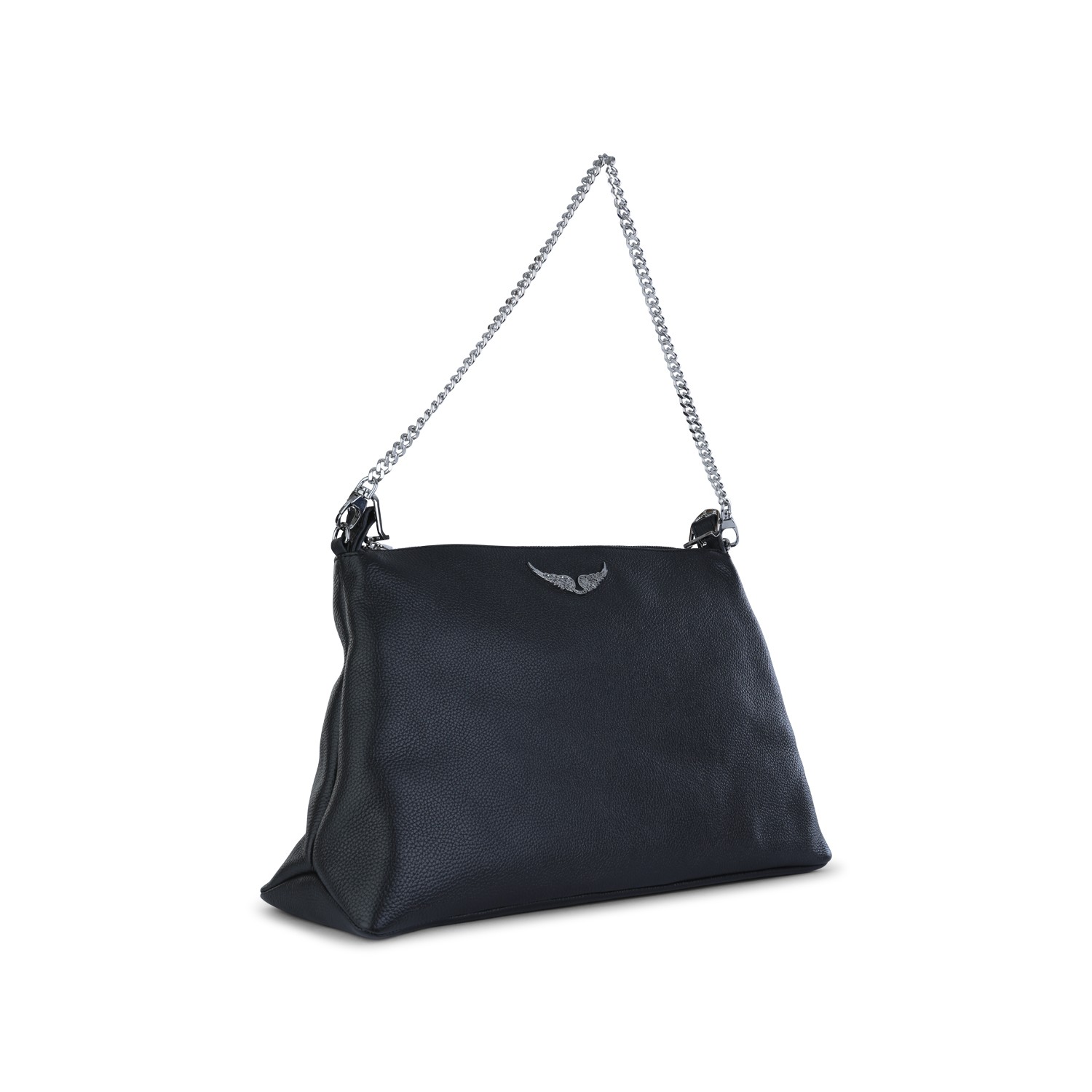 Black Jim grained leather shoulder bag from Zadig & Voltaire featuring asjustable strap, silver tone hardware, frontal logo plaque, zip fastening, removable chain and main compartment.