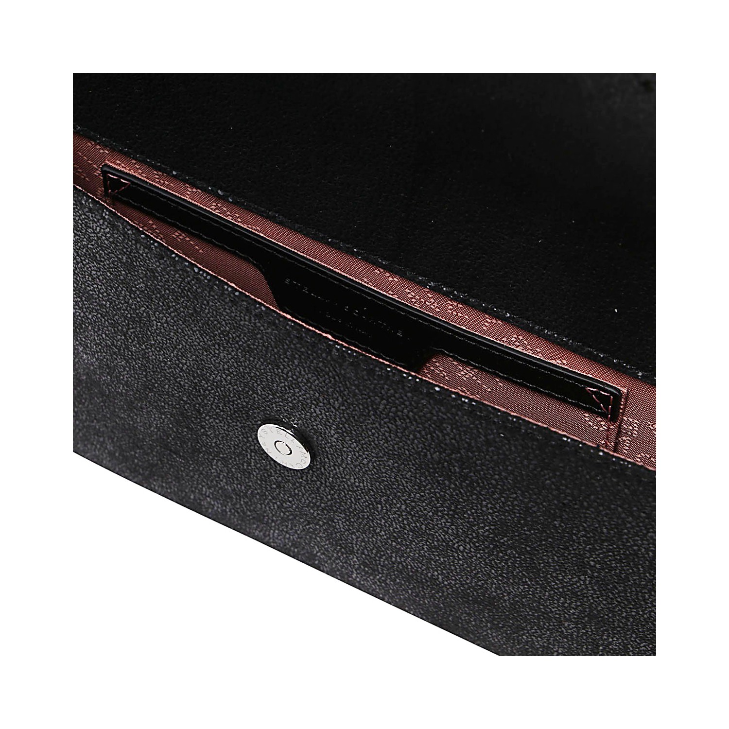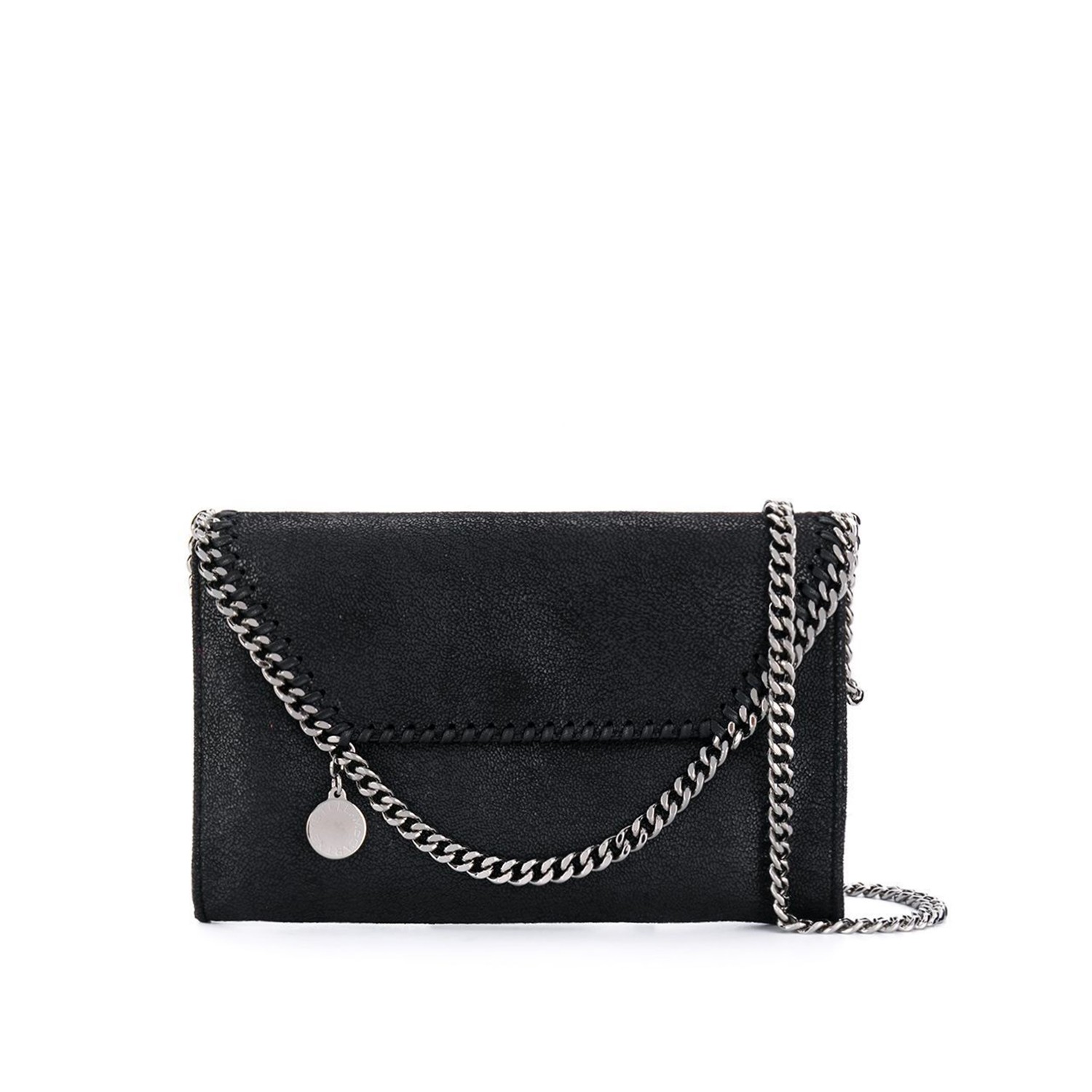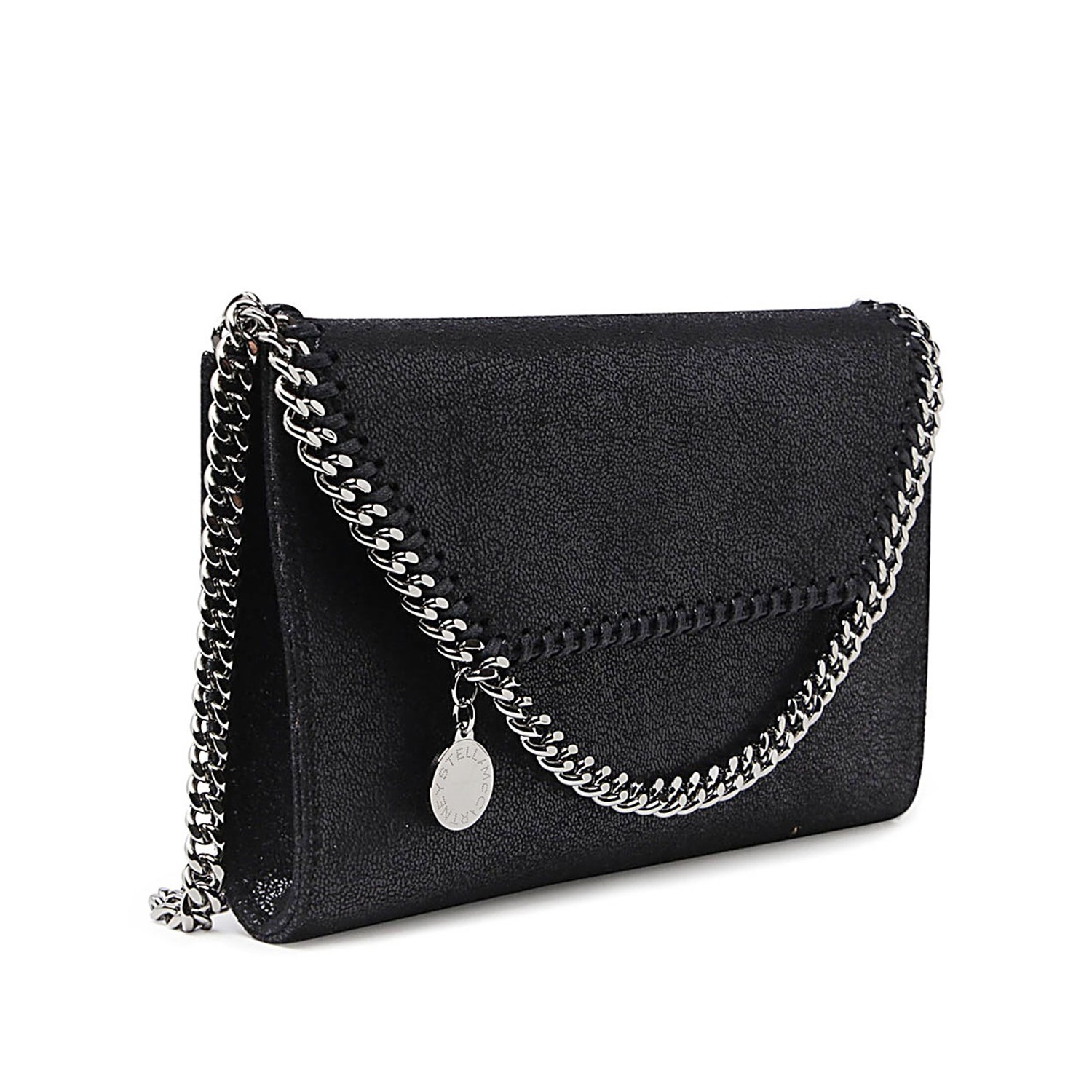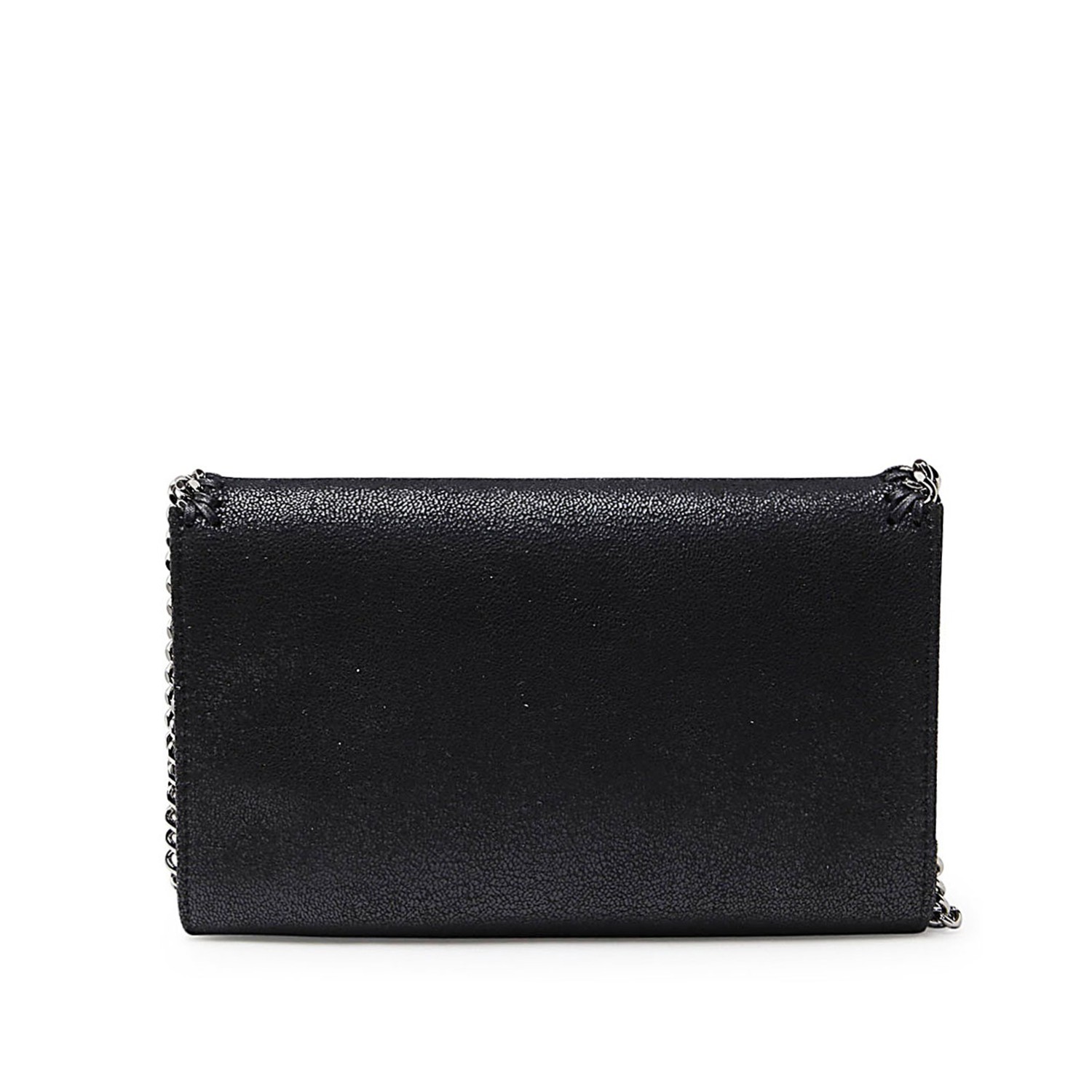 Black faux leather Falabella bag featuring front closure, chain strap, pocket and main internal compartment