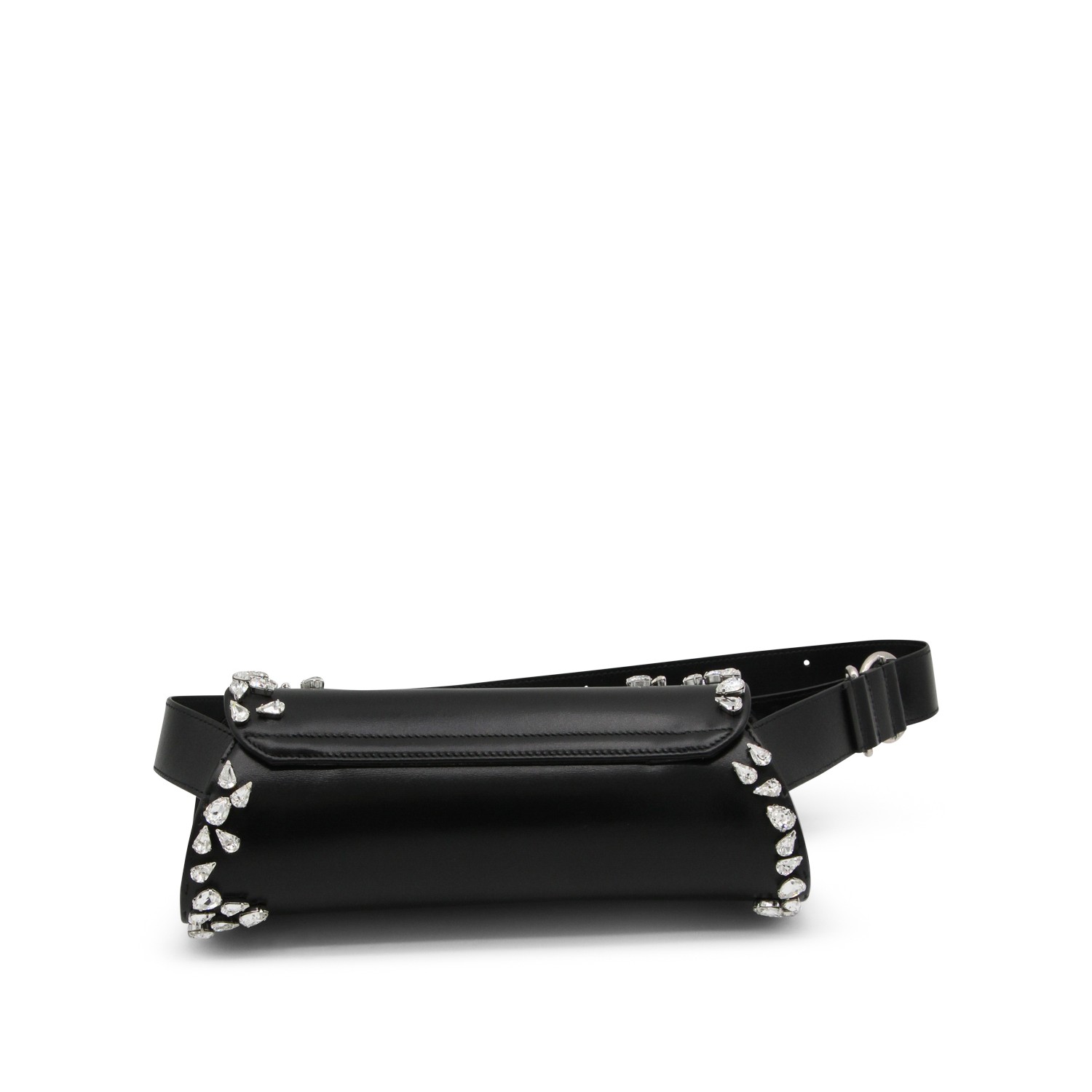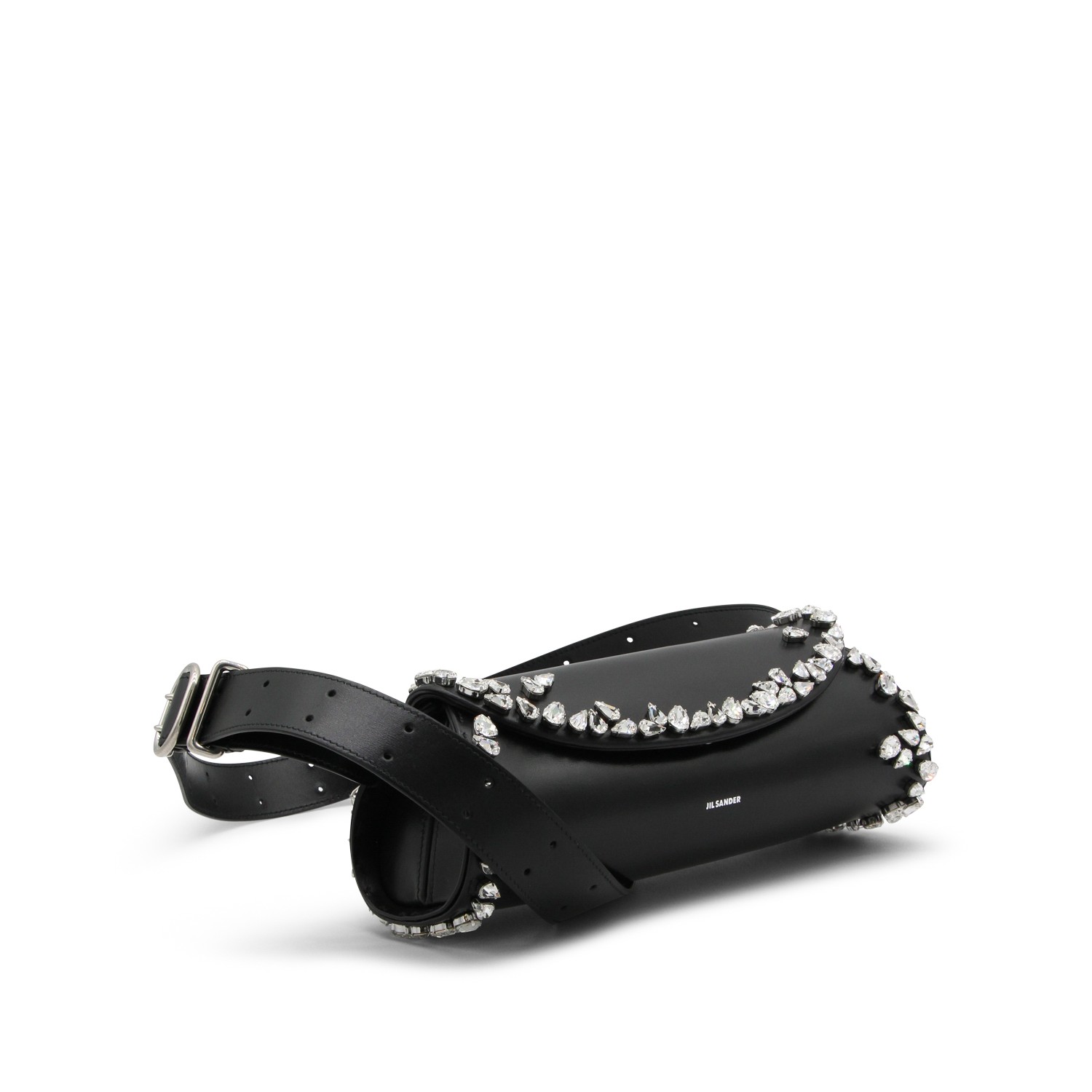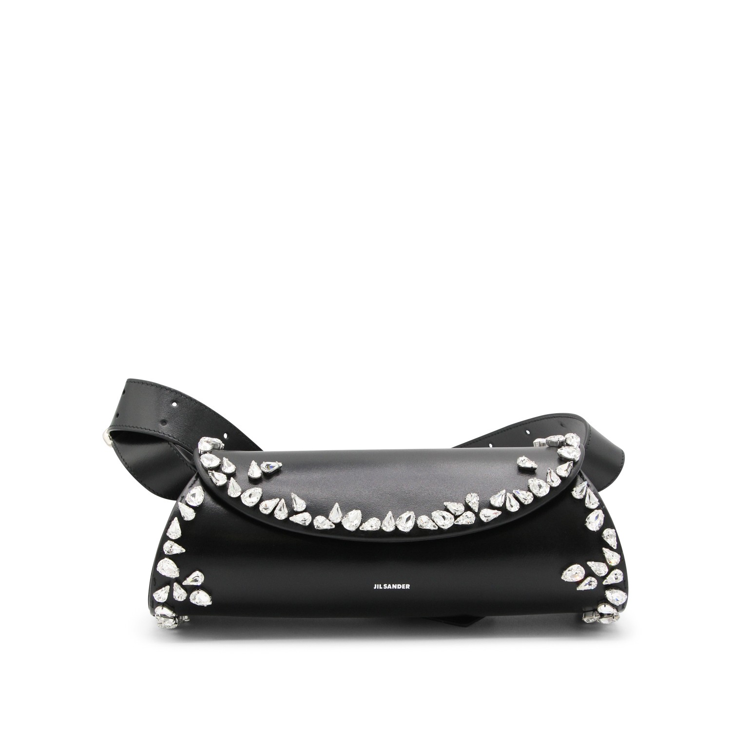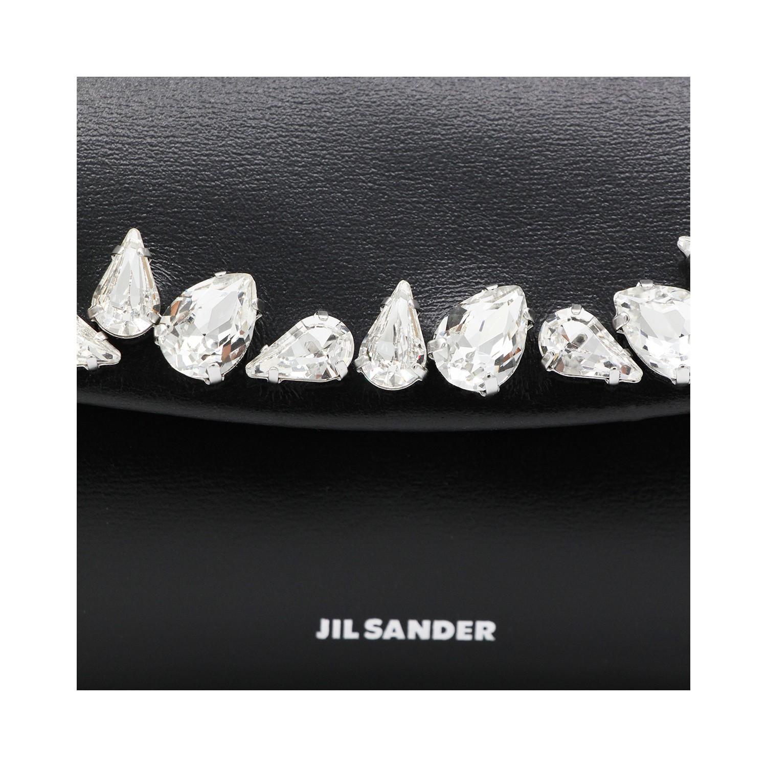 Black Cannolo small crossbody bag from Jil Sander featuring adjustable shoulder strap, crystal applications, embossed logo, magnetic flap closure and main compartment.