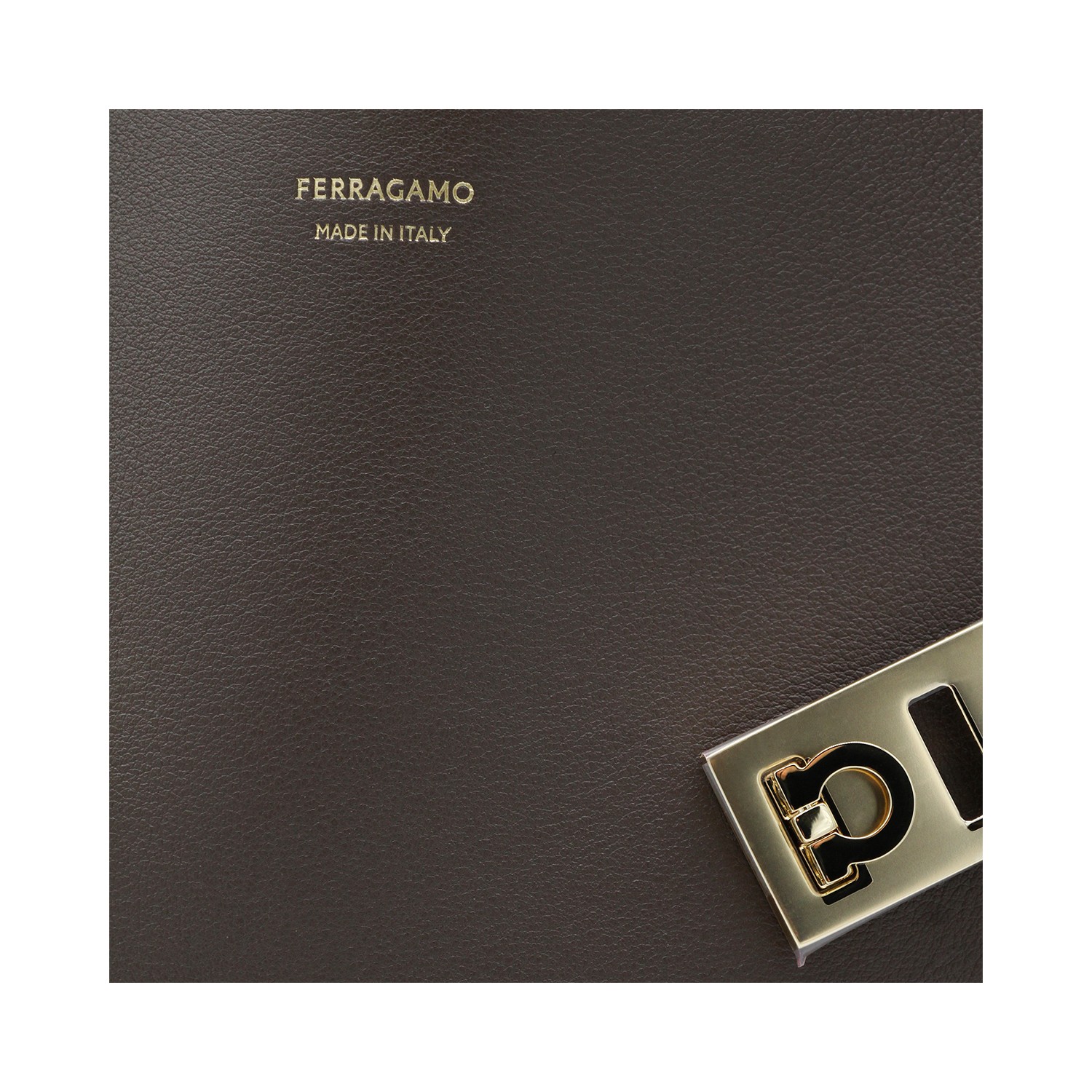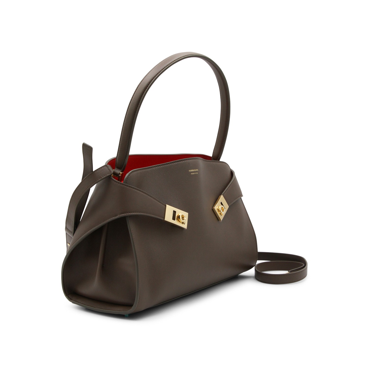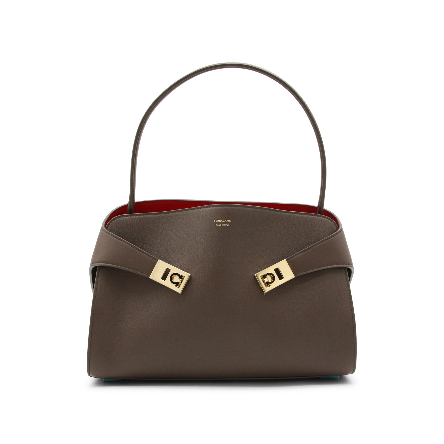 Brown leather Hug S top handle bag from Ferragamo featuring top handle, frontal details, contrasting intern, logo and pocket.