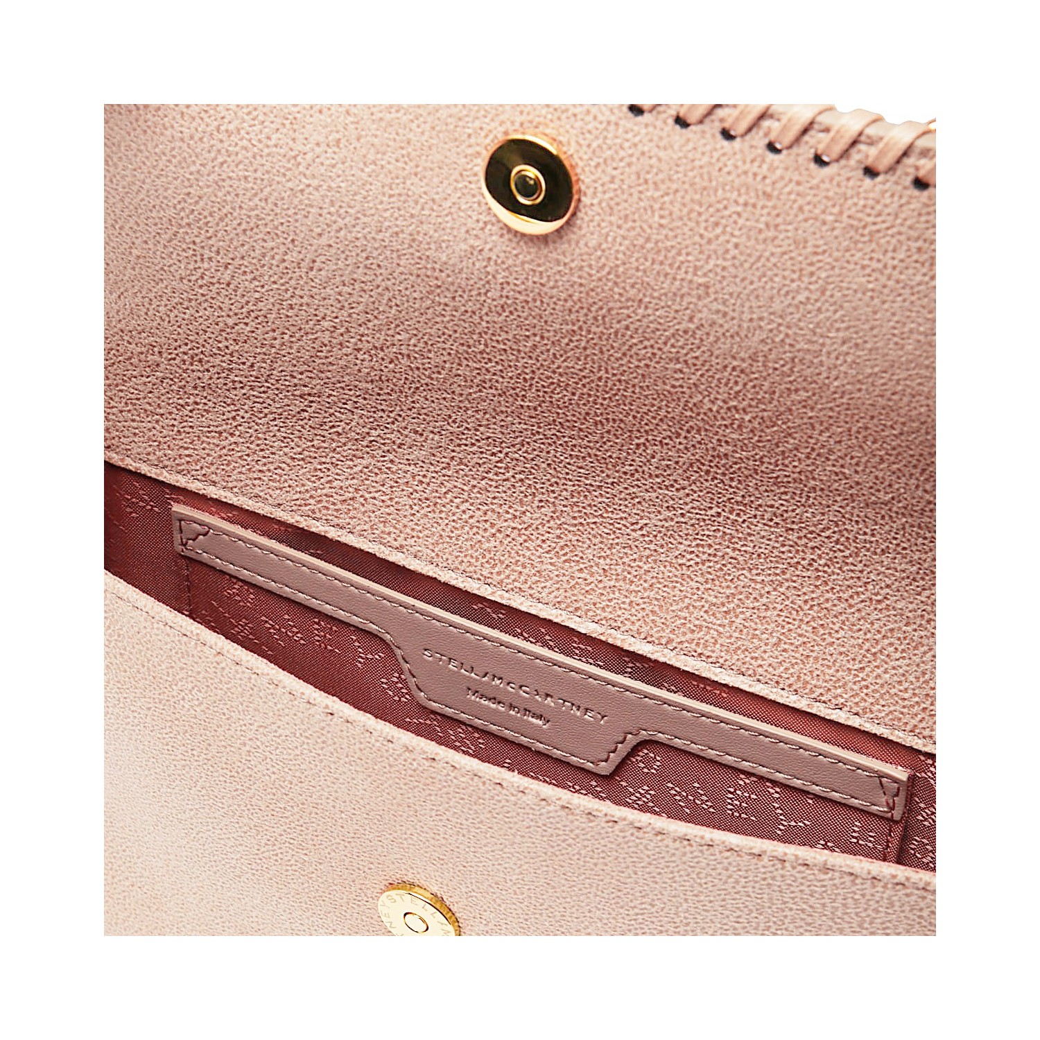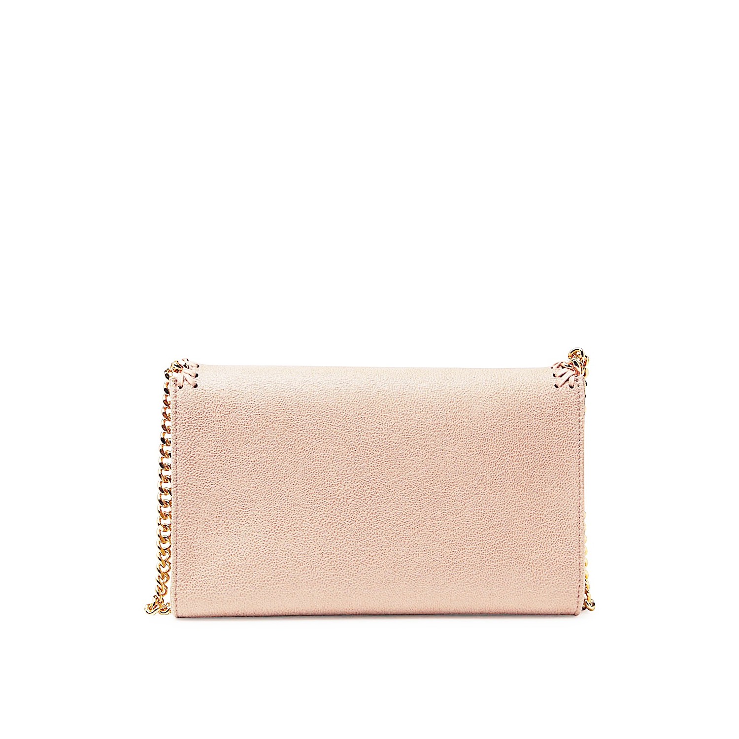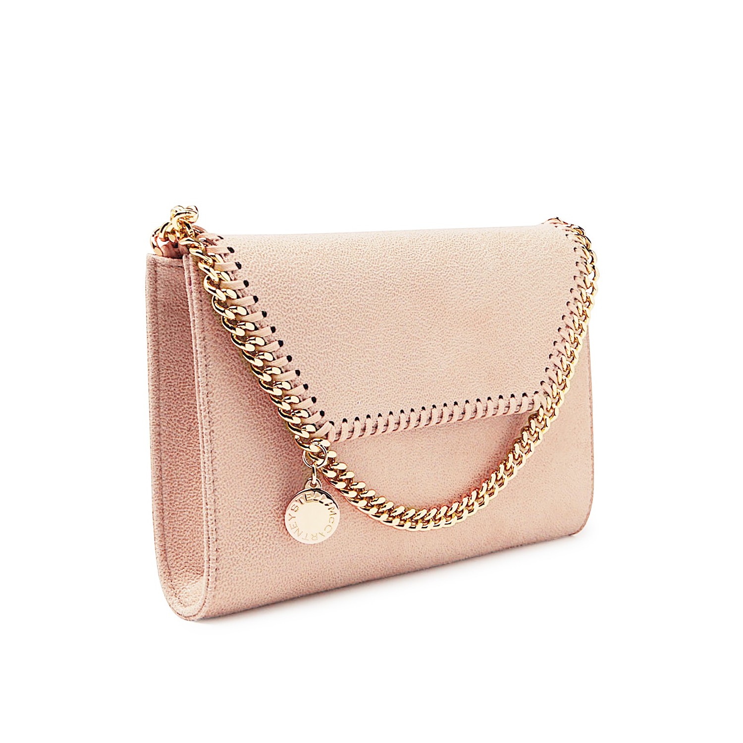 Cream faux leather mini Falabella crossbody bag from Stella McCartney featuring chain-link shoulder strap, front flap closure, whipstitch chain trim and charm detail.