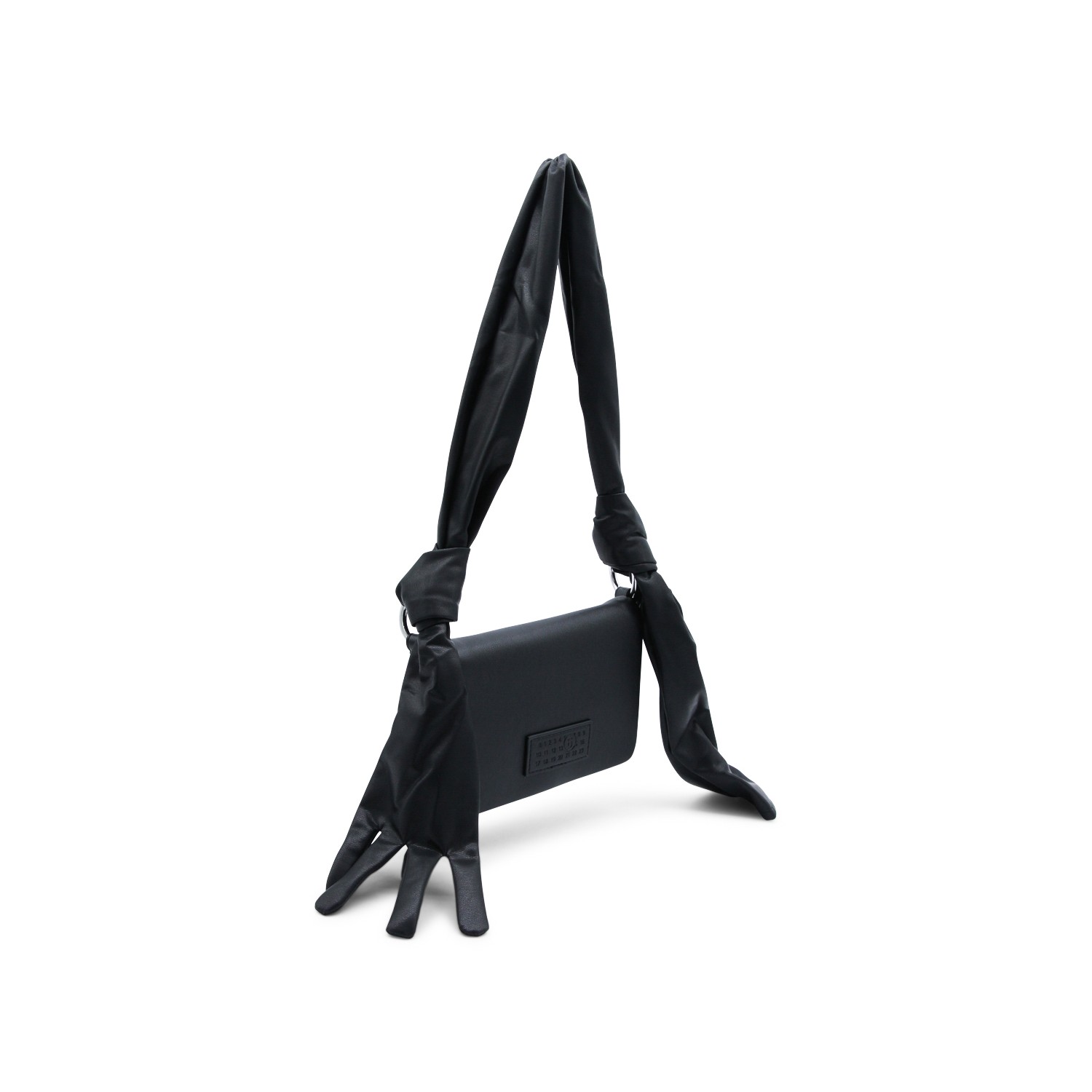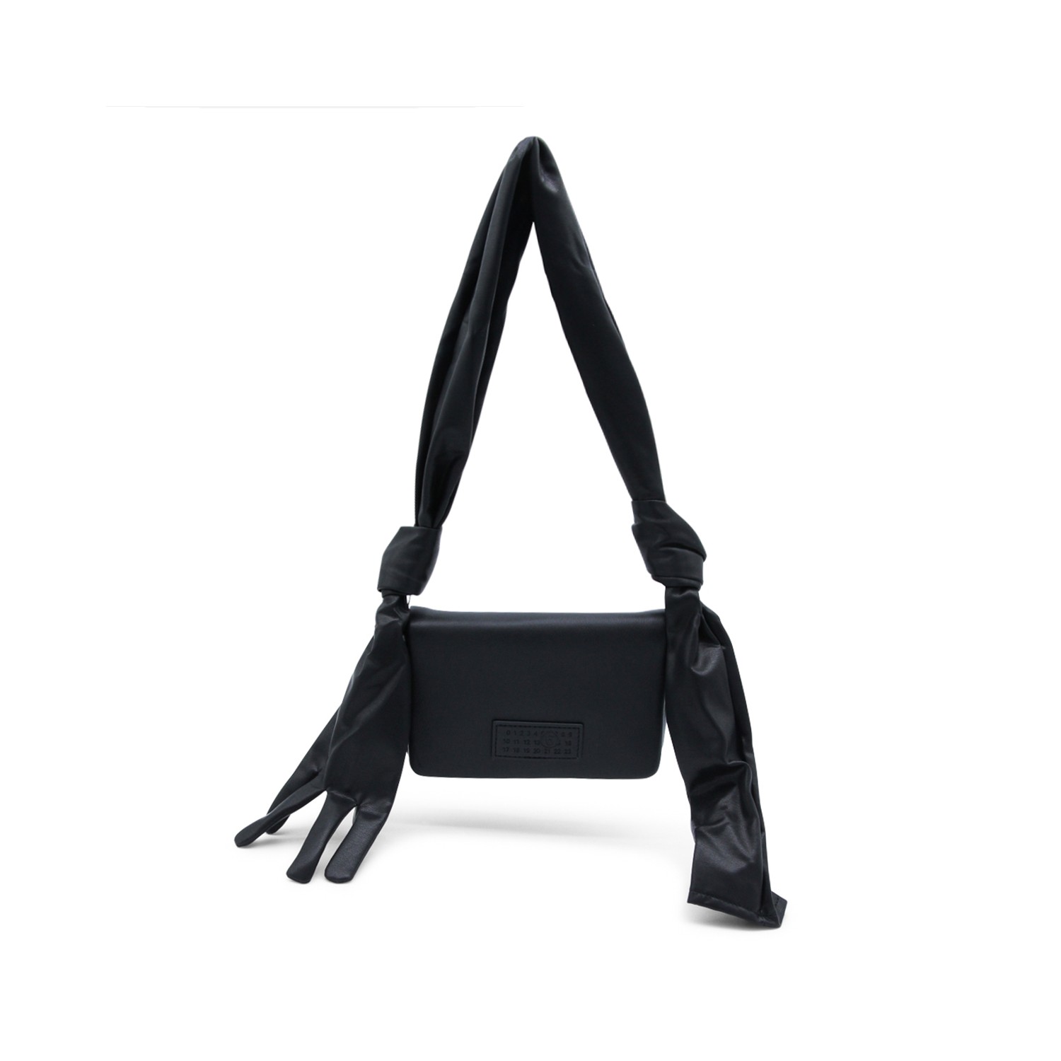 Black leather Glove shoulder bag from MM6 Maison Margiela featuring shoulde strap with knot and glove detail, magnetic closure under the flap, main compartment, frontal logo patch and white stitching on the back.